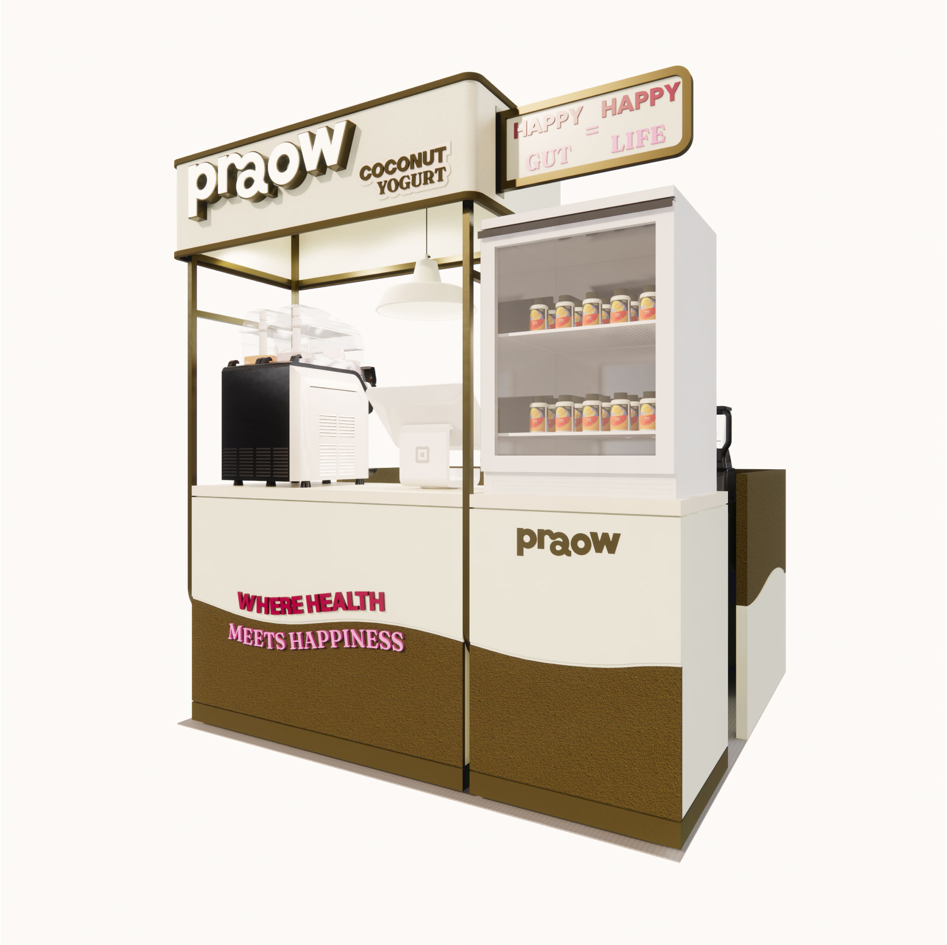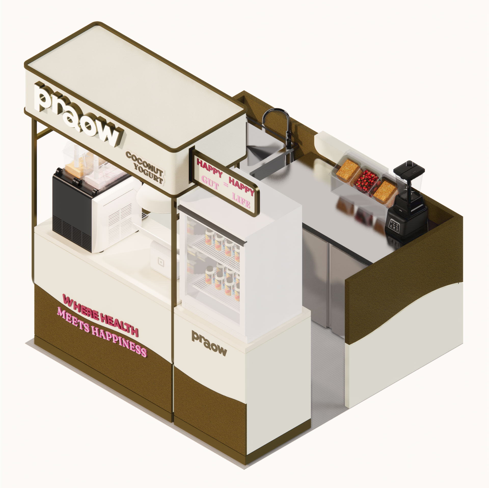 งานออกแบบชุดเคาน์เตอร์ "Praow" สำหรับตั้งในห้าง เหมาะสำหรับตั้งในพื้นที่กึ่งถาวร ชั่วคราว หรือถาวร ออกแบบเป็นเคาน์เตอร์หลัก เน้นเฟอร์นิเจอร์ที่วางต่อชิ้นกันได้ พื้นที่ด้านหลังร้านเป็นแผงพาร์ติชั่นทรงตัวยู ที่สามารถพับเก็บได้ เพื่อความสะดวกในการขนย้าย หรือพาร์ติชั่นข้างหลังสามารถสั่งผลิตเพิ่มขนาดตามพื้นที่นั้นๆ ได้