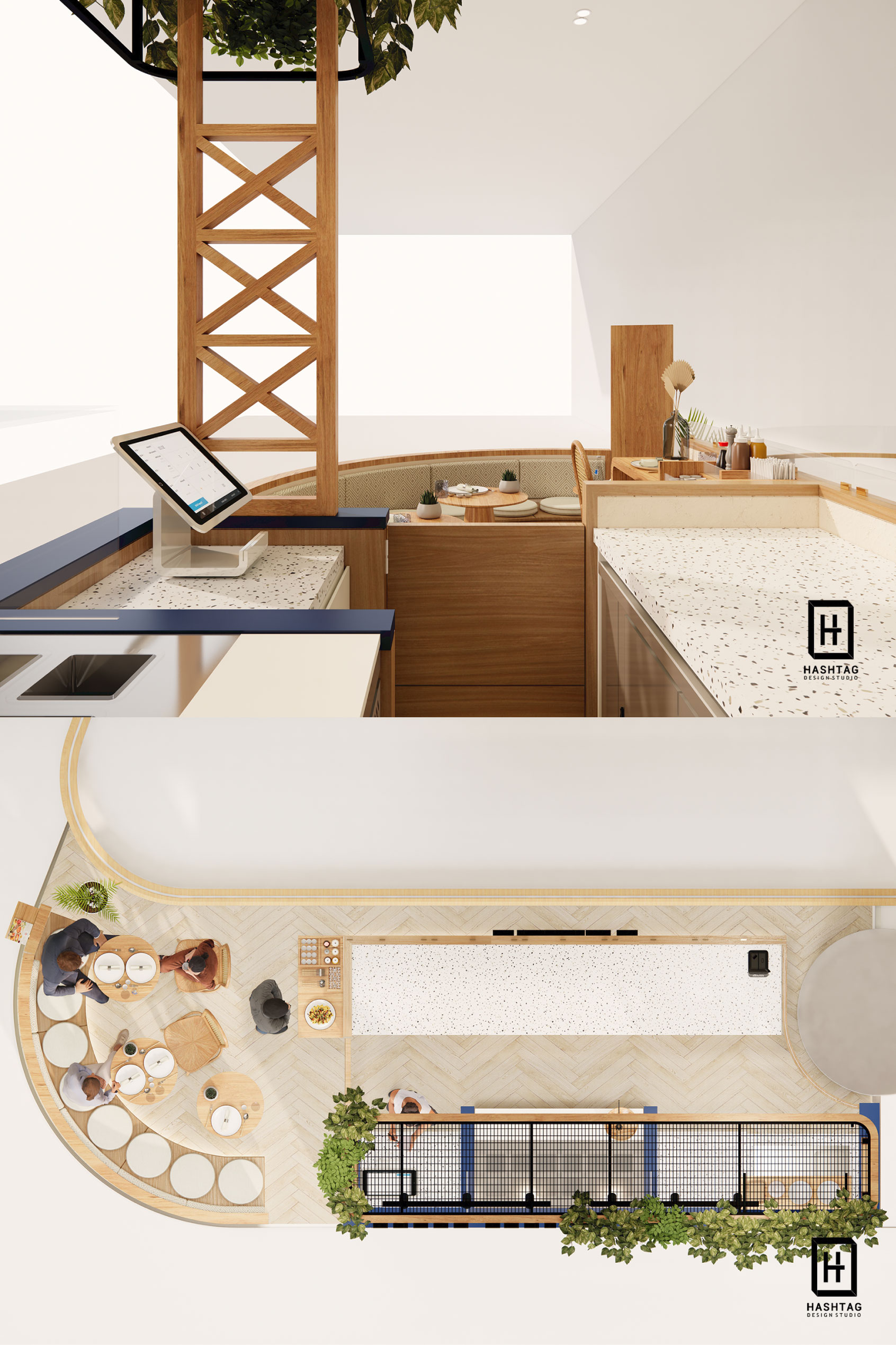 ส่วนนั่งรับประทานอาหารของลูกค้า ออกแบบเป็นทรงโค้ง ให้รองรับกับพื้นที่ของลูกค้า ตกแต่งด้วยหวายสานและผนักพิงผ้าโทนสีครีมลวดลายเป็นเอกลักษณ์เพิ่มความน่าสนใจให้ร้านมากยิ่งขึ้น เพิ่มฟังก์ชั่นใต้ที่นั่งเป็นช่องสำหรับเก็บสต็อคสินค้าได้