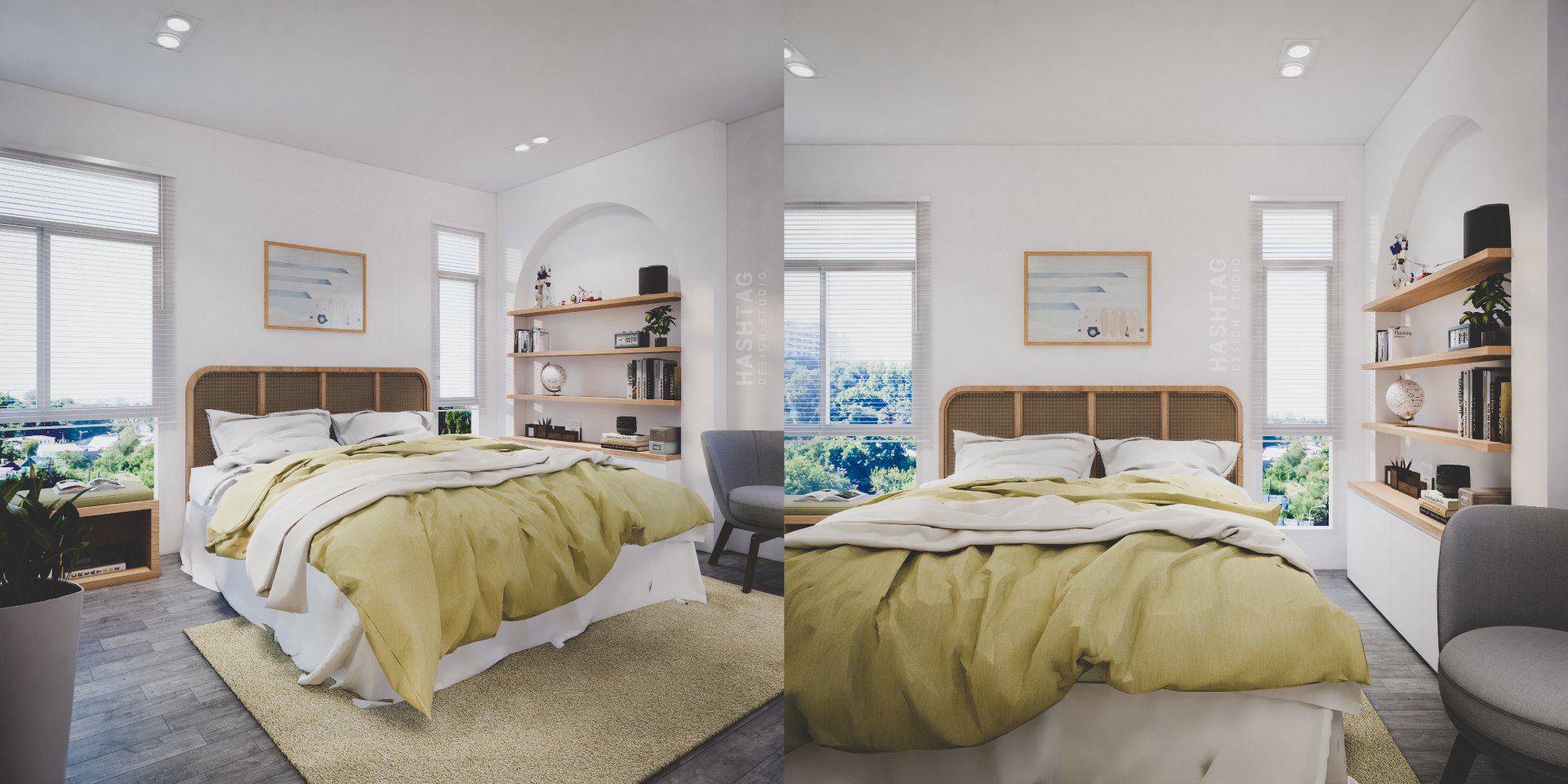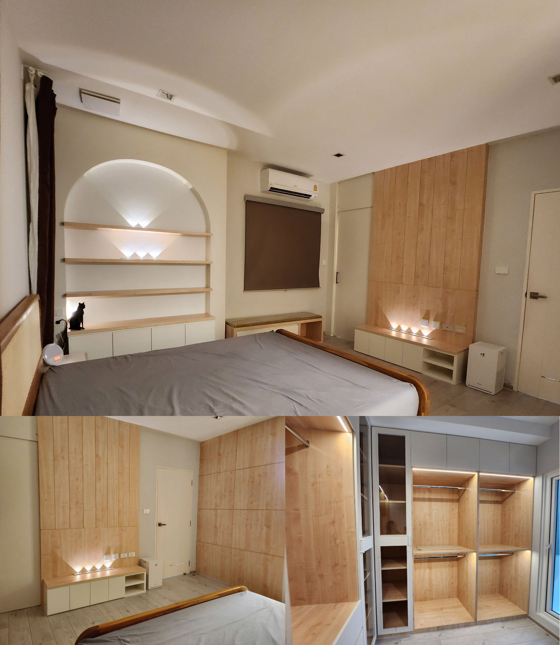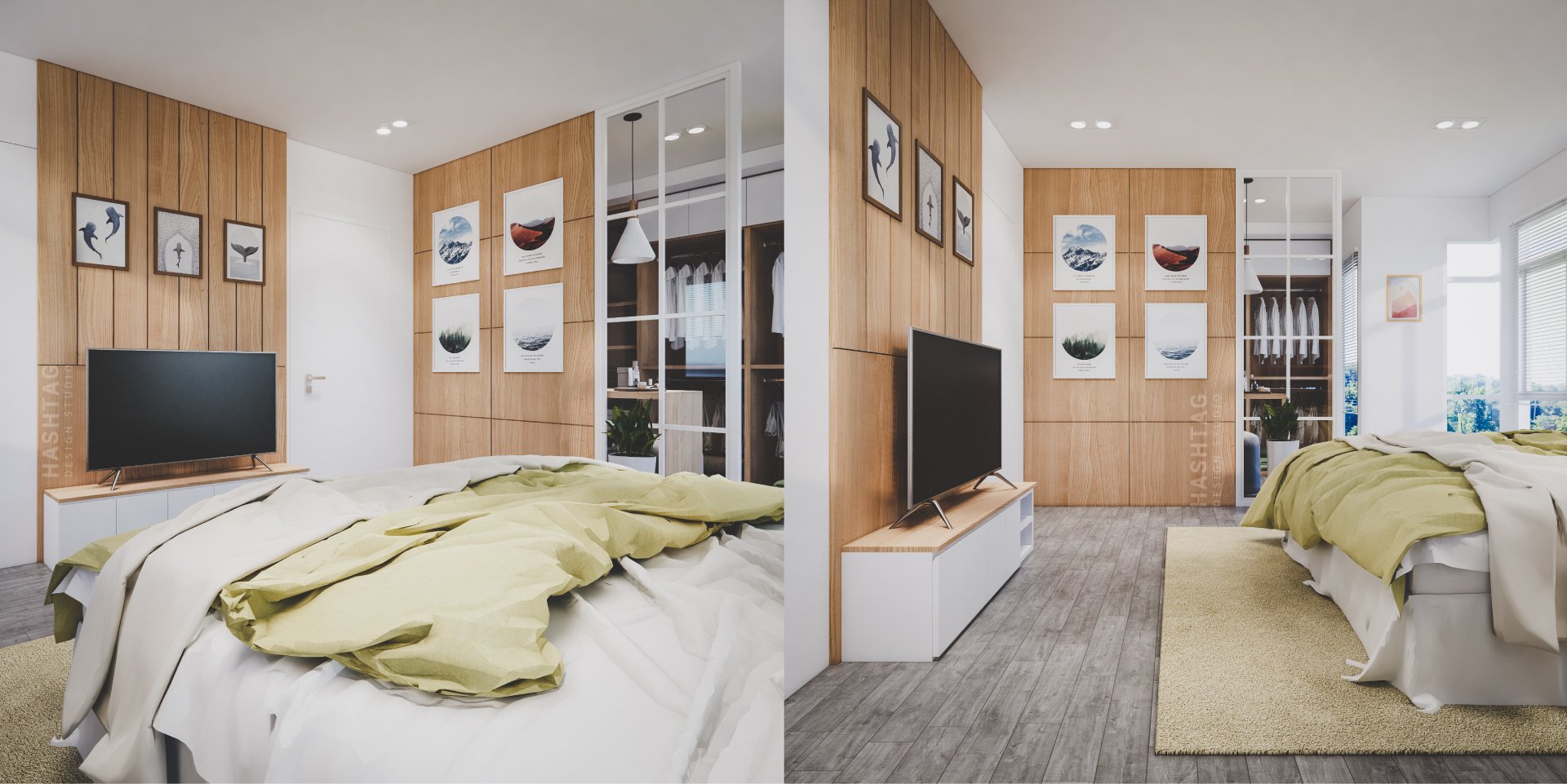 งานออกแบบภายในห้อง Master Bedroom ออกแบบให้มีความเรียบง่าย โล่ง โปร่ง ตามความชอบของผู้อยู่อาศัย ออกแบบให้มีพื้นที่ห้องนอนพร้อมกั้นผนังบังตาเชื่อมเป็นโซนห้องแต่งตัว