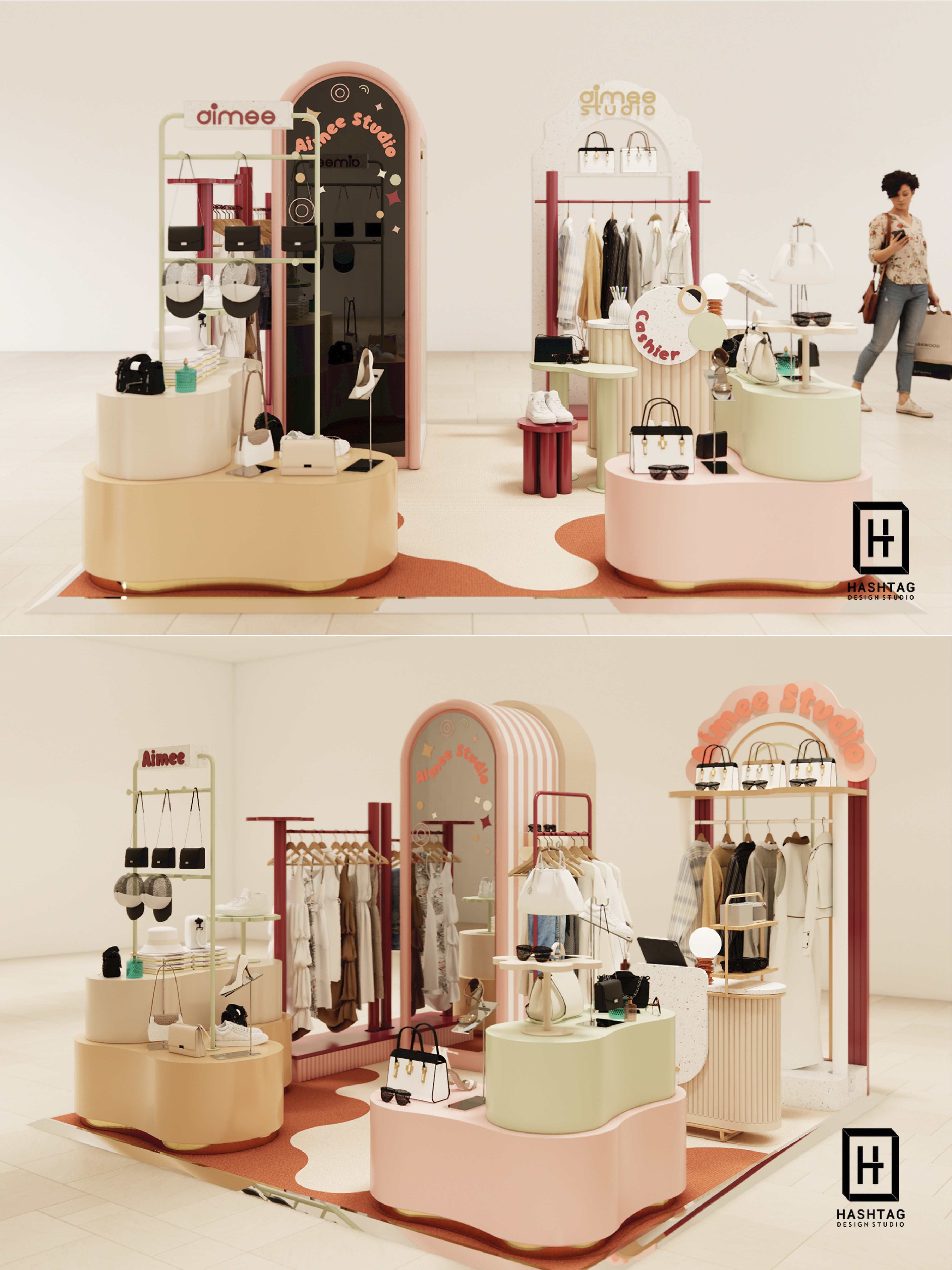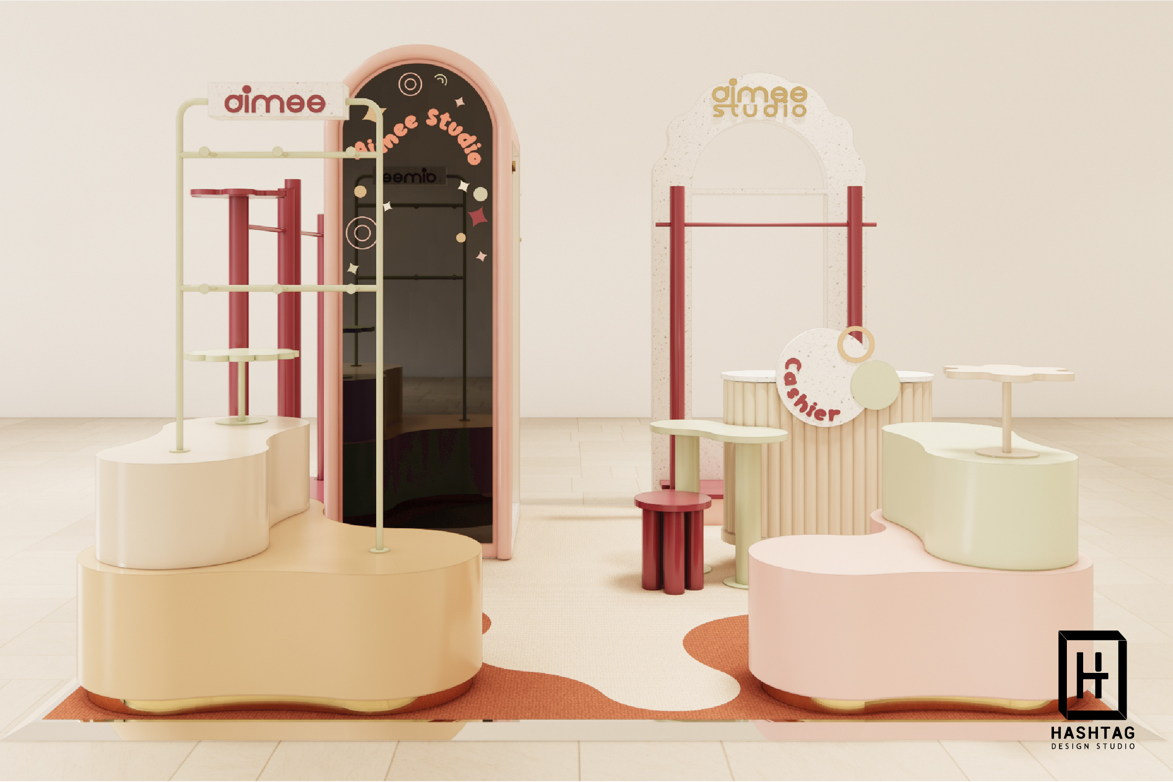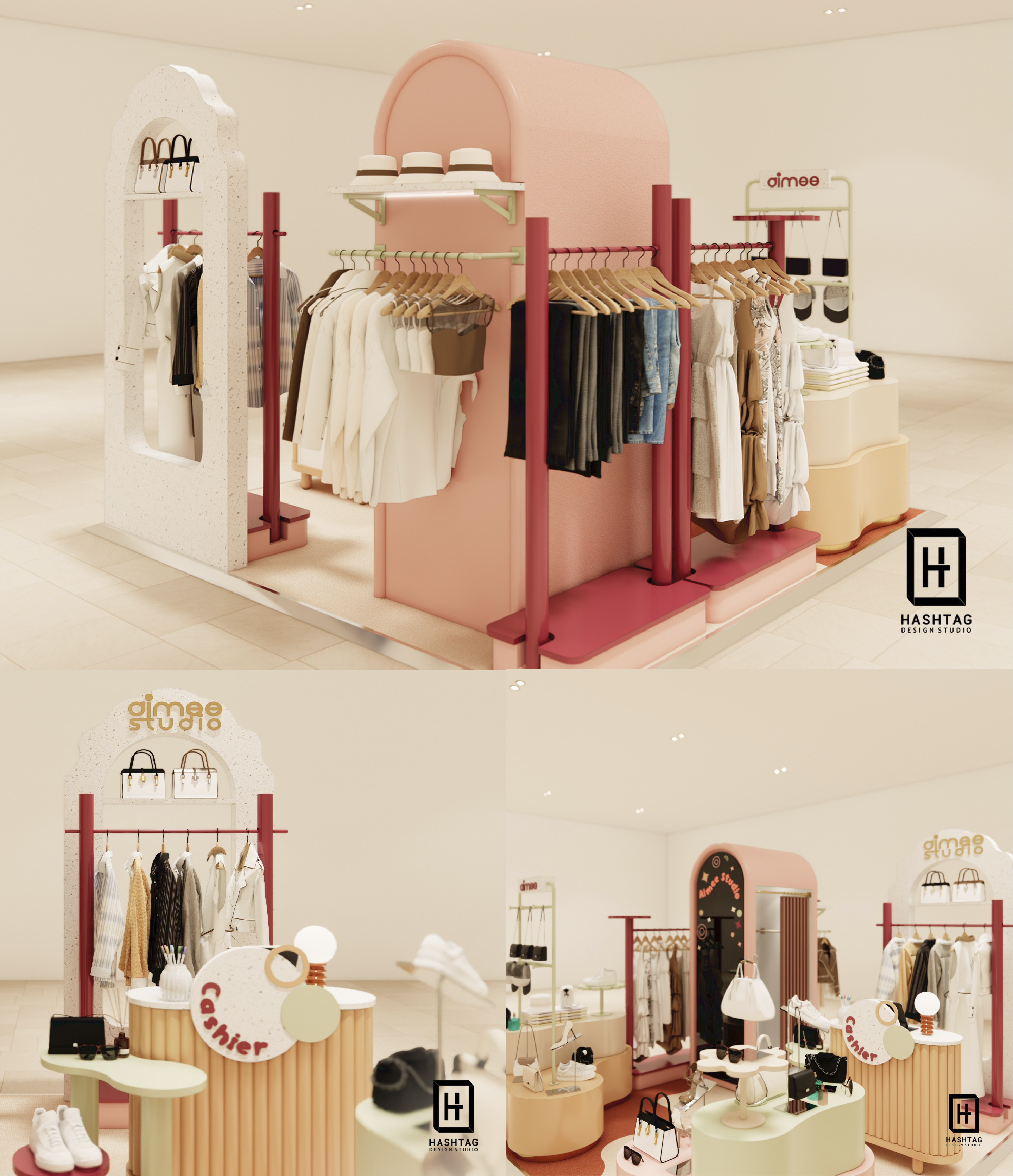 ภาพงานออกแบบร้านค้าเพื่อนำเสนอห้าง Pop Up Store "Aimee Studio" ร้านขายสินค้า Multi Brand ออกแบบจัดวางเฟอร์นิเจอร์ให้สามารถปรับการจัดวางสินค้าได้หลากหลายประเภท และสามารถปรับเปลี่ยนเลเอาท์การจัดวางได้ทุกพื้นที่