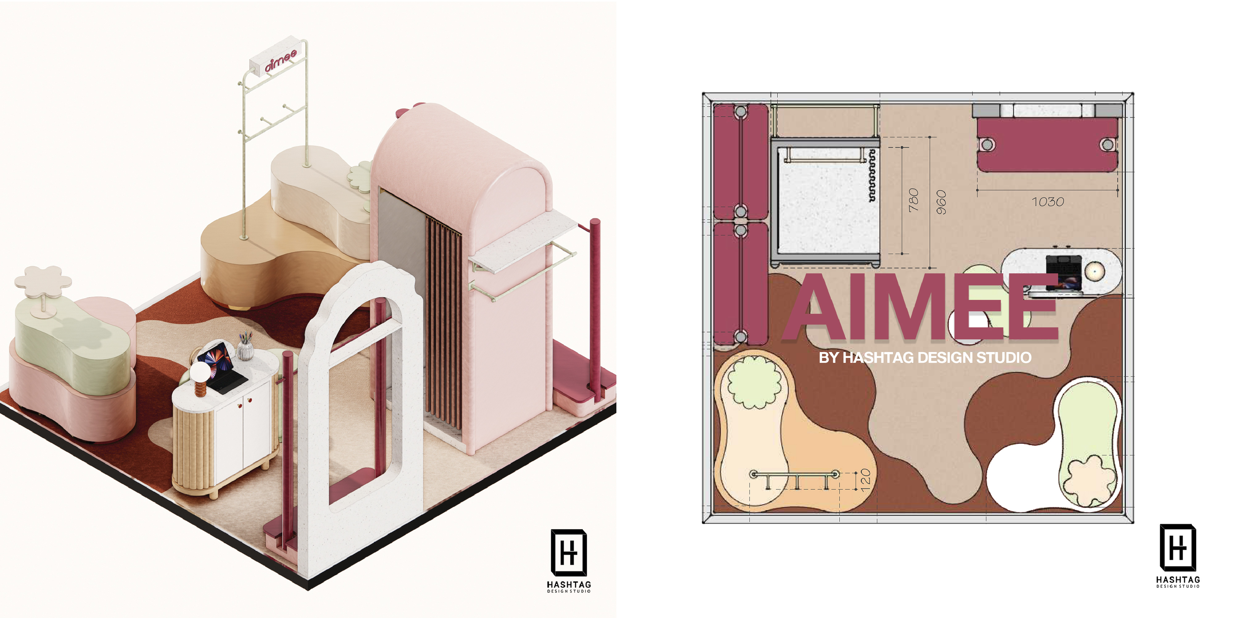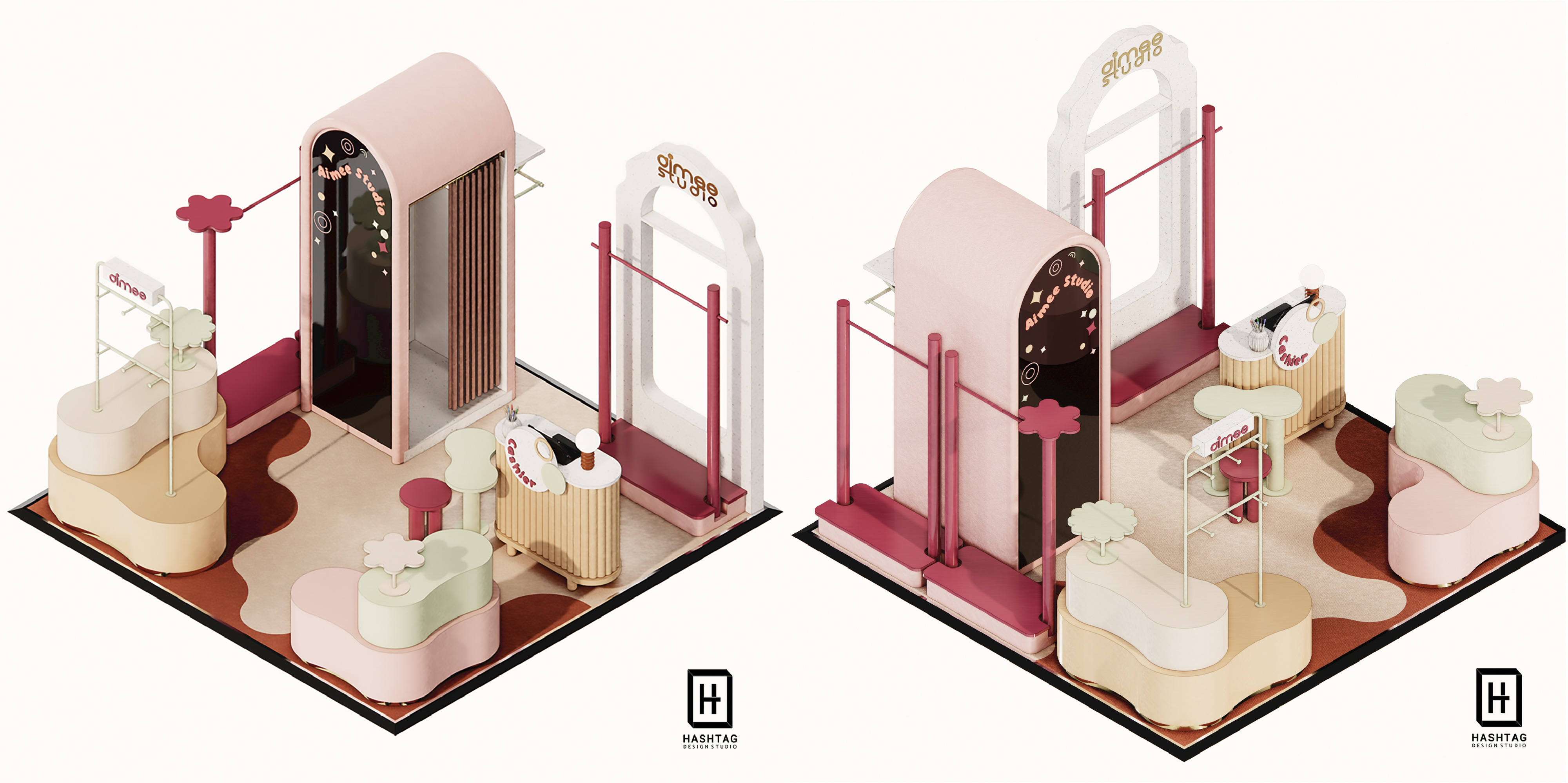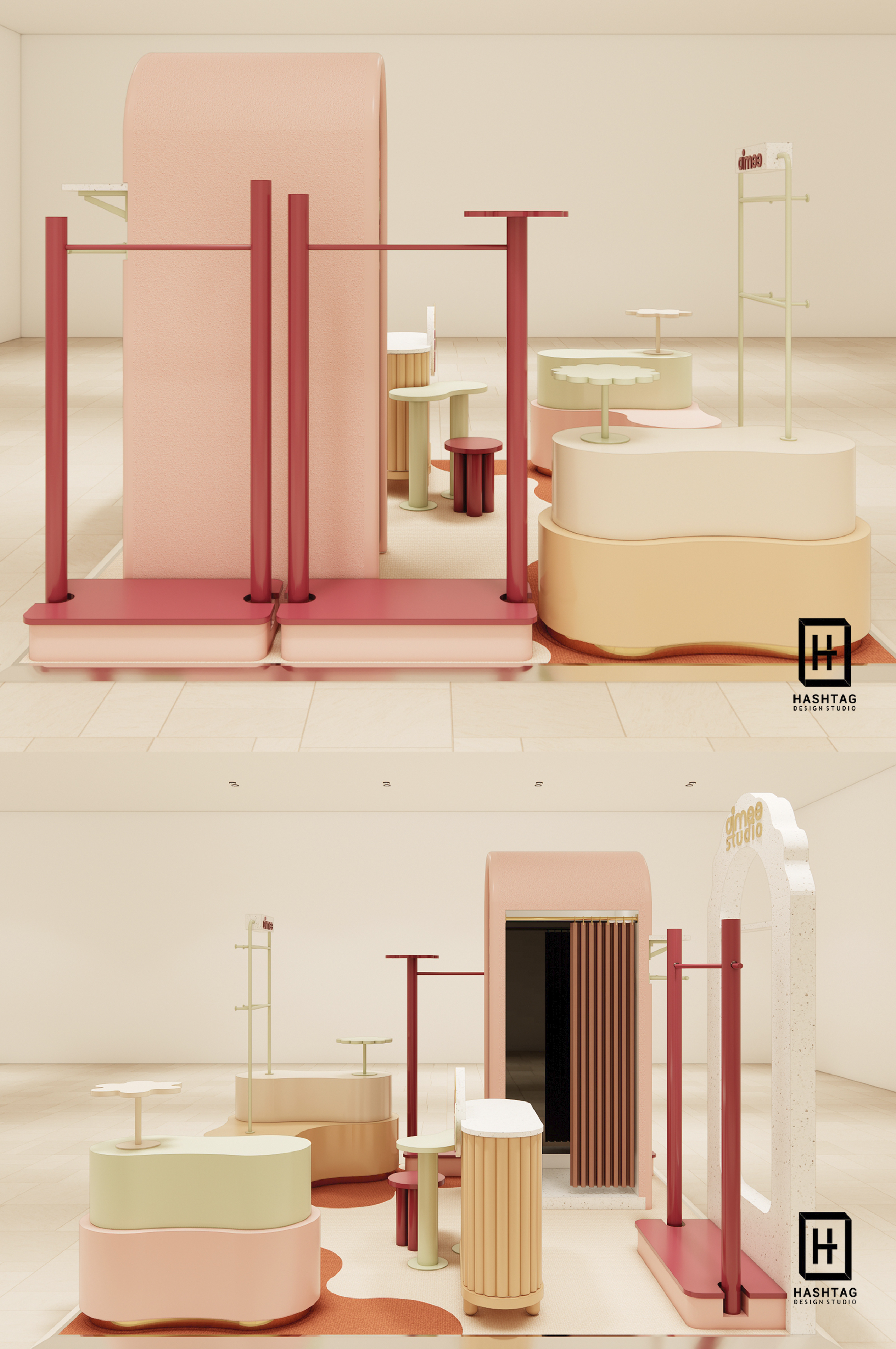 ภาพงานออกแบบร้านค้าเพื่อนำเสนอห้าง Pop Up Store "Aimee Studio" ร้านขายสินค้า Multi Brand ออกแบบจัดวางเฟอร์นิเจอร์ให้สามารถปรับการจัดวางสินค้าได้หลากหลายประเภท และสามารถปรับเปลี่ยนเลเอาท์การจัดวางได้ทุกพื้นที่