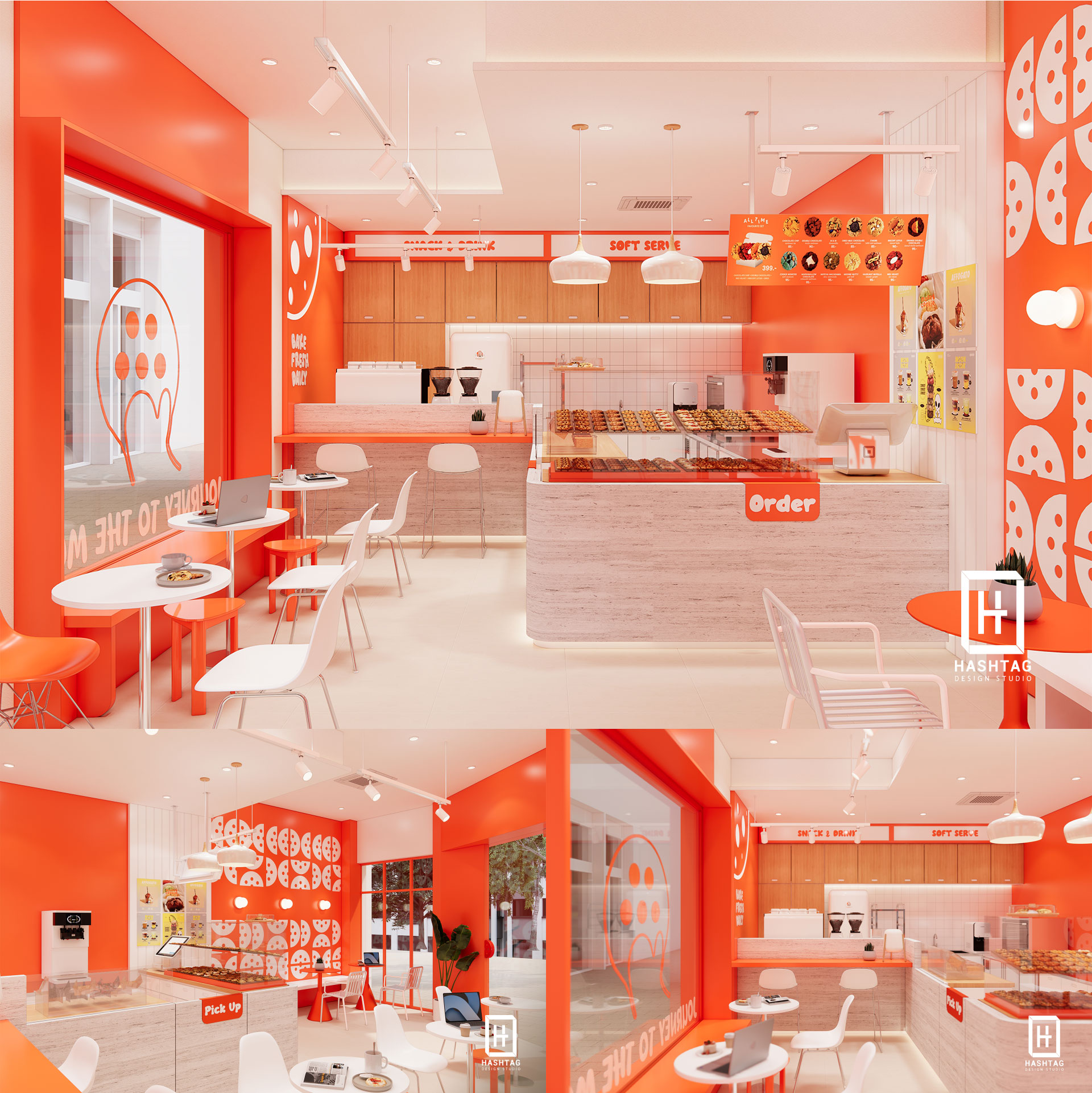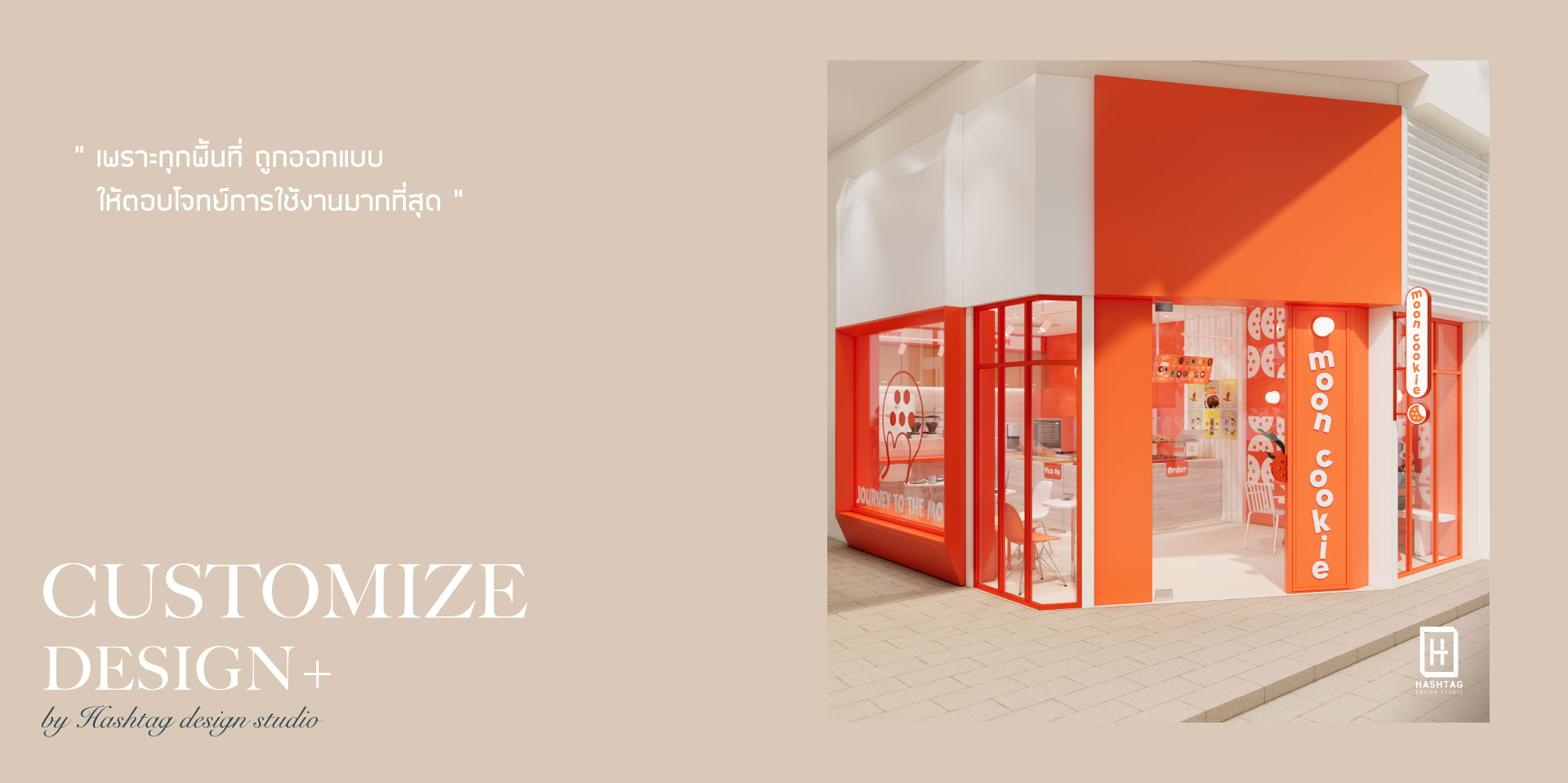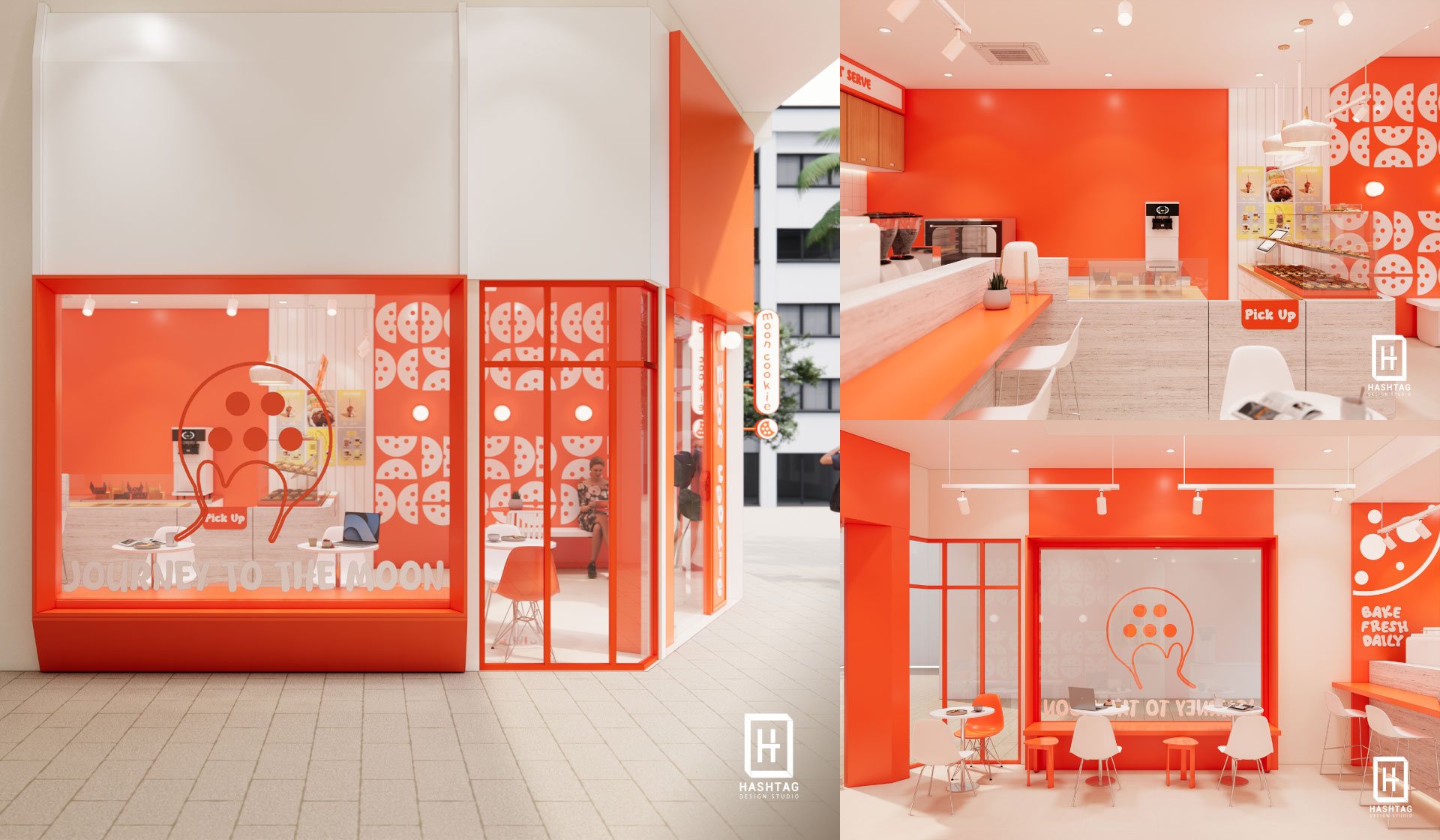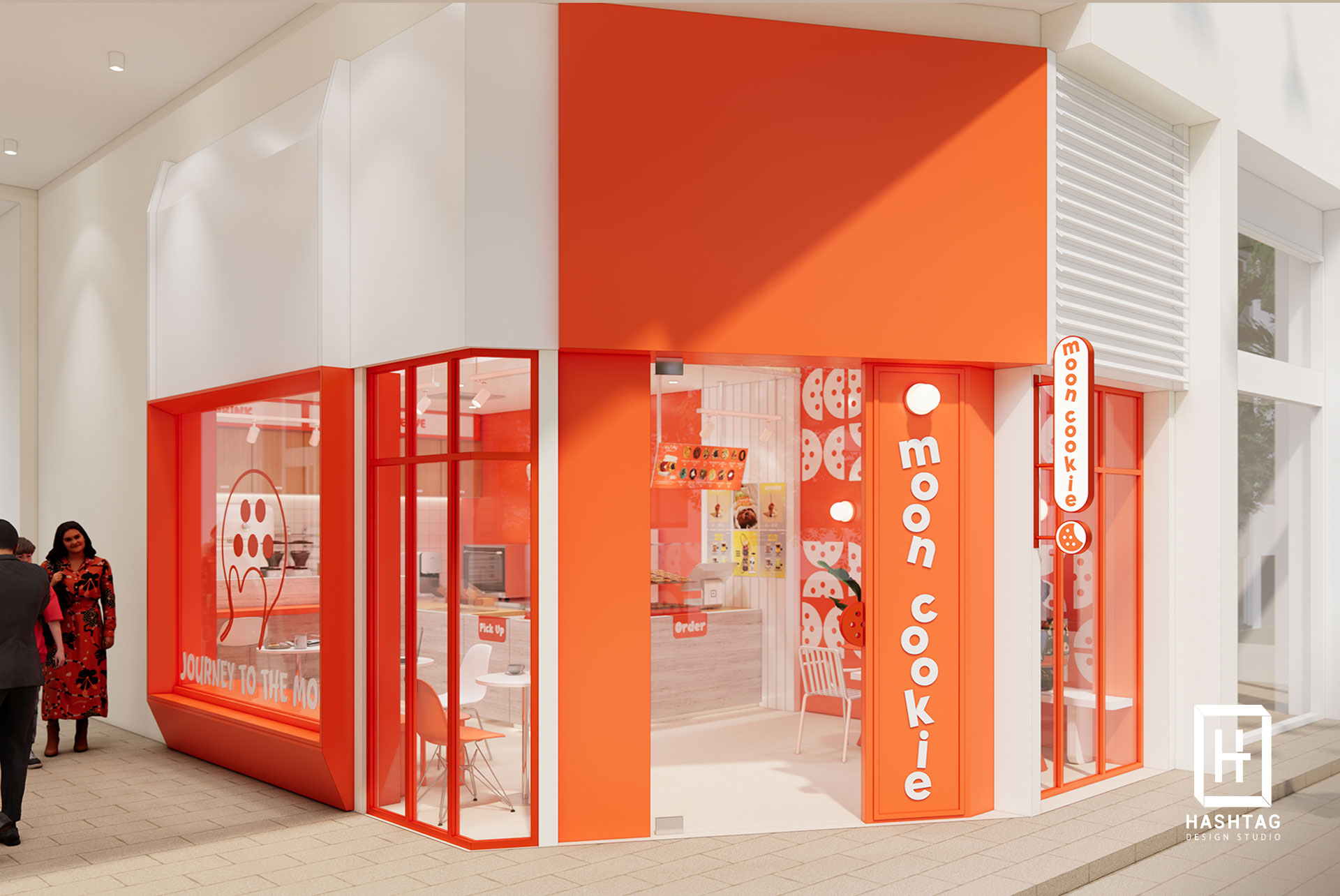 ภาพงานออกแบบร้าน "Moon Cookie" ร้านขายคุกกี้และกาแฟ ออกแบบเป็นเคาน์เตอร์สำหรับวางชั้นคุกกี้เพื่อให้ลูกค้าหยิบเลือกได้เอง เคาน์เตอร์ด้านข้างแบ่งเป็นเคาน์เตอร์สำหรับรับขนมเครื่องดื่ม เพื่อนั่งทานในร้าน และแบ่งเป็นเคาน์เตอร์สำหรับวางเครื่องทำกาแฟ ด้านหลังเคาน์เตอร์เป็นโซนประกอบอาหารและมีตู้สำหรับเก็บของเพื่อความเป็นระเบียบ ภายนอกออกแบบเป็นซุ้มประตูหน้าต่าง ตกแต่งด้วยโลโก้ร้านสีส้มตัดกับสีขาวเพื่อความโดดเด่น