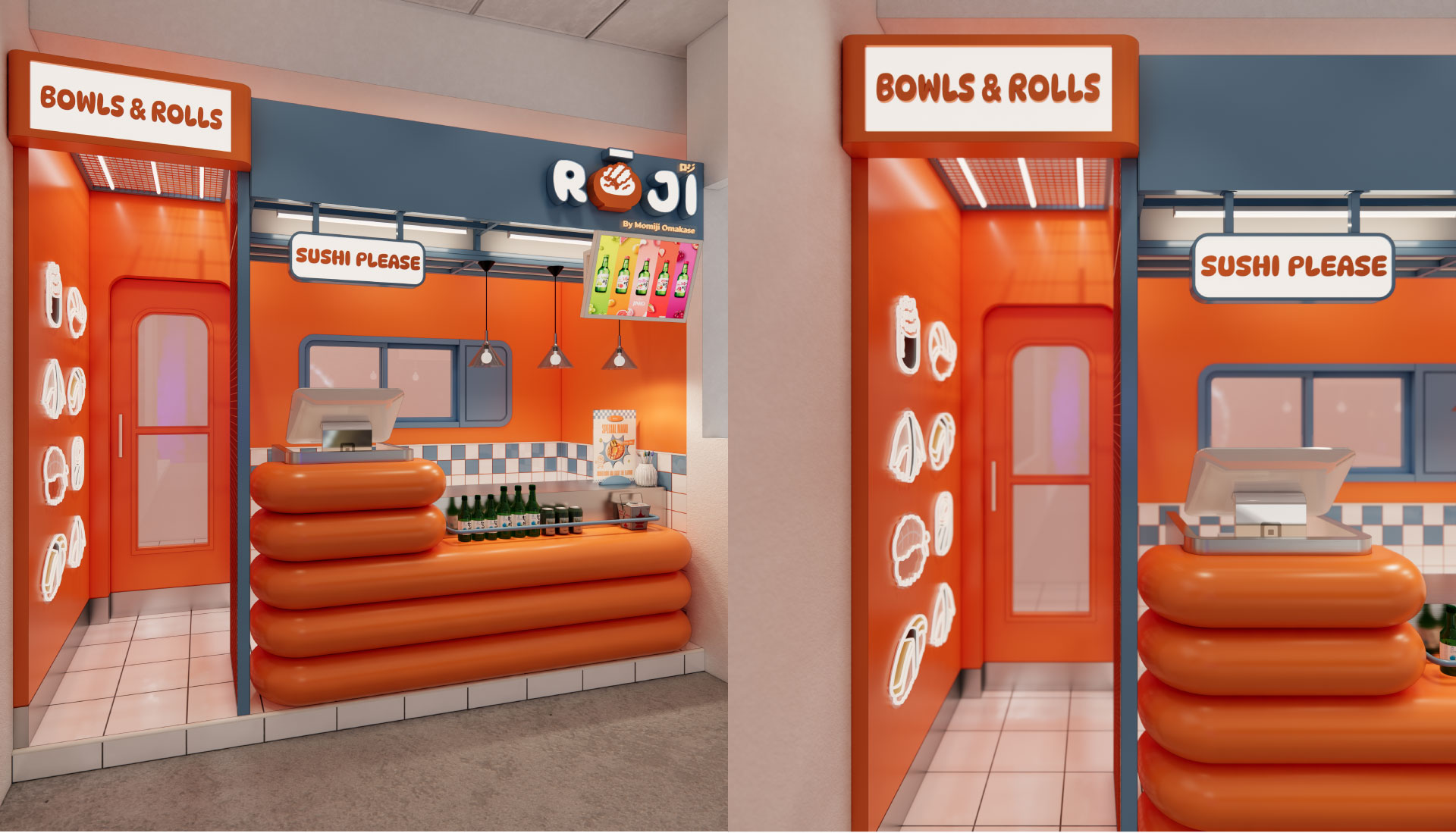 ภาพงานออกแบบร้าน "Roji" ร้านขายอาหารญี่ปุ่นและเครื่องดื่มตอนกลางคืน ออกแบบในโซนหน้าร้านแบ่งเป็นพื้นที่รับออเดอร์และครัวหลังบ้านแยกสัดส่วนกันอย่างชัดเจน โดยมีหน้าต่างสำหรับส่งมอบอาหารให้มีความสะดวกรวดเร็ว มีประตูบานเลื่อนที่ใช้สำหรับเข้าออกและช่วยให้ประหยัดพื้นที่ วางของด้านในได้อย่างเต็มที่