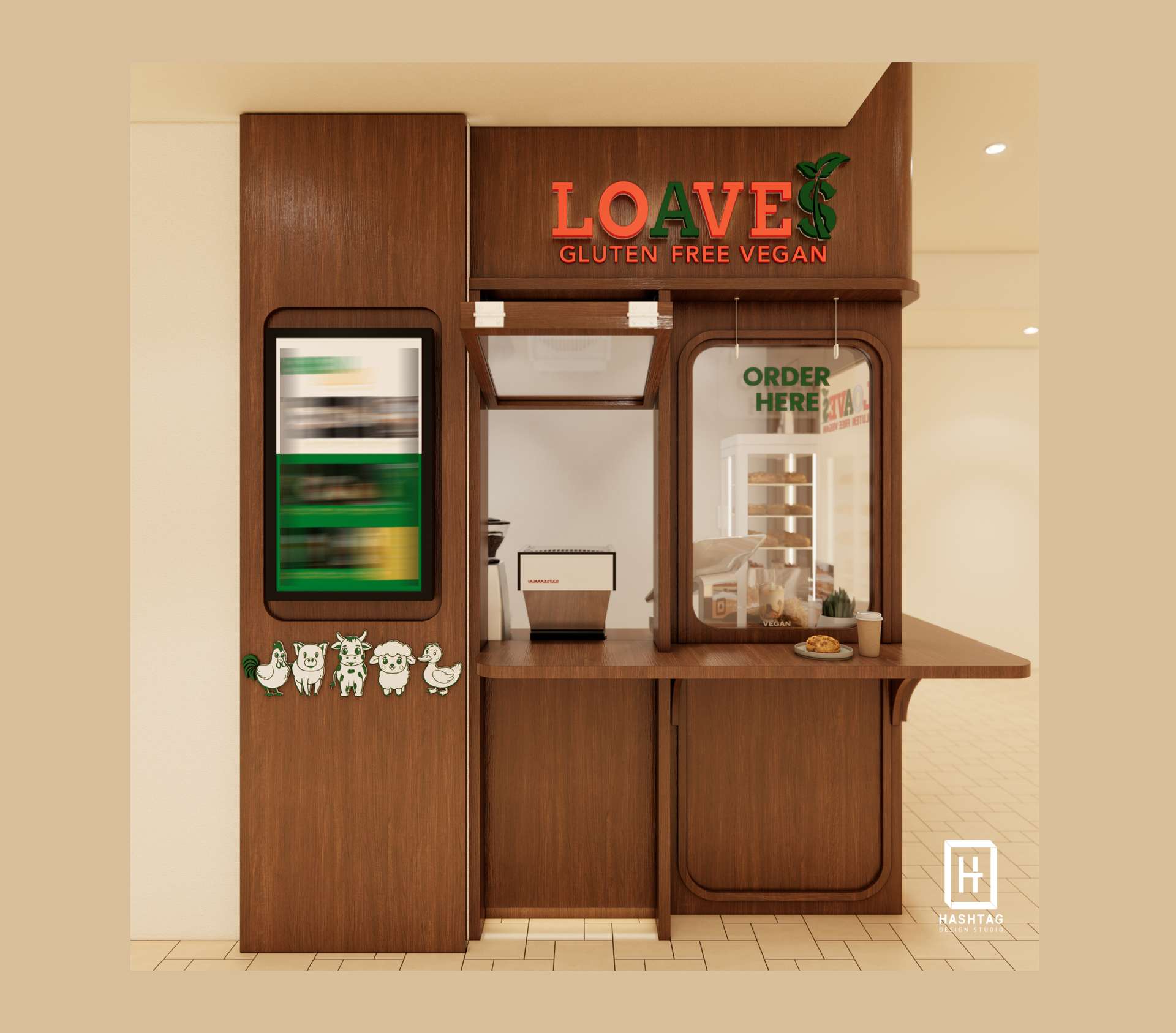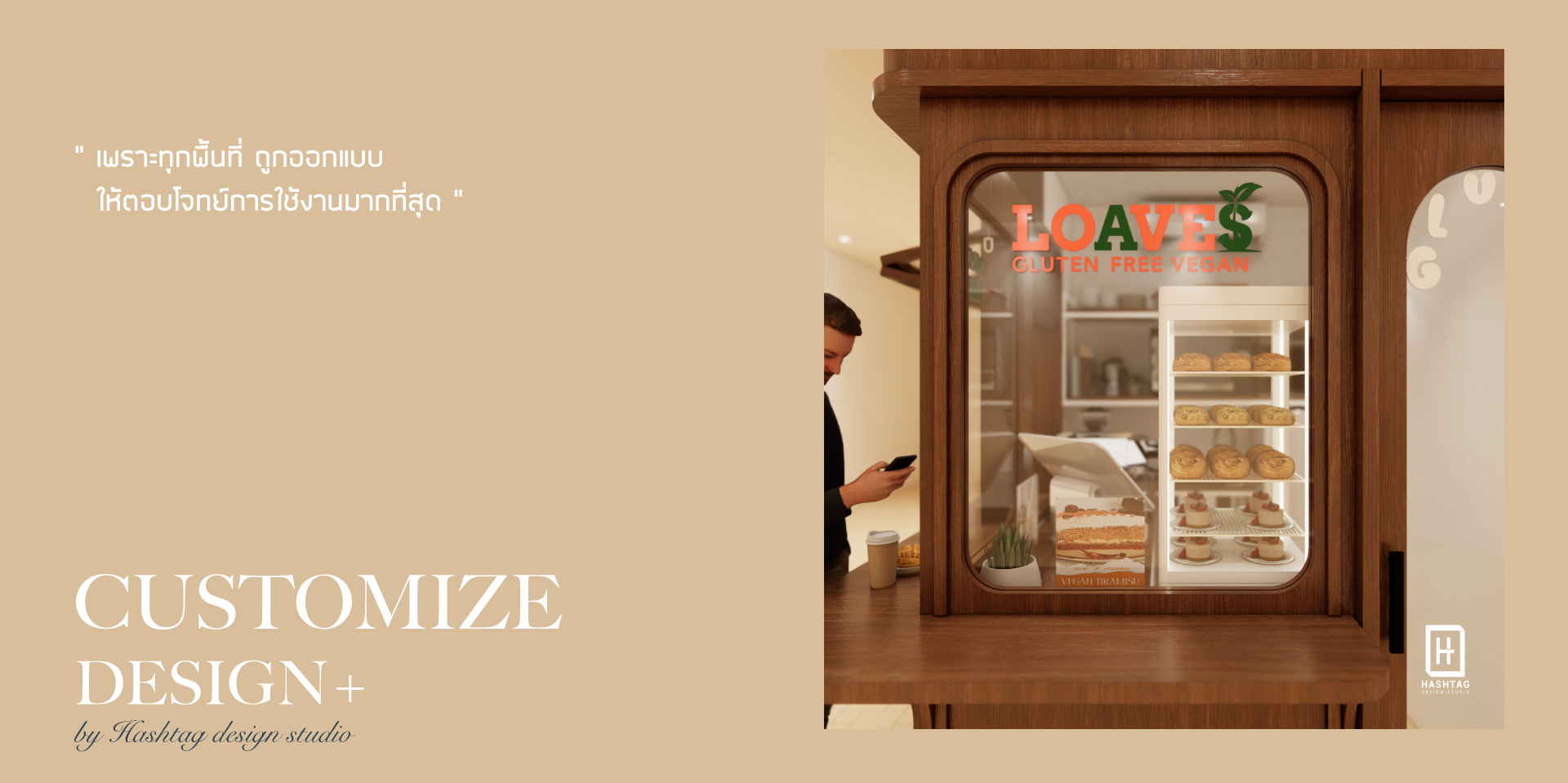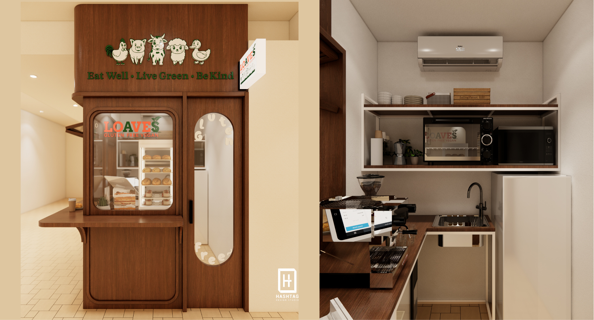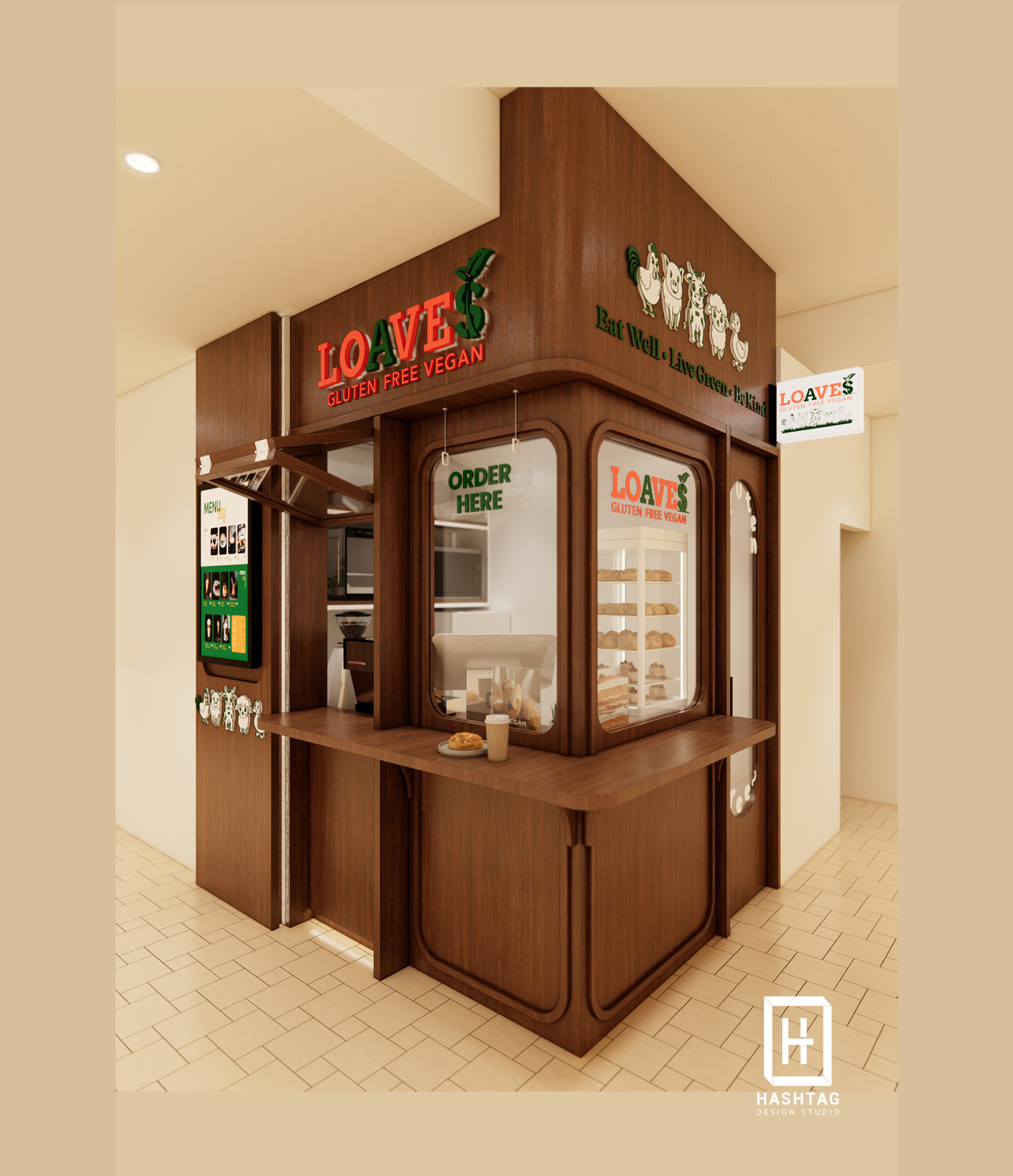 ภาพงานออกแบบร้าน "LOAVES" ร้านขายเครื่องดื่มประเภทกาแฟและเบเกอรี่ แบบ Take Away ออกแบบภายใต้พื้นที่จำกัดให้ภายในร้านสามารถอบเบเกอรี่และชงเครื่องดื่มได้
