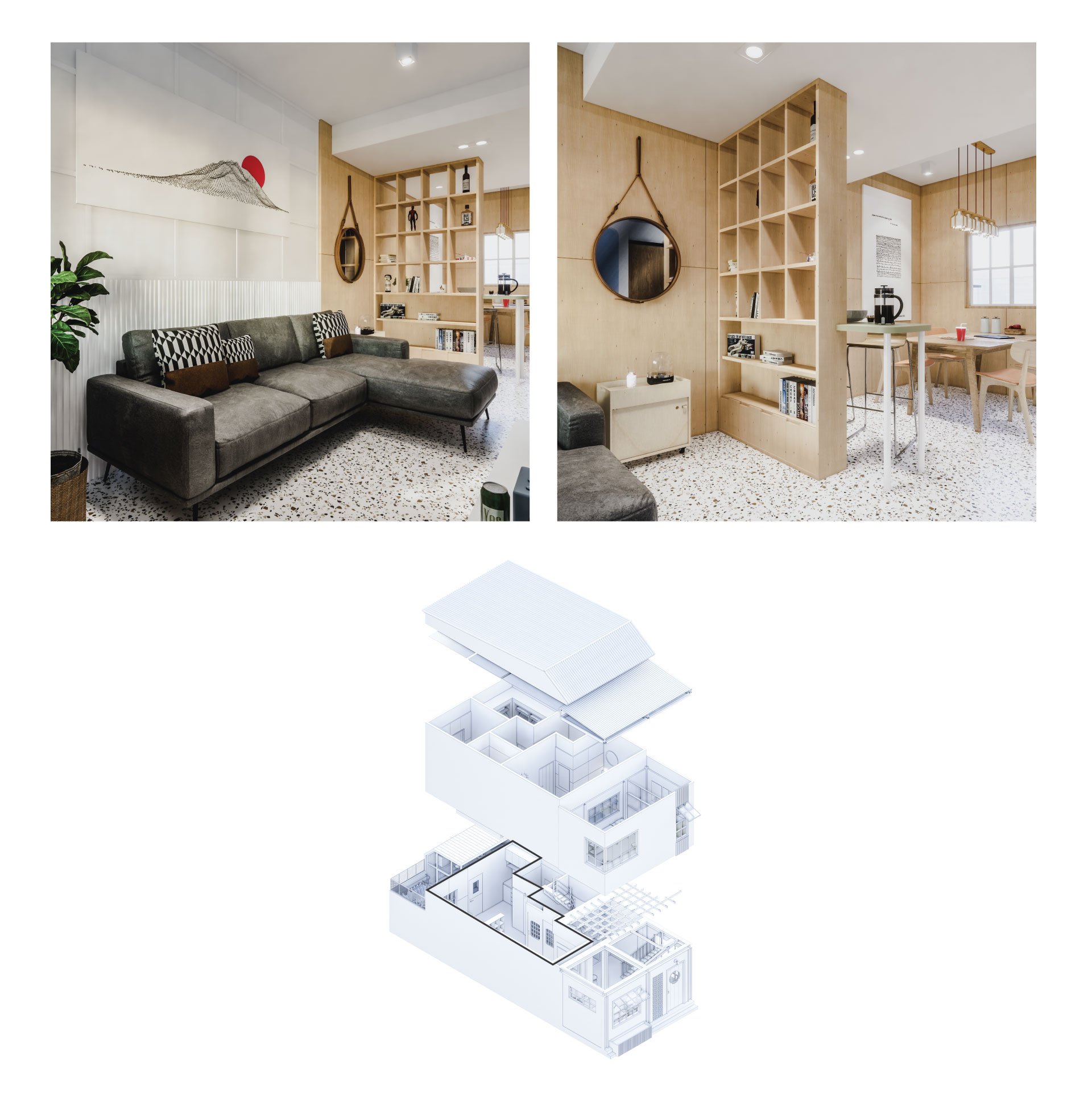 ต่อเนื่องจากส่วนต่อเติมหน้าบ้าน โซนนี้เป็นโซนห้องนั่งเล่น จะมีความ Private Zone เป็นพื้นที่สำหรับกิจกรรมในครอบครัว จะมีโซฟานอนดูทีวี เล่นเกมส์ โซนตู้วางของสะสม ซึ่งจะเชื่อมกับห้องทานอาหาร มีโต๊ะทานอาหาร บาร์เตรียมอาหาร และตู้เย็น และห้องน้ำ