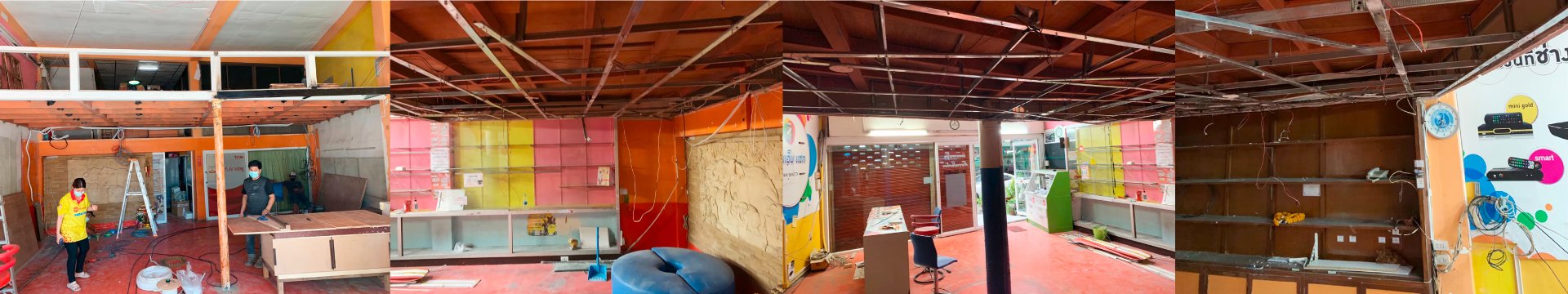 เบื้องต้นทางเจ้าของร้าน ทำการจัดเก็บของทั้งหมดออกจากร้าน เคลียร์พื้นที่โล่งสำหรับงานรีโนเวท ทำฝ้าใหม่