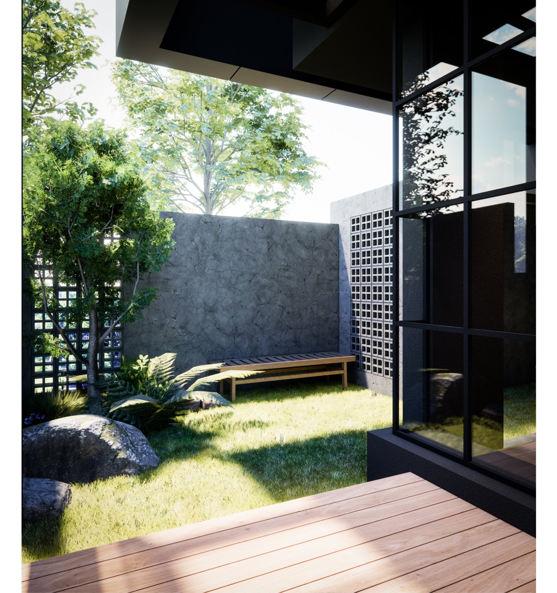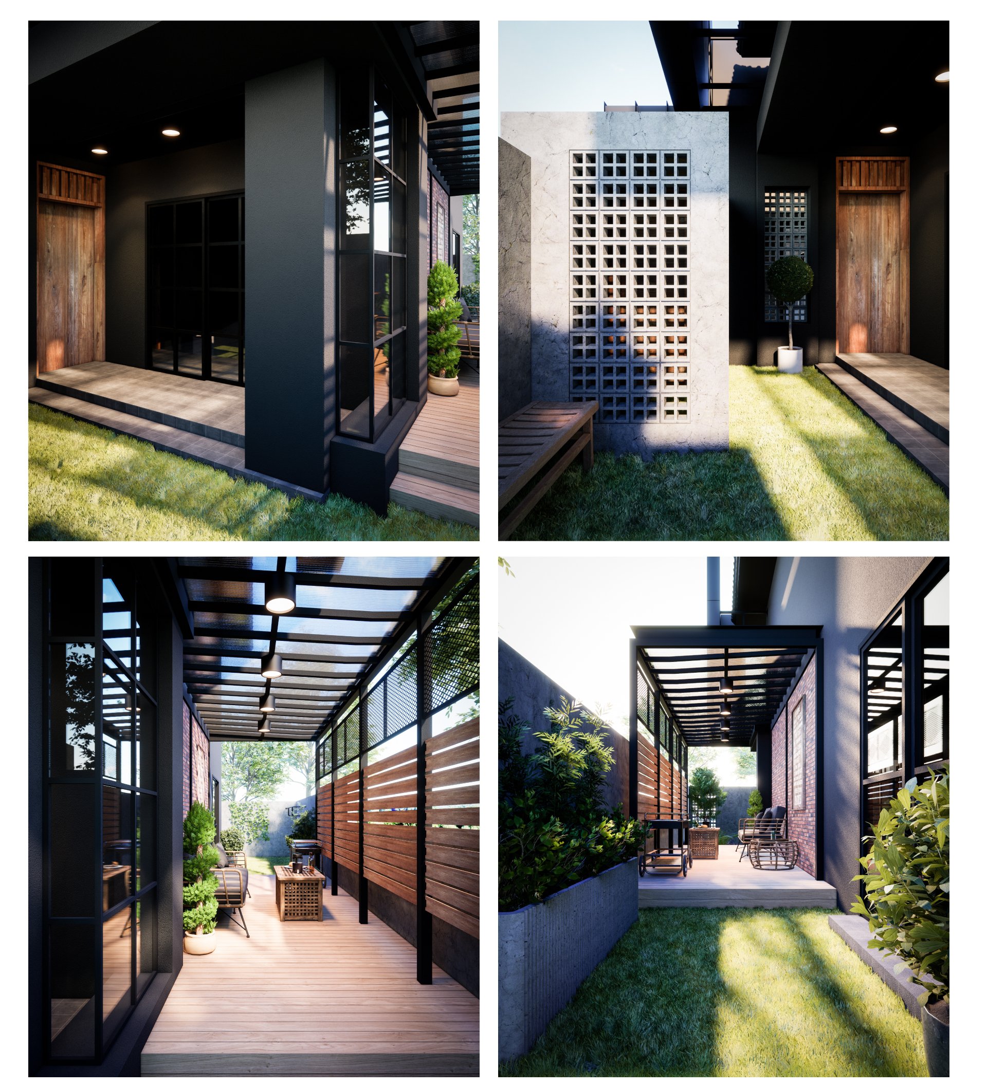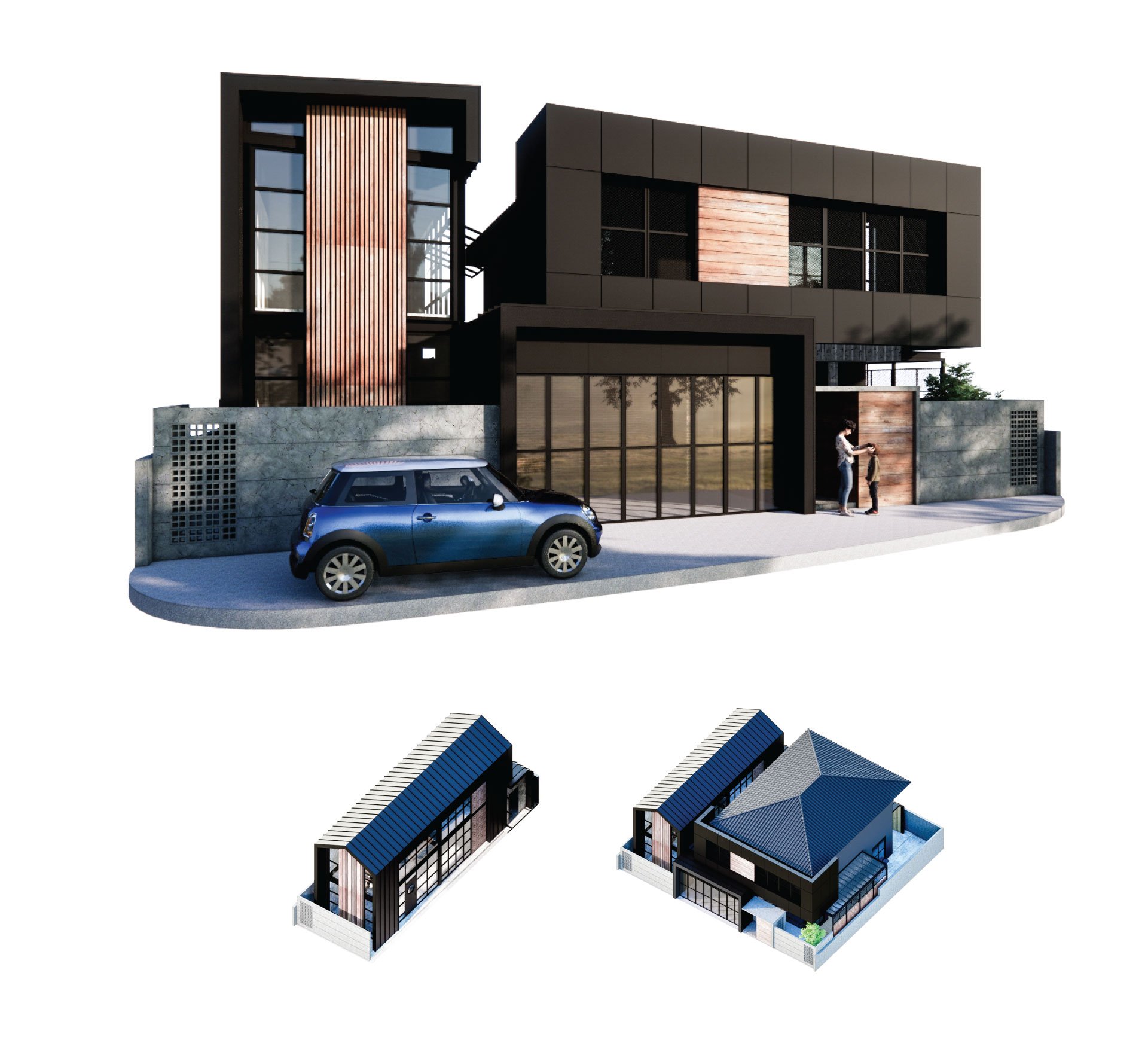 ส่วนตัวอาคารเดิมมีการออกแบบส่วน facad ด้านหน้าของตัวบ้าน โดยการก่อผนังปูน และเพิ่มอิฐบล็อคช่องลม เข้าไปในผนัง เพื่อความสวยงาม และเพื่อความโล่ง โปร่งของตัวบ้าน อีกทั้งส่วนโรงจอดรถ ยังติดตั้งกระจกแทนรั้วบ้าน ซึ่งเหมาะมาก สำหรับคนรักรถ