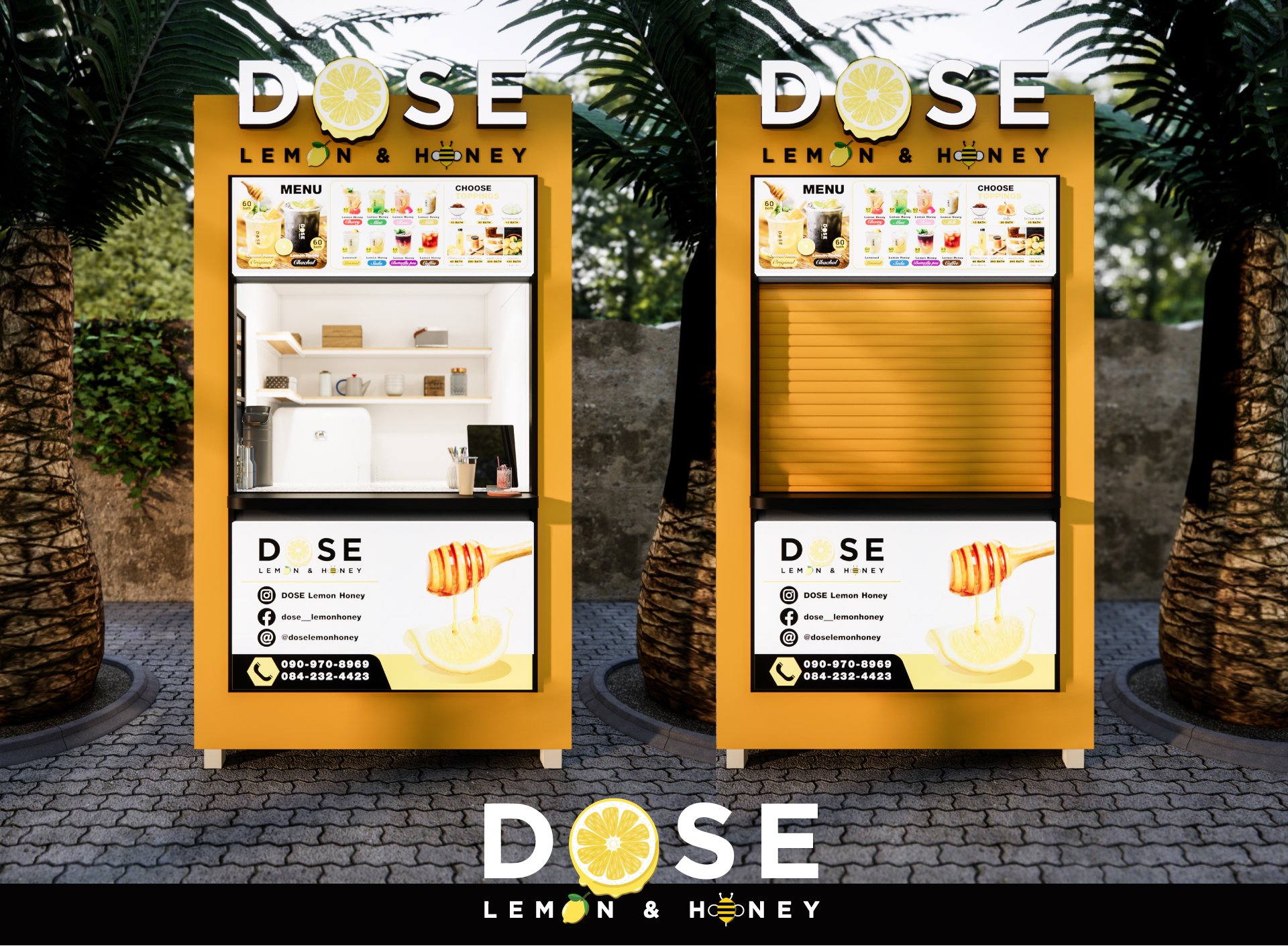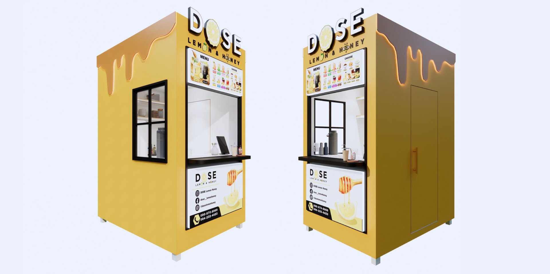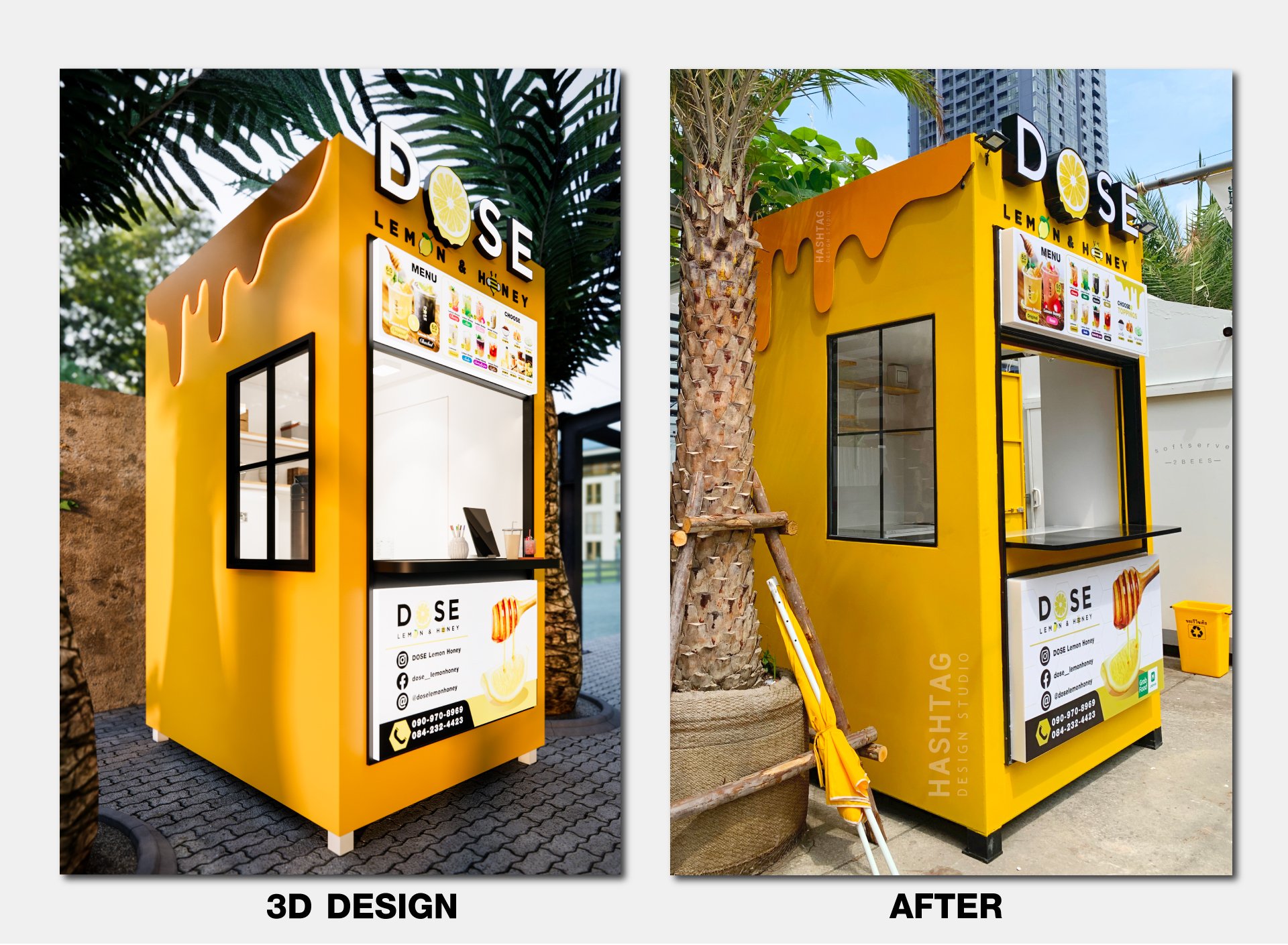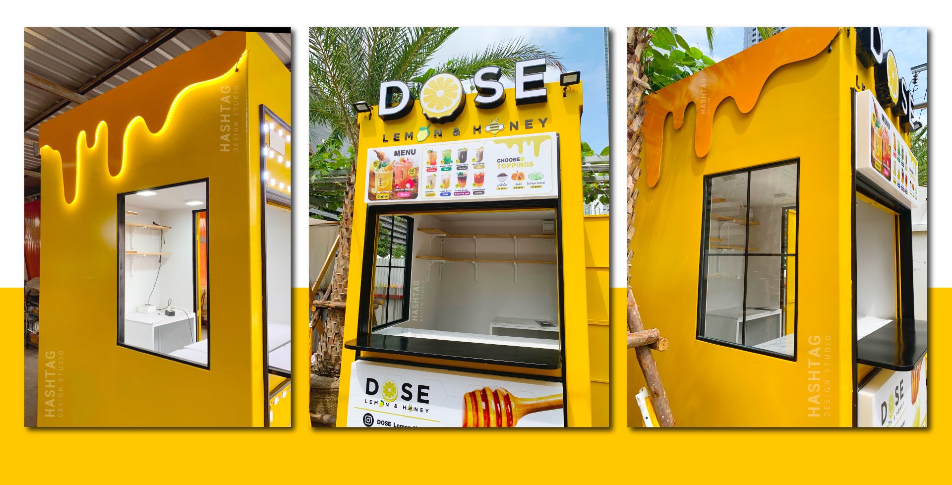 ออกแบบเป็นโทนสีเหลือง ตามสีของแบรนด์ จุดเด่นอยู่ที่ด้านข้างเป็นตกแต่งไดคัทเหล็กเป็นรูป หยดน้ำผึ้งทั้ง 2 ข้าง พร้อม ตกแต่งซ่อนไฟ LED เพิ่มความโดดเด่น สร้างภาพลักษณ์ให้กับแบรนด์ เห็นแต่ไกลว่าขายอะไร