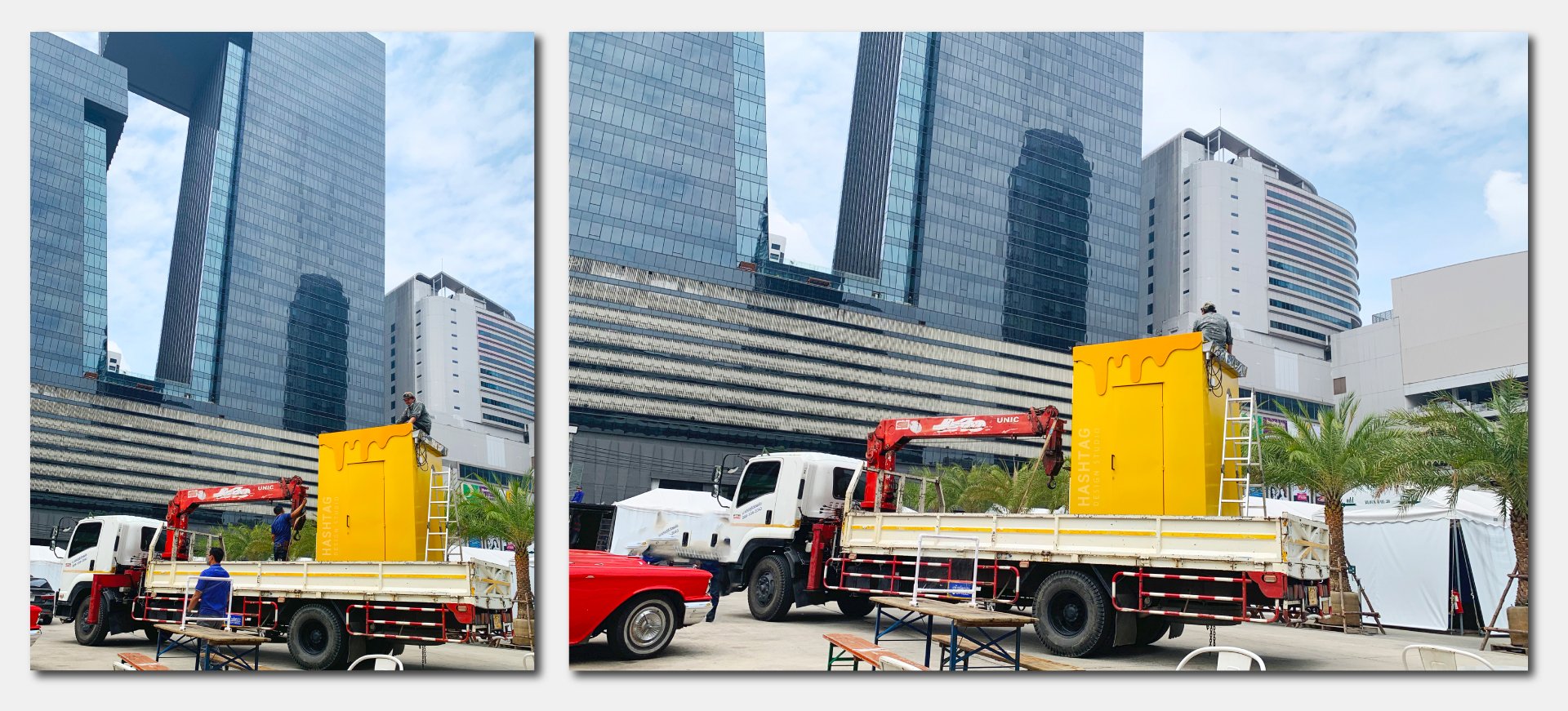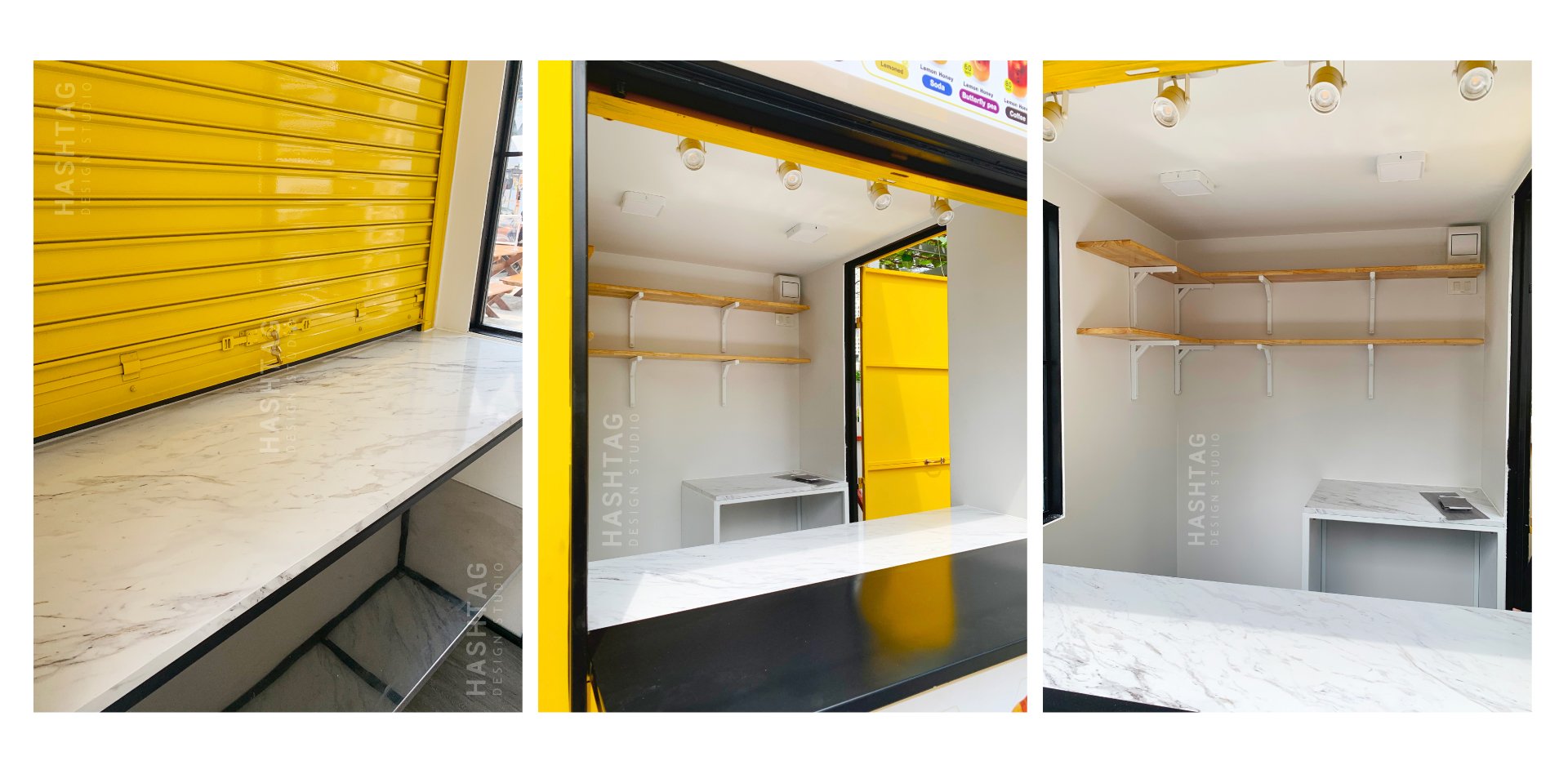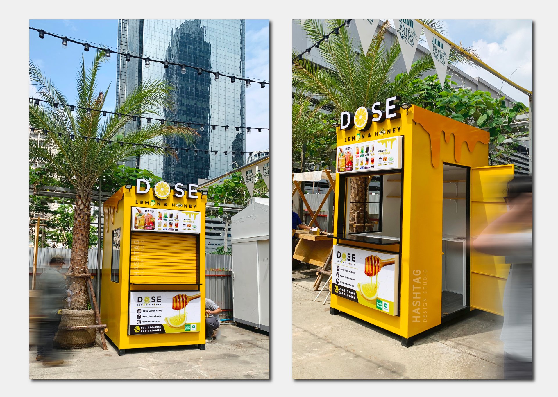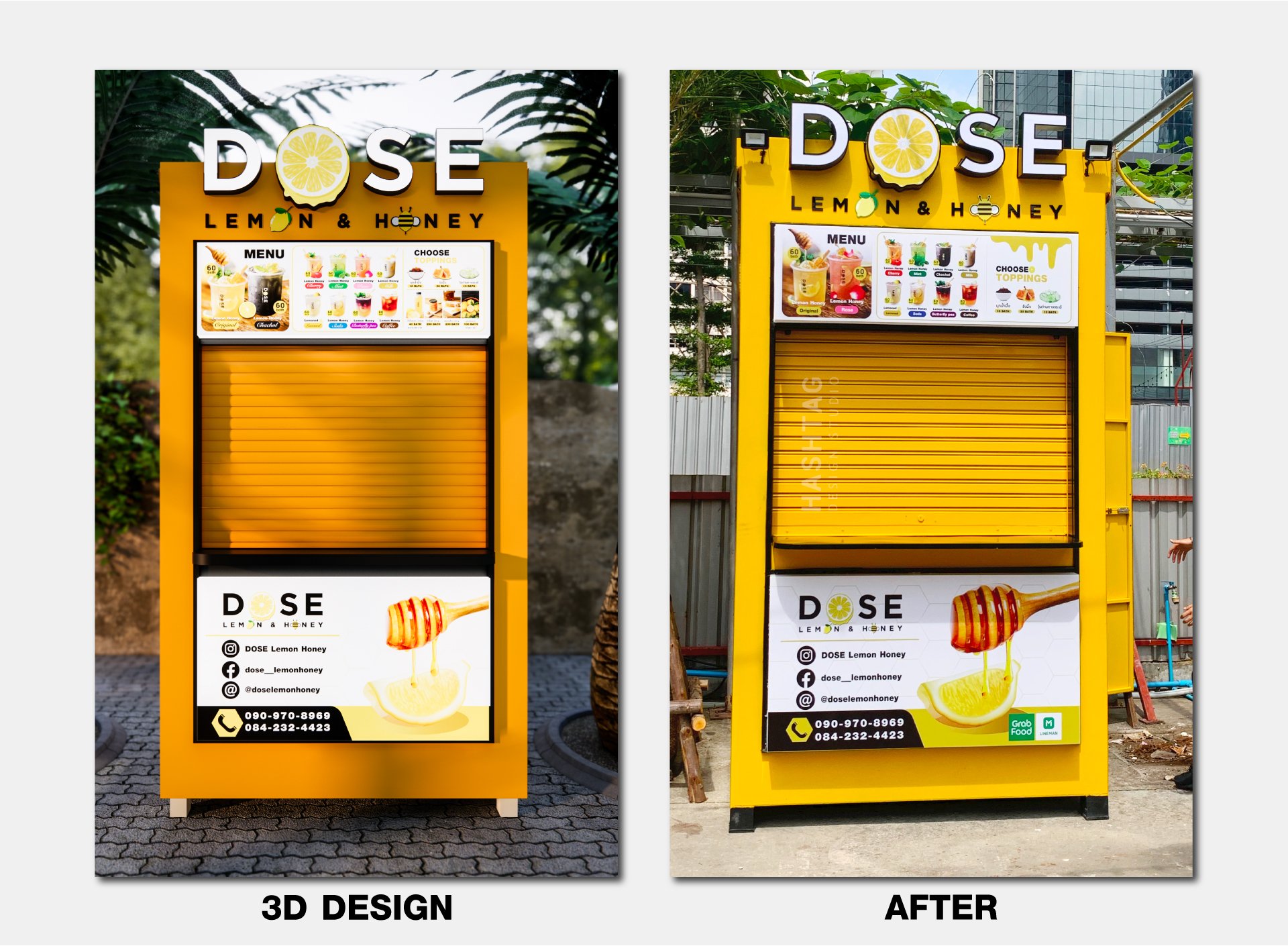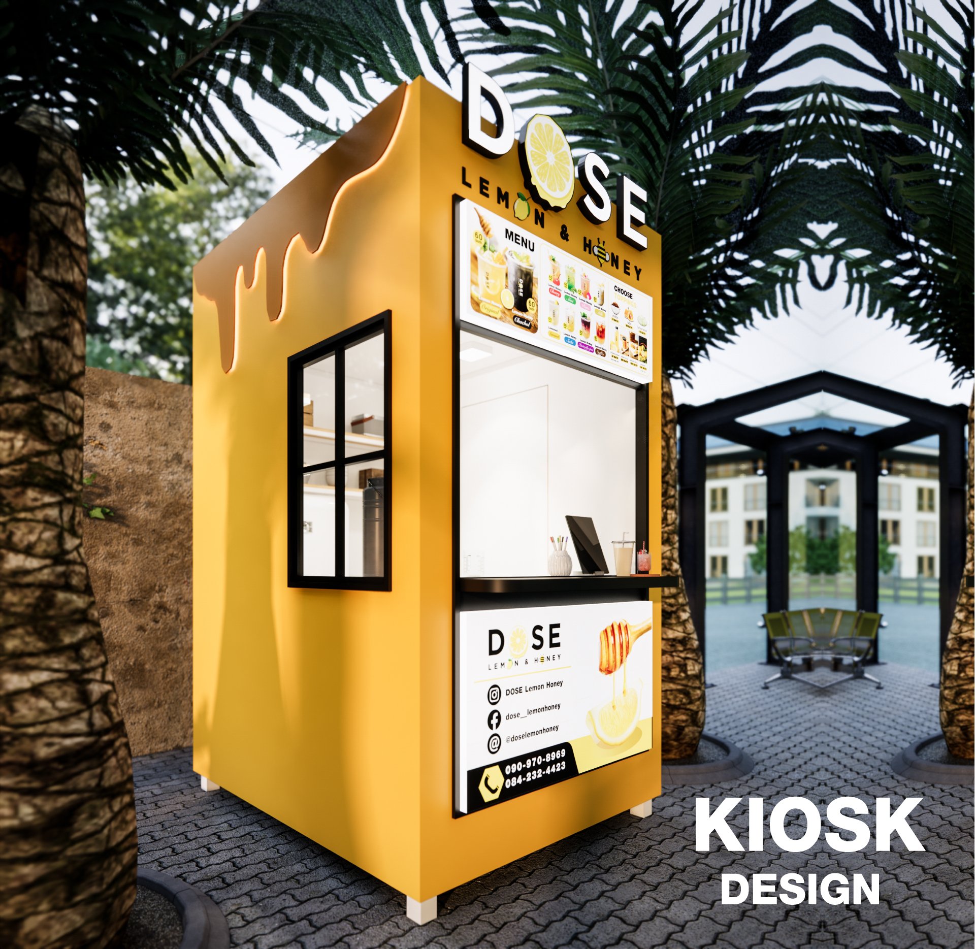ออกแบบเป็นโทนสีเหลือง ตามสีของแบรนด์ จุดเด่นอยู่ที่ด้านข้างเป็นตกแต่งไดคัทเหล็กเป็นรูป หยดน้ำผึ้งทั้ง 2 ข้าง พร้อม ตกแต่งซ่อนไฟ LED เพิ่มความโดดเด่น สร้างภาพลักษณ์ให้กับแบรนด์ เห็นแต่ไกลว่าขายอะไร