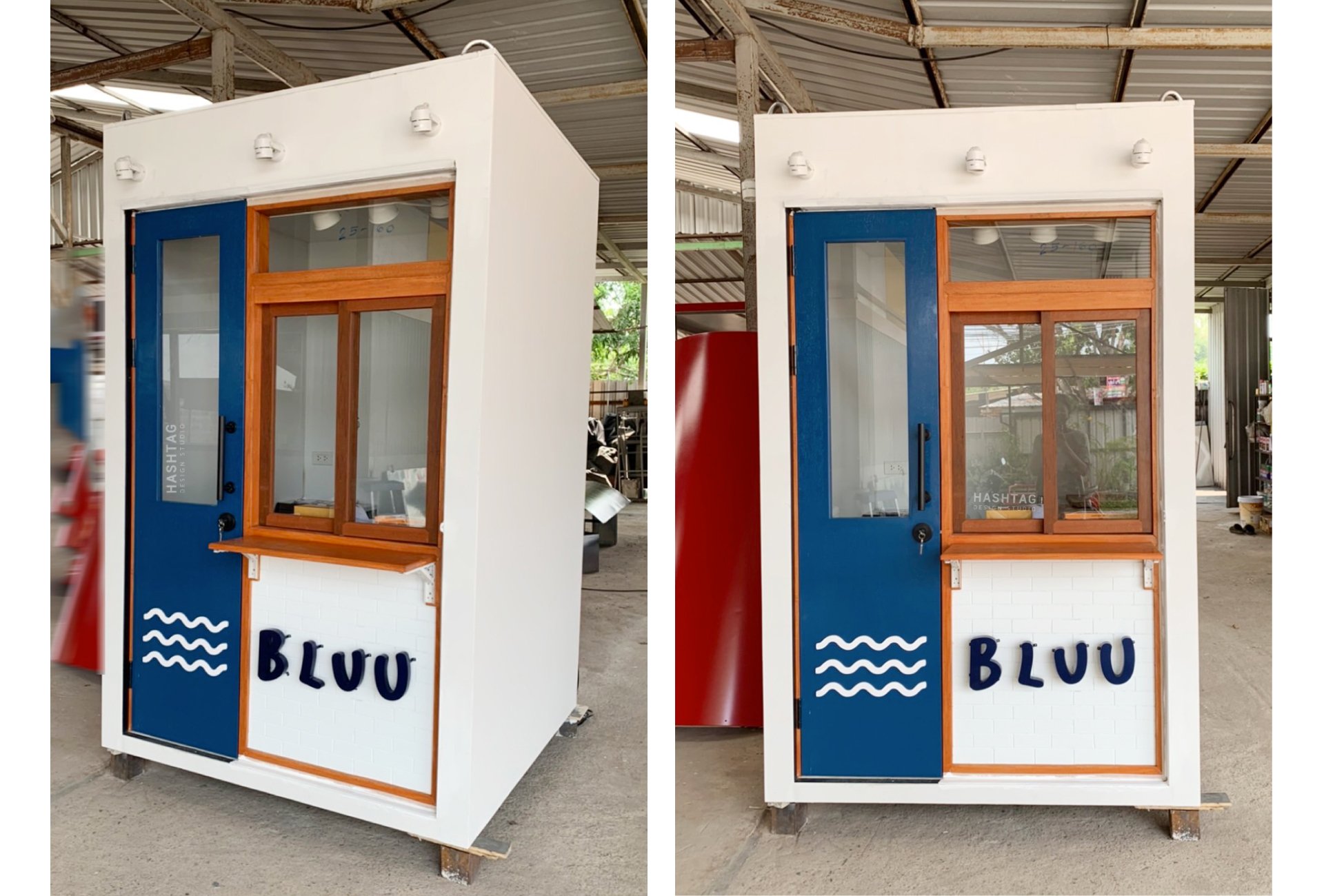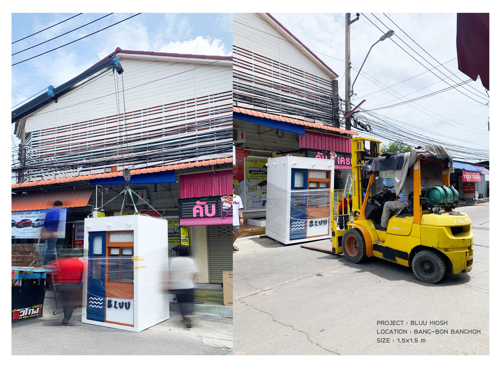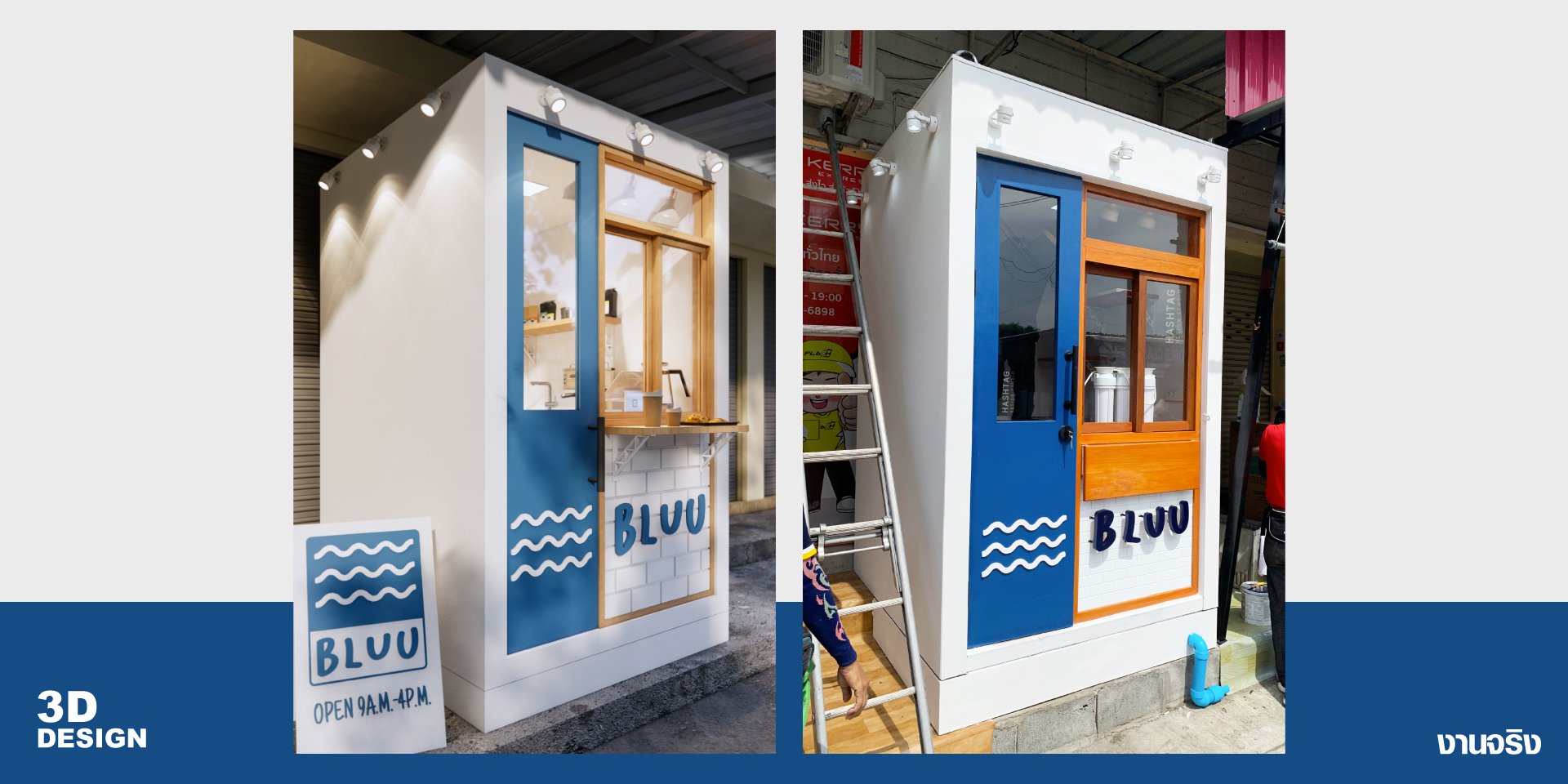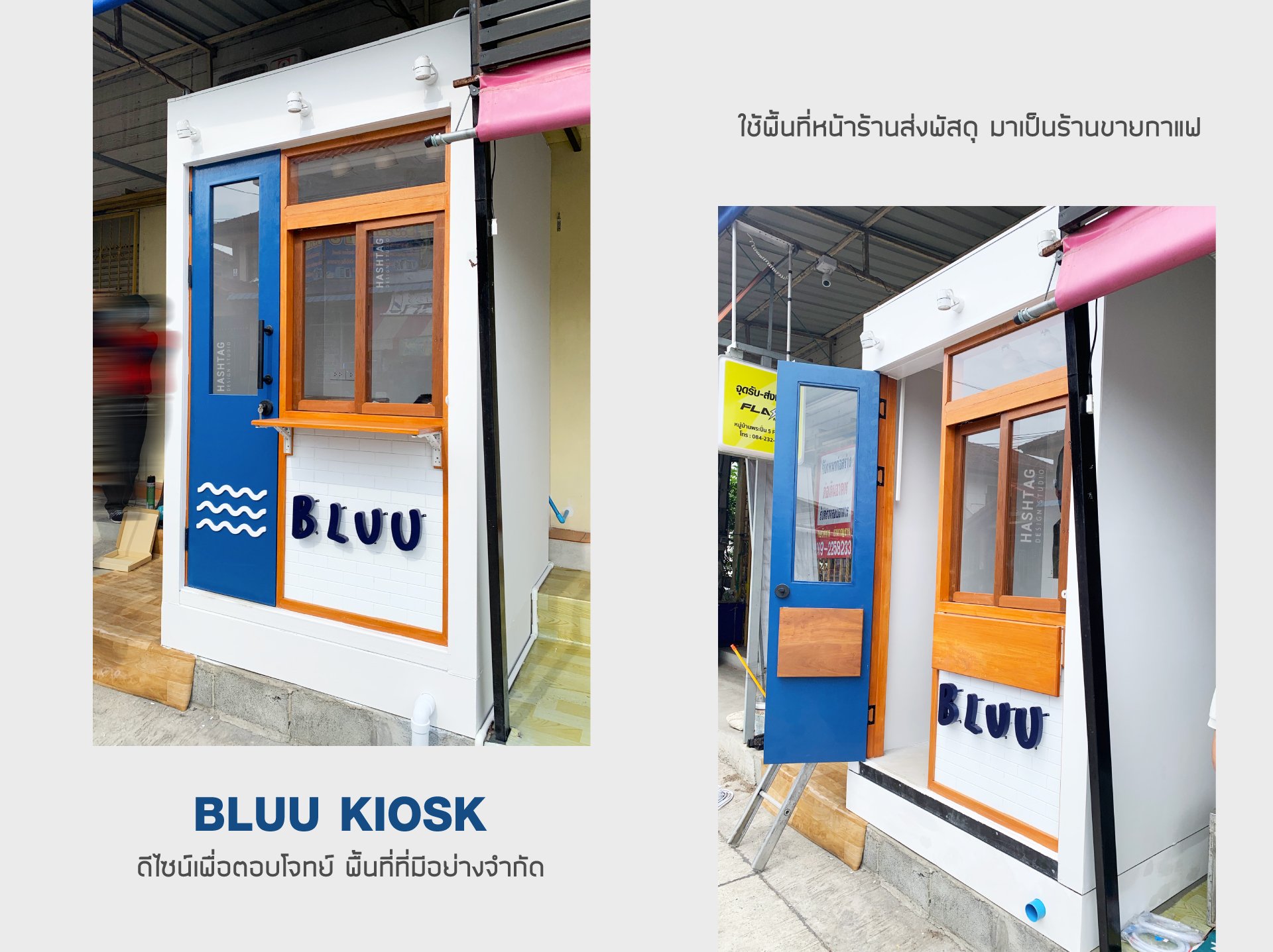 งานคีออสที่ออกแบบมาเพื่อ แก้ปัญหาพื้นที่หน้าร้านที่มีอย่างจำกัด บวกกับพื้นเป็นขั้นบันได ไม่เท่ากัน ต่างระดับกัน ทางเราแก้ปัญหาคือทำฐานเหล็กไปวางเพื่อให้เท่ากัน และวางท่อน้ำทิ้งตรงตำแหน่งฐาน