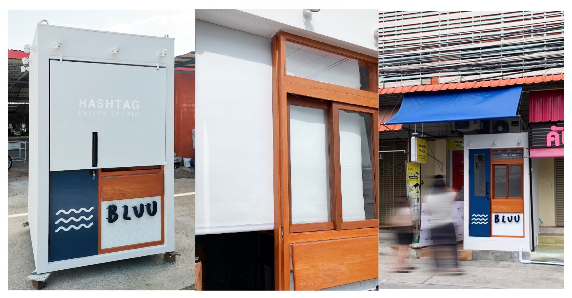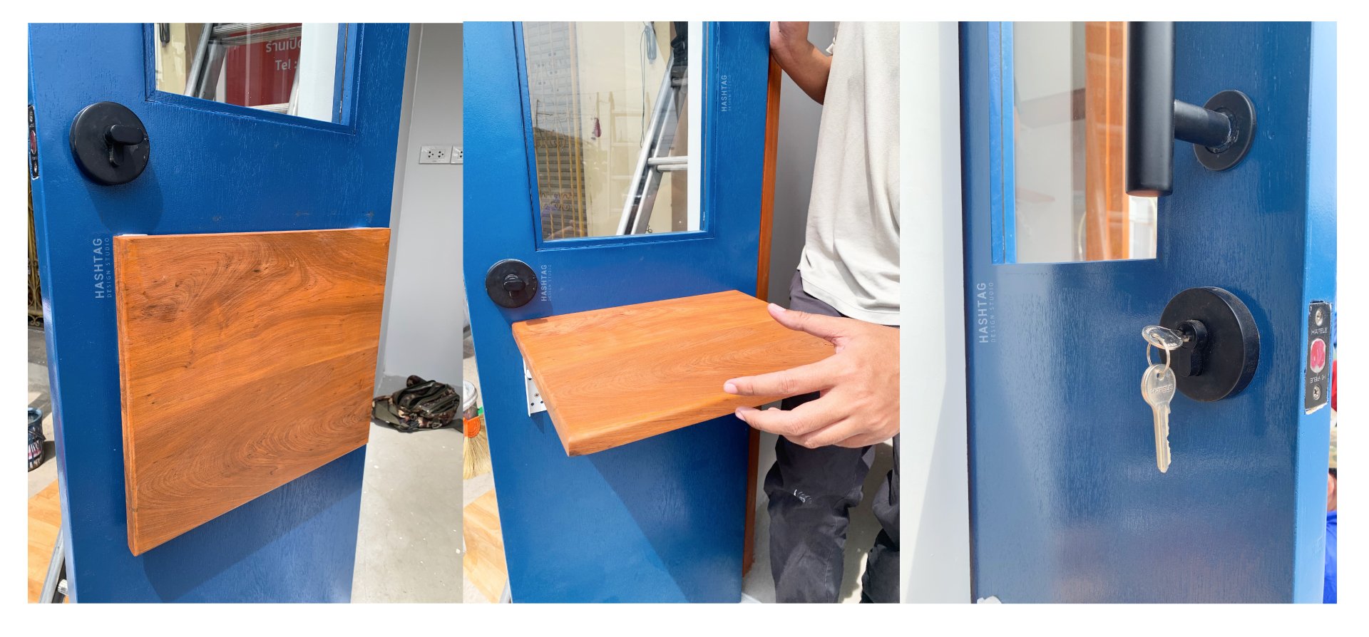 ออกแบบแผงเหล็ก เพื่อความปลอดภัย ตอนปิดร้าน โดยไม่ทำให้เสียดีไซน์ และติดตั้งม่านม้วนเพื่อบังสายตา เนื่องจากร้านตั้งอยู่ริมถนน ลูกค้าจึงห่วงเรื่องความปลอดภัยเป็นพิเศษ
