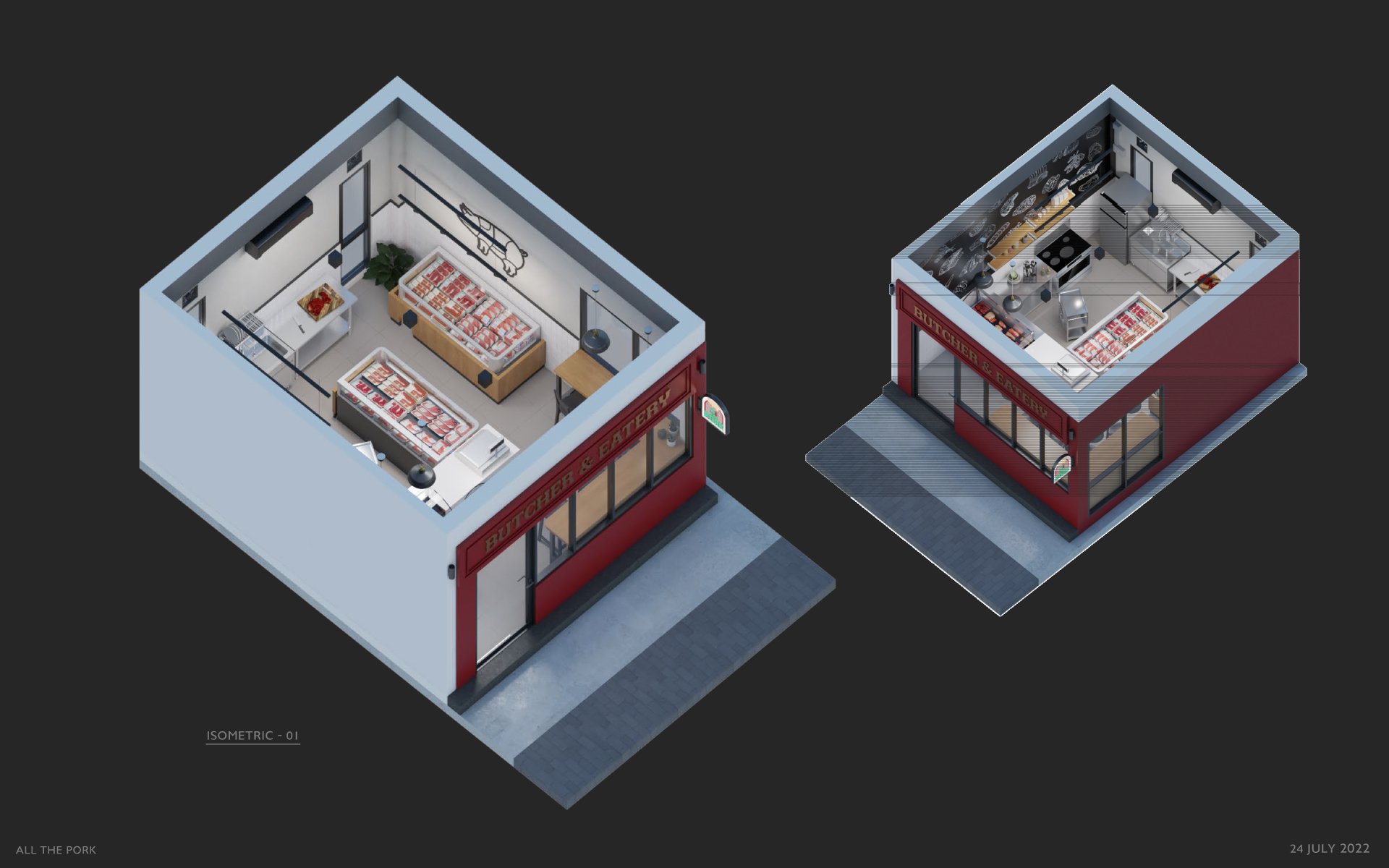 งานออกแบบและติดตั้งร้านค้าในห้าง ชื่อร้าน "All the pork" ร้านขายเนื้อหมู สุดพรีเมี่ยม พร้อมบริการปรุงสุก ร้านตั้งอยู่ในโครงการ Att U Park บางนา โดยเราออกแบบให้มีพื้นที่วางตู้แช่ เคาน์เตอร์คิดเงิน บาร์นั่งรอสำหรับลูกค้า และพื้นที่ครัวสำหรับปรุงอาหาร