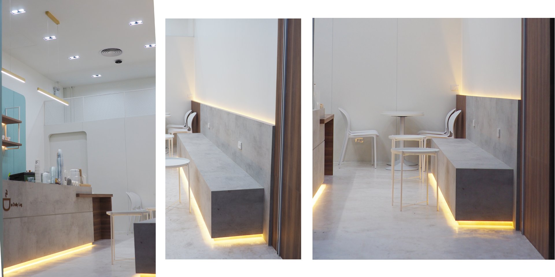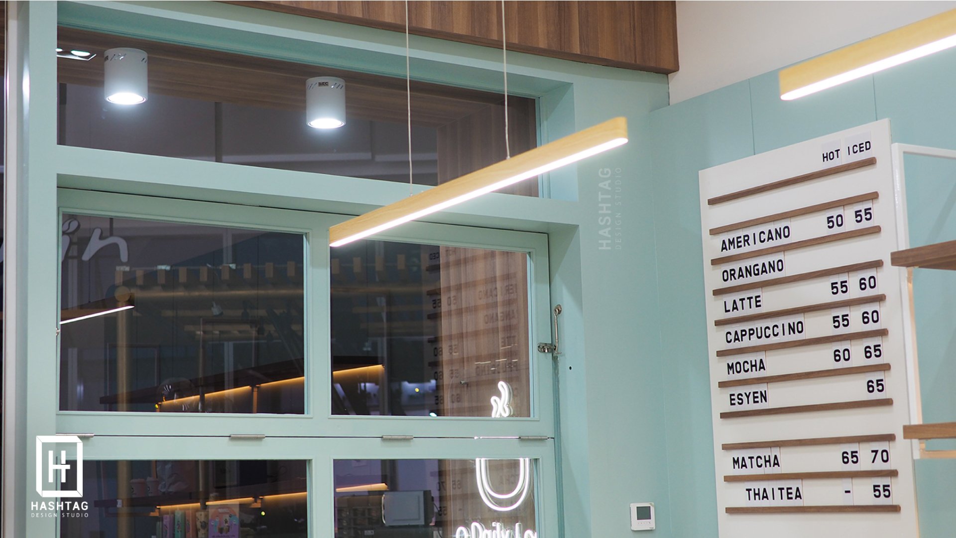 ด้านในเป็นเคาน์เตอร์ ลามิเนตโทนไม้ เพิ่มความสบายตาในร้าน มีโซนเก้าอี้ยาวให้ลูกค้านั่งทานในร้าน ตกแต่งด้วยโคมไฟวัสดุงานสาน ทอ ถัก เพิ่มความน่ารักให้กับร้านได้อย่างลงตัว