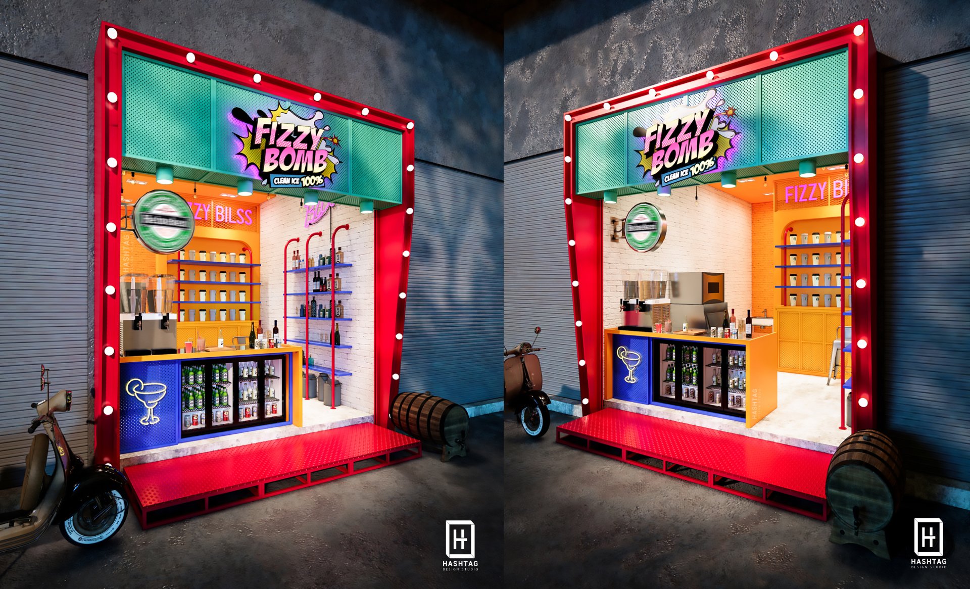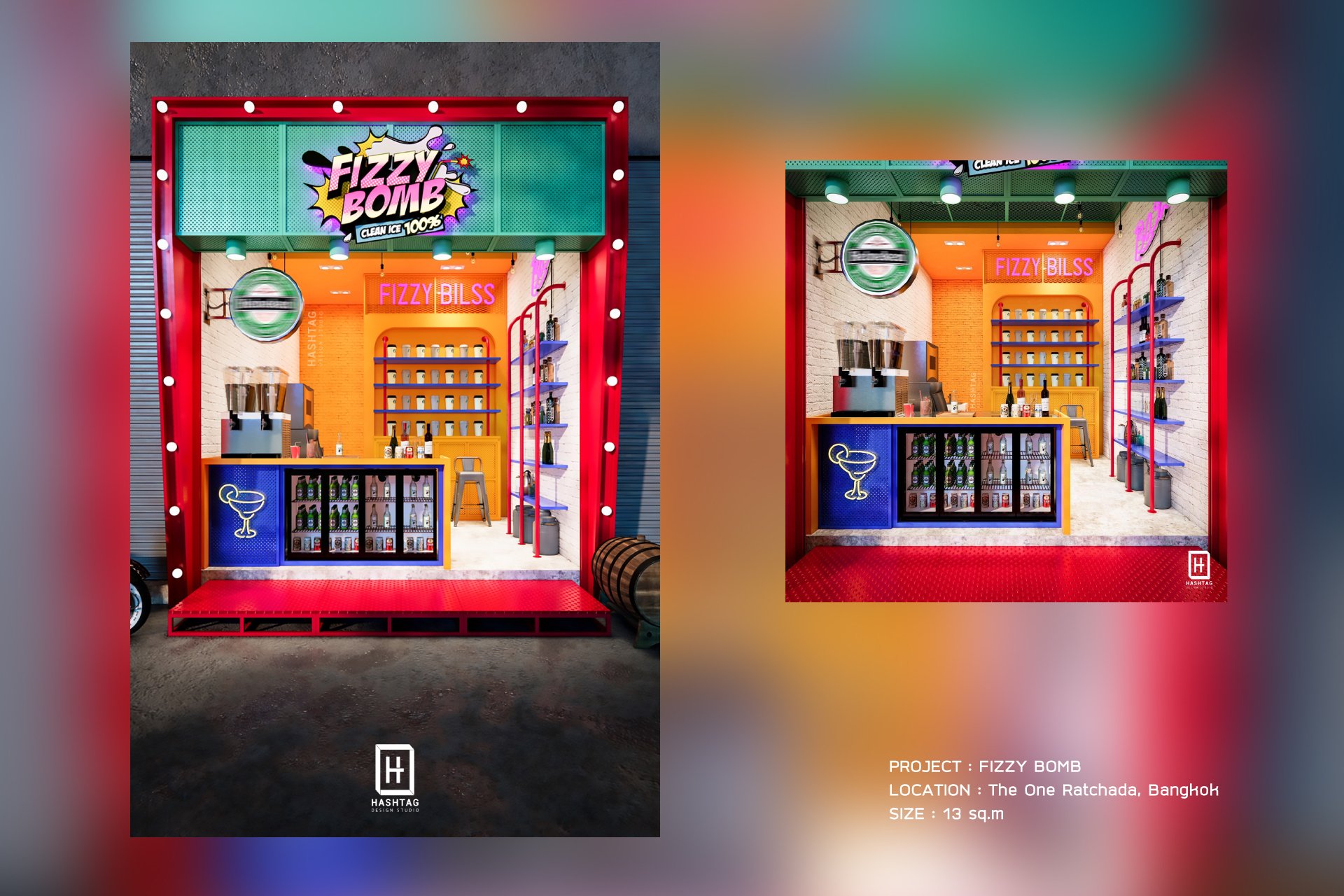 งานออกแบบร้านค้าในตลาดดิวัน รัชดา "Fizzy Bomb" ร้านขายเครื่องดื่ม ในตีมคัลเลอร์ฟูล เน้นโทนสีตัดกัน จัดจ้าน เด่น สะดุดตา ด้านหน้าออกแบบให้เป็นซุ้มสีแดงกรอบไฟปิงปอง ตัดกันกับพื้นป้ายสีเขียว ส่วนเคาน์เตอร์ออกแบบให้วางเครื่องกดสเลอปี้ เพื่อให้ลูกค้าสามารถกดด้วยตัวเอง ด้านล่างเคาน์เตอร์ออกแบบให้สามารถใส่ตู้แช่เครื่องดื่ม เพื่อให้ลูกค้าเปิดหยิบได้เลย ด้านข้างมีชั้นวางสินค้าเต็มพื้นที่ และด้านหลังมีผนังกั้นโซนหลังร้าน มีเคาน์เตอร์สามารถเก็บของและโชว์ของได้านออกแบบร้านขายเครื่องสำอาง งานออกแบบร้านขายเครื่องสำอาง งานออกแบบร้านขายเครื่องสำอาง งานออกแบบร้านขายเครื่องสำอาง