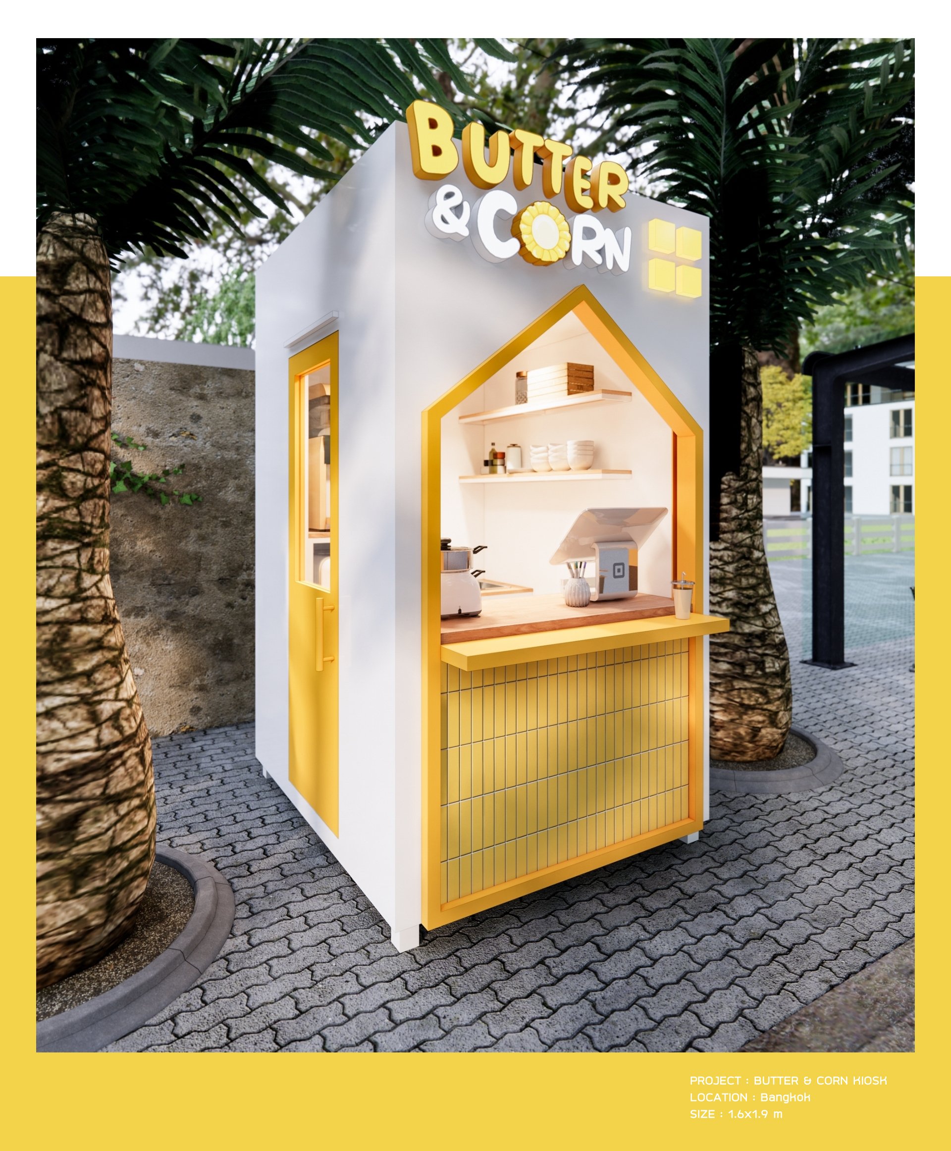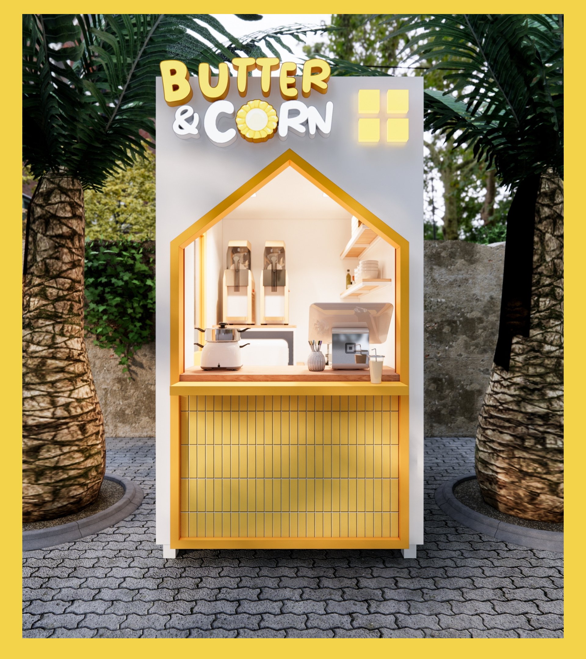 คีออสร้านขายข้าวโพดและสเลอปี้ BUTTER & CORN ที่มาใน concept รูปทรงบ้าน ดูอบอุ่น โทนสีเหลือง