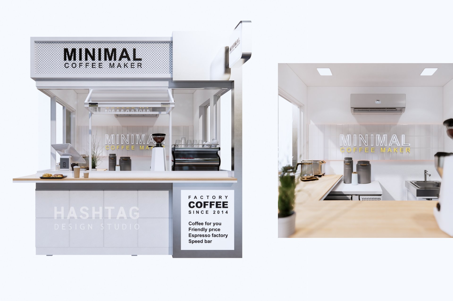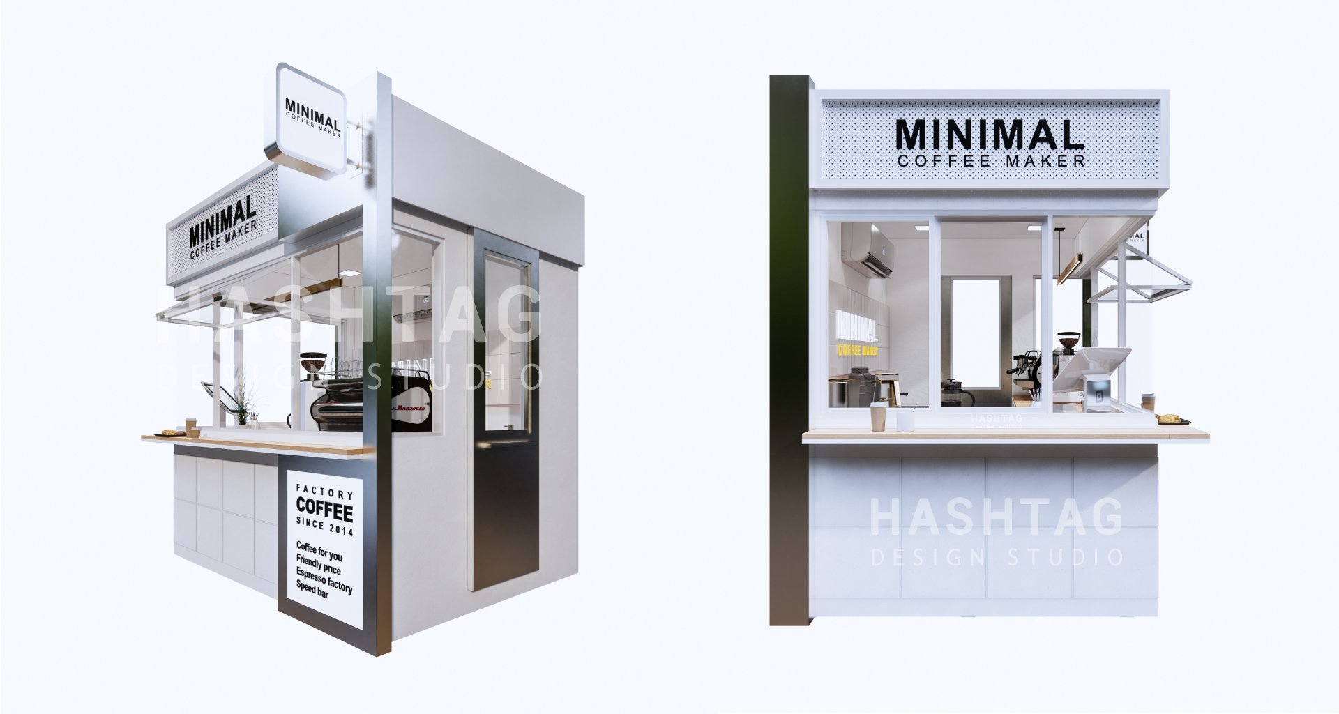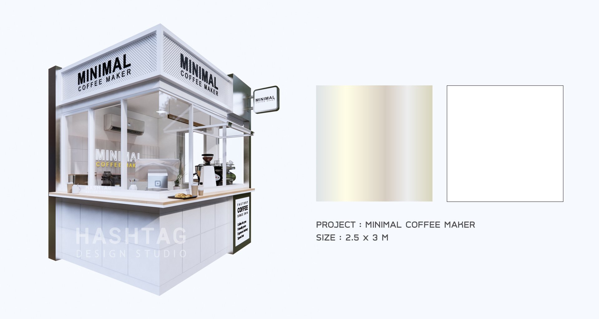 คีออสร้านขายกาแฟ เน้นโทนขาว ตกแต่งด้วยแผ่นสแตนเลส และตะแกรงเหล็กเจาะรู
