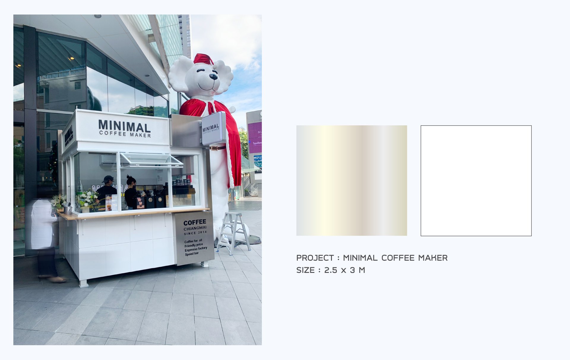 คีออสร้านขายกาแฟ เน้นโทนขาว ตกแต่งด้วยแผ่นสแตนเลส และตะแกรงเหล็กเจาะรู