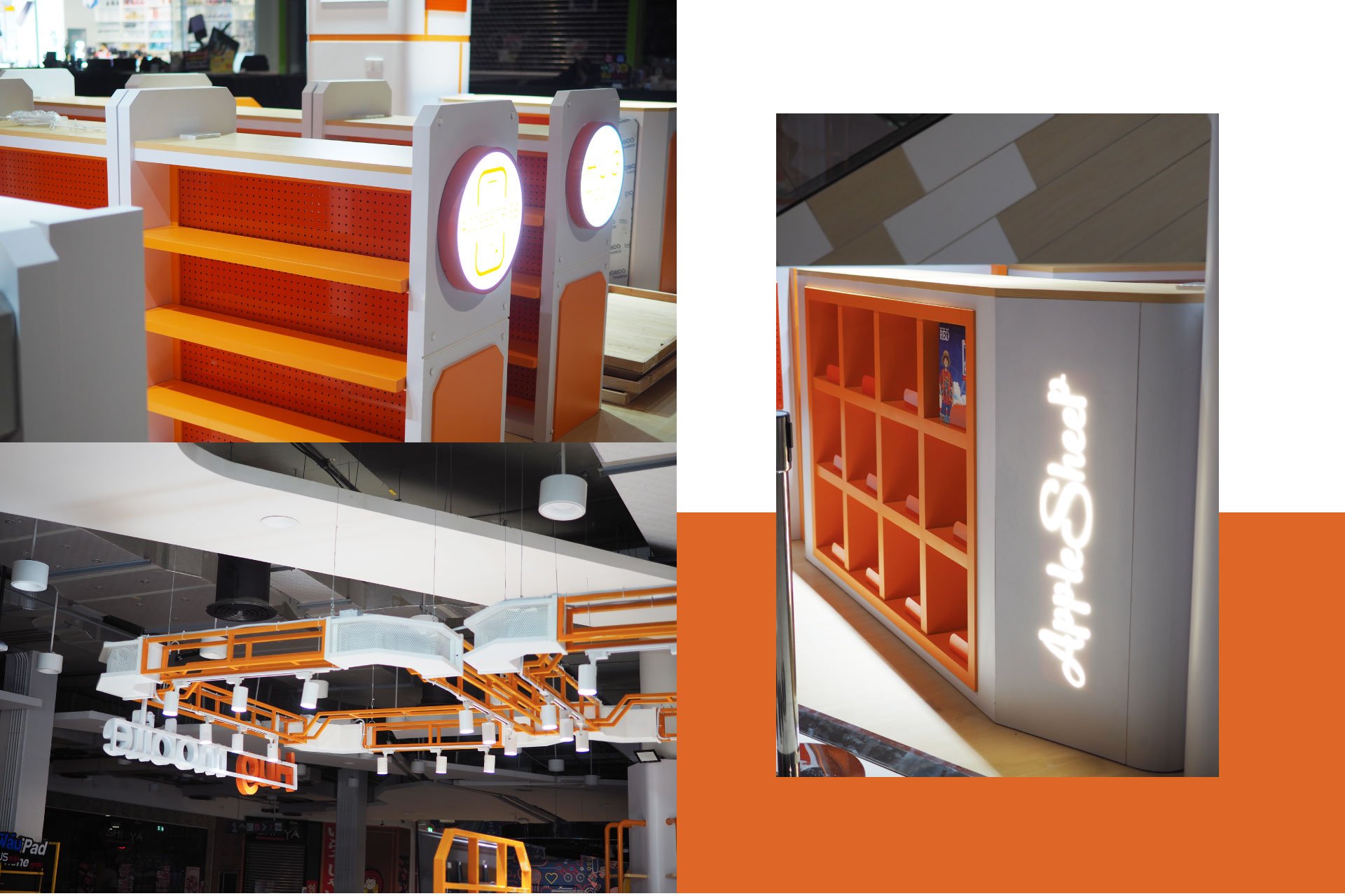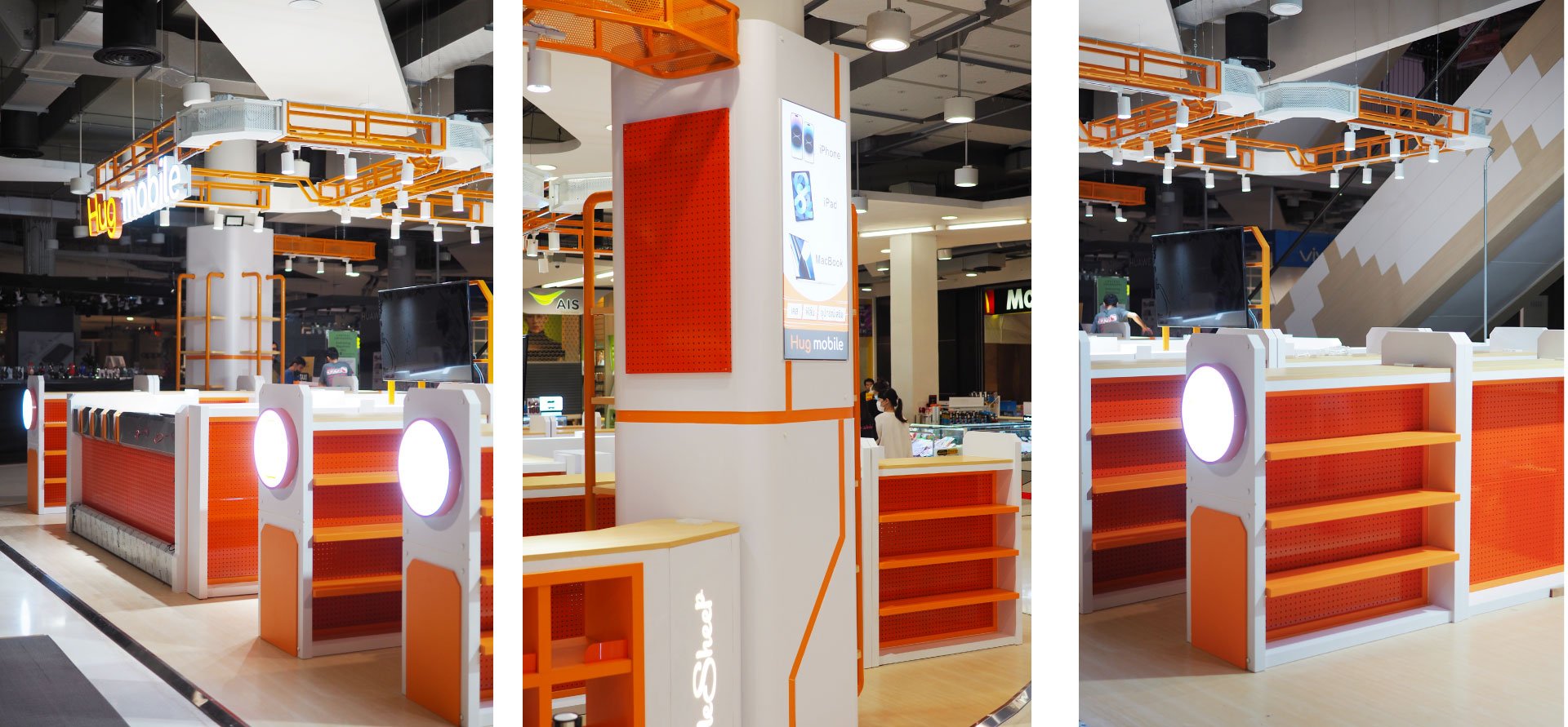 โจทย์ออกแบบคือเป็นพื้นที่โล่ง ออกแบบให้มีฟังก์ชั่นการใช้งานครบ เนื่องจากร้านมีบริการด้านมือถือ ครบวงจร ทั้งขาย-ซ่อม อุปกรณ์ต่างๆ รวมถึงติดฟิล์ม จึงต้องมีการแยกโซนอย่างชัดเจน เพื่อไม่ให้ลูกค้าอึดอัด สามารถเดินดูสินค้าได้อย่างสบาย