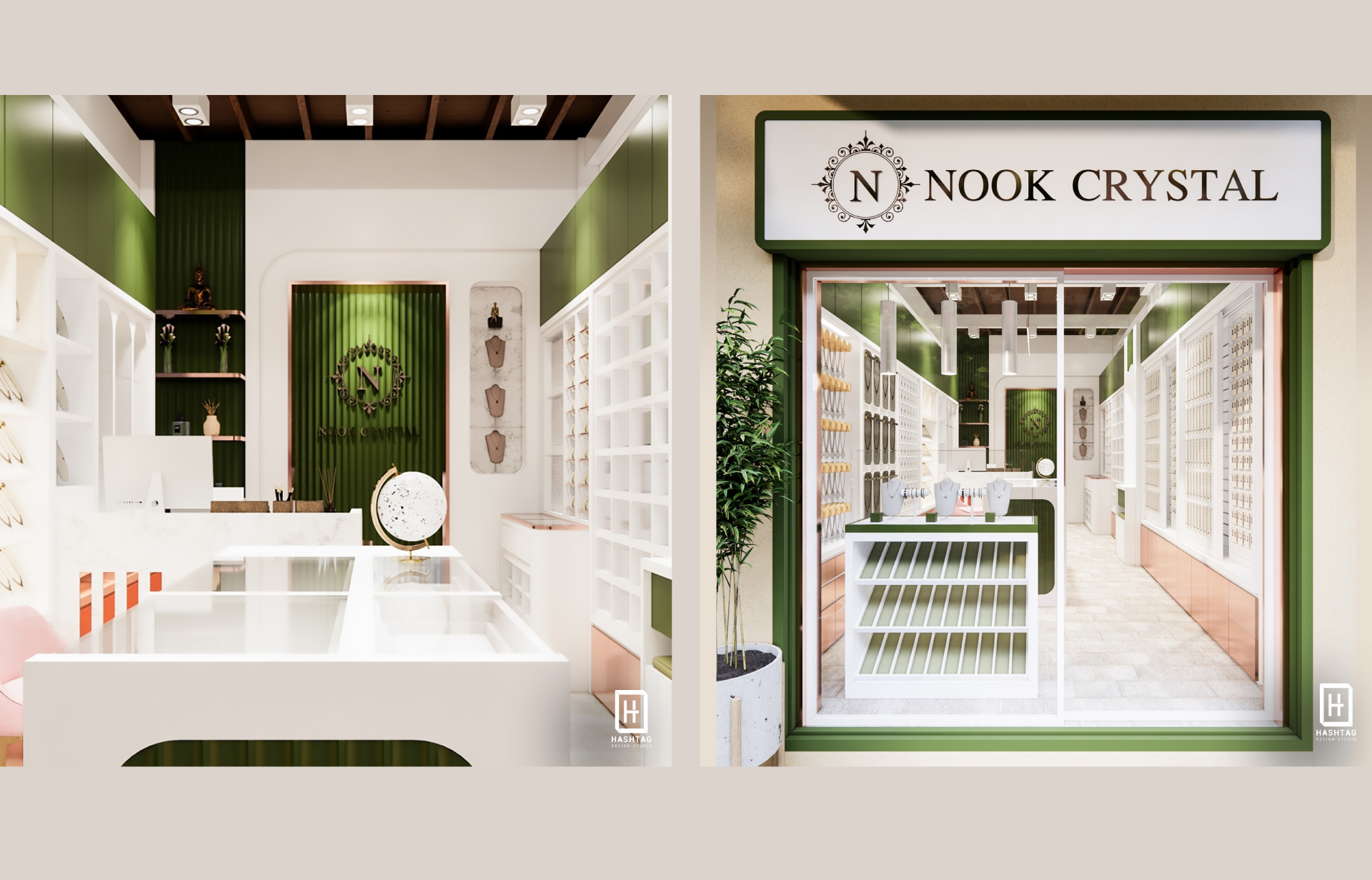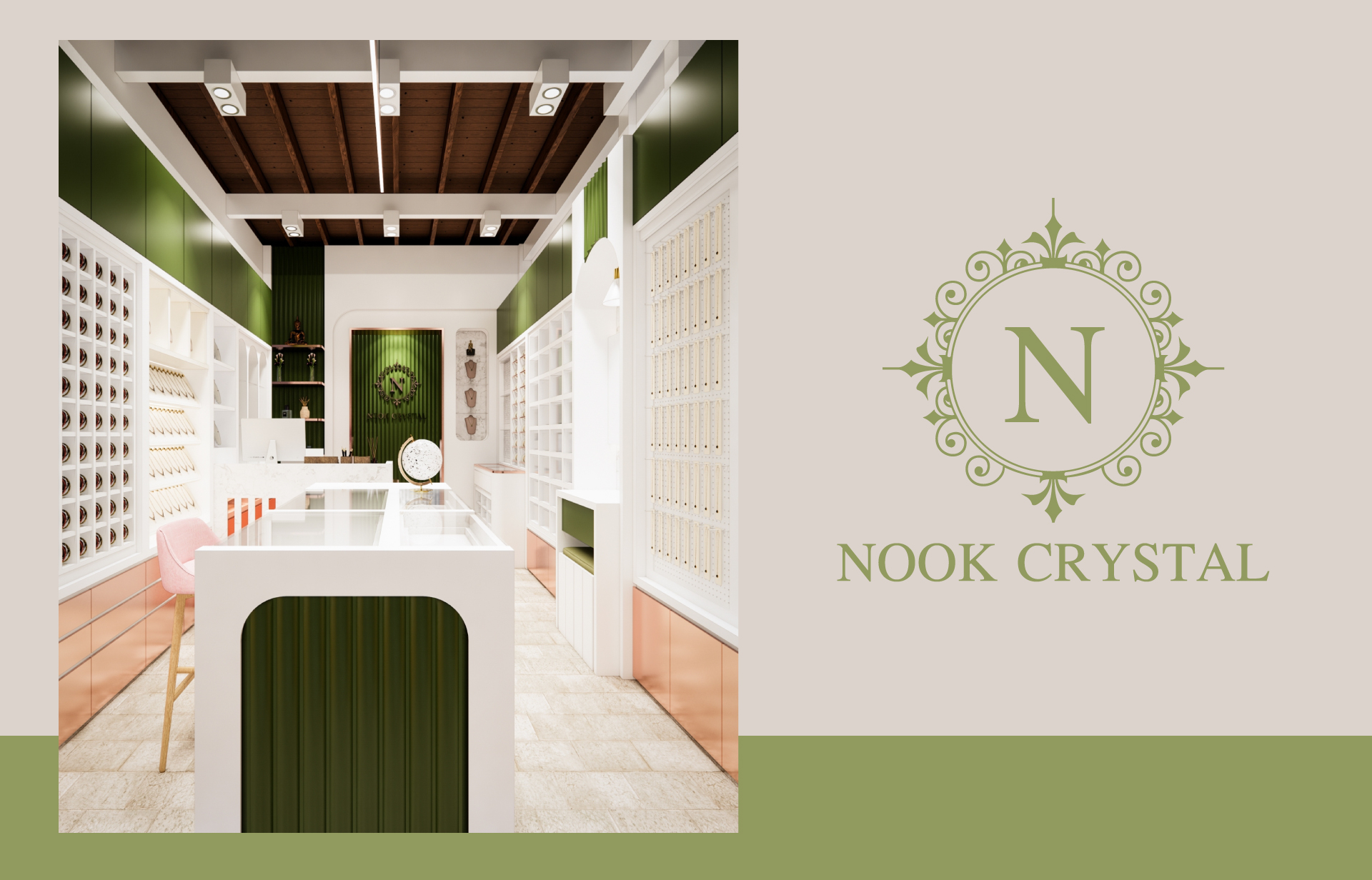 งานออกแบบ ร้านขายเครื่องประดับและอุปกรณ์ทำเครื่องประดับพรีเมี่ยม "Nook Crystal" ในพื้นที่ The Luenrit, Yaowarat Bangkok อาคารพาณิชย์ปรับปรุงใหม่ ที่เป็นอาคารเก่าแก่ตั้งแต่สมัย ร.5 โดยออกแบบชั้น 1 เป็นส่วนพื้นที่งานขาย และชั้นที่ 2 เป็นพื้นที่ทำงาน
