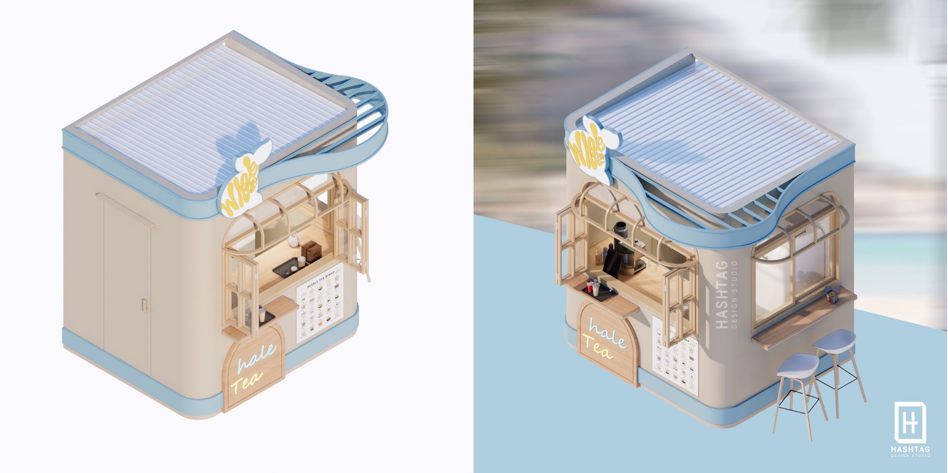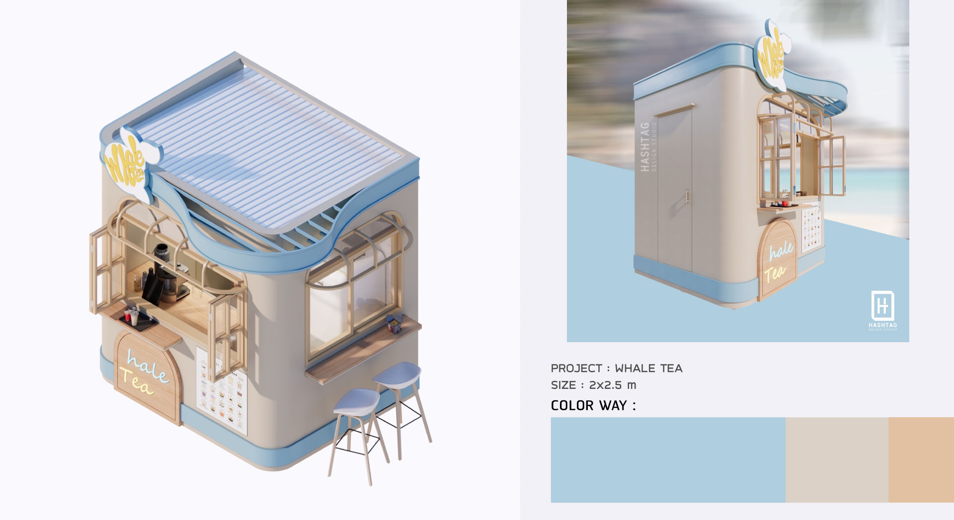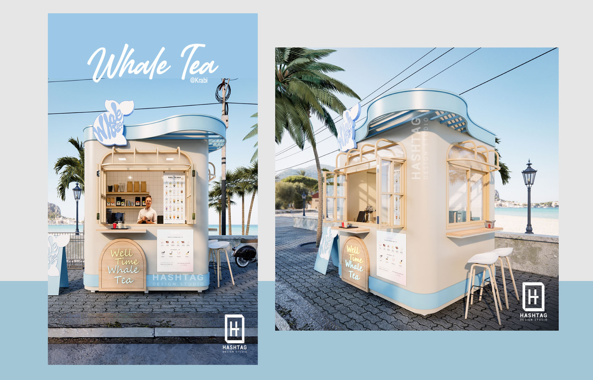 งานออกแบบคีออส Whale Tea ขายสินค้าประเภทชา ออกแบบโดยสื่อถึงภาพลักษณ์ของแบรนด์ ซึ่งมีทรงโค้งเพื่อสื่อถึงตัววาฬ และใช้โทนสีฟ้า ครีม มาเป็นสีหลักในการออกแบบ