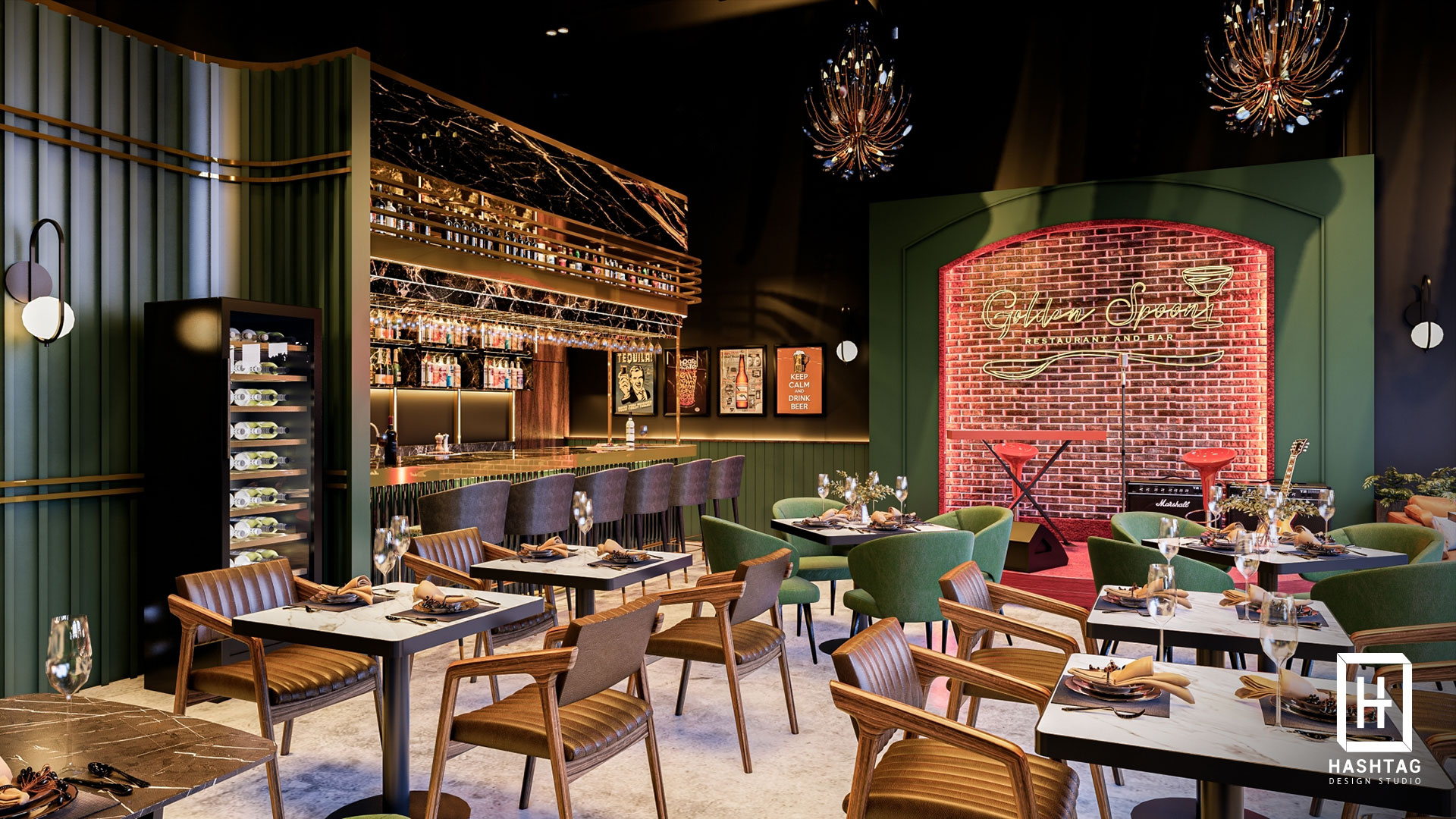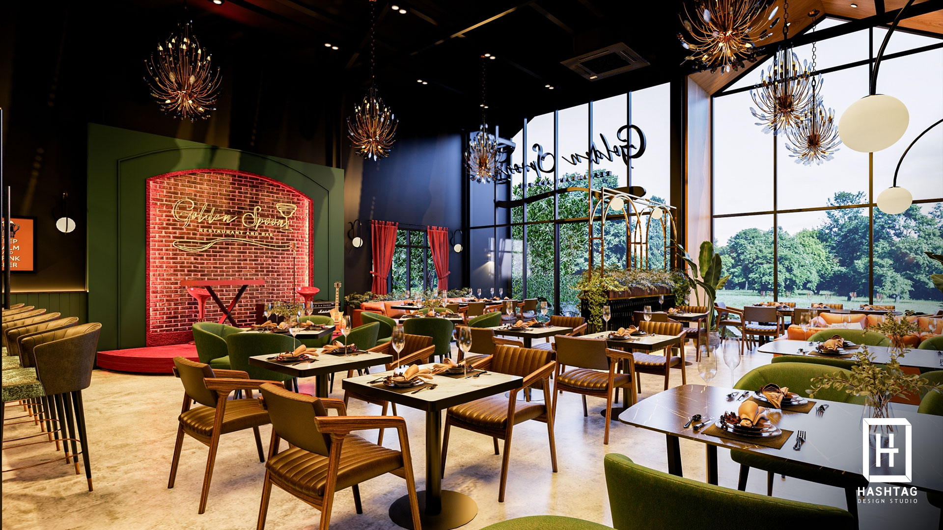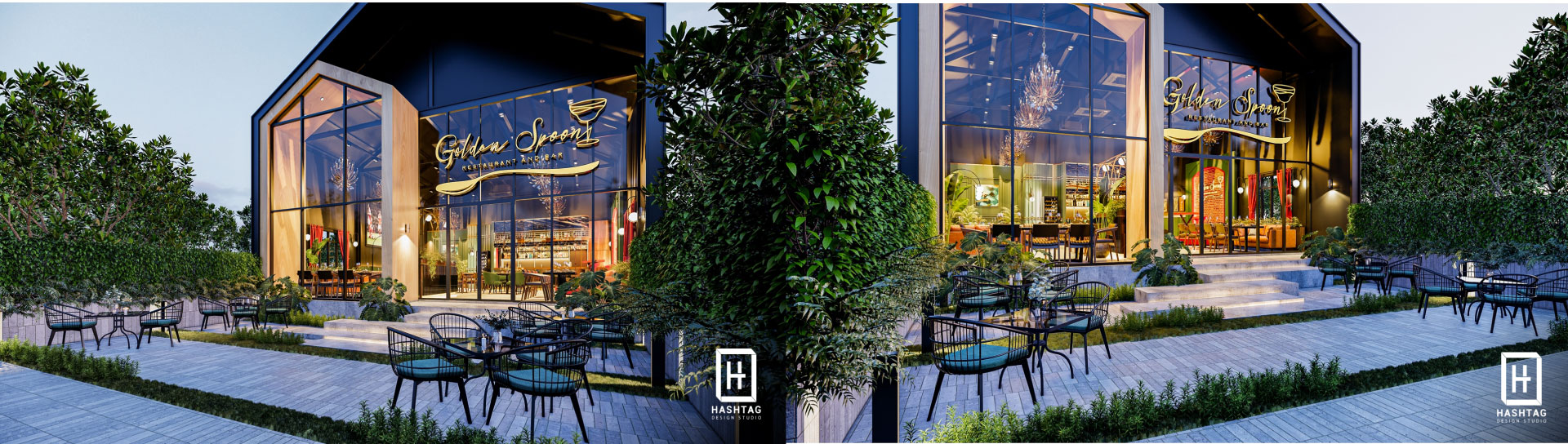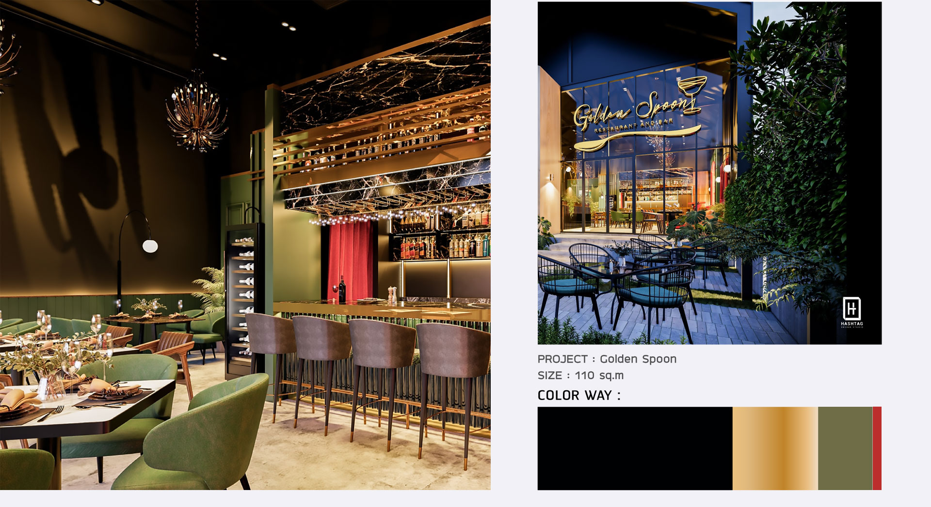 งานออกแบบร้าน "Golden Spoon" ร้านอาหารฟิวชั่น ทำเลตั้งโดดเด่นในย่านริมถนนราชพฤกษ์ นนทบุรี ขณะนี้กำลังอยู่ในขั้นตอนผลิตที่โรงงาน เตรียมเข้าติดตั้งที่หน้างาน โดยออกแบบภายในให้มีความเป็นเรโทร ใช้สีเขียว ดำ แดง ผสมกับความหรูหรา โดยใช้สีโทนทองเหมือนชื่อร้านมาตกแต่ง ผสมผสานให้มีความโดดเด่น ลงตัว ให้ร้านเป็นสถานที่รวบรวมความสุข และสนุกสนาน เหมาะกับการสังสรรค์พบปะเพื่อนฝูง