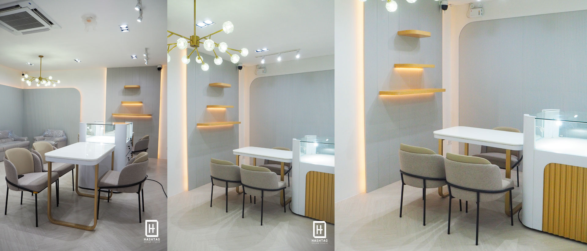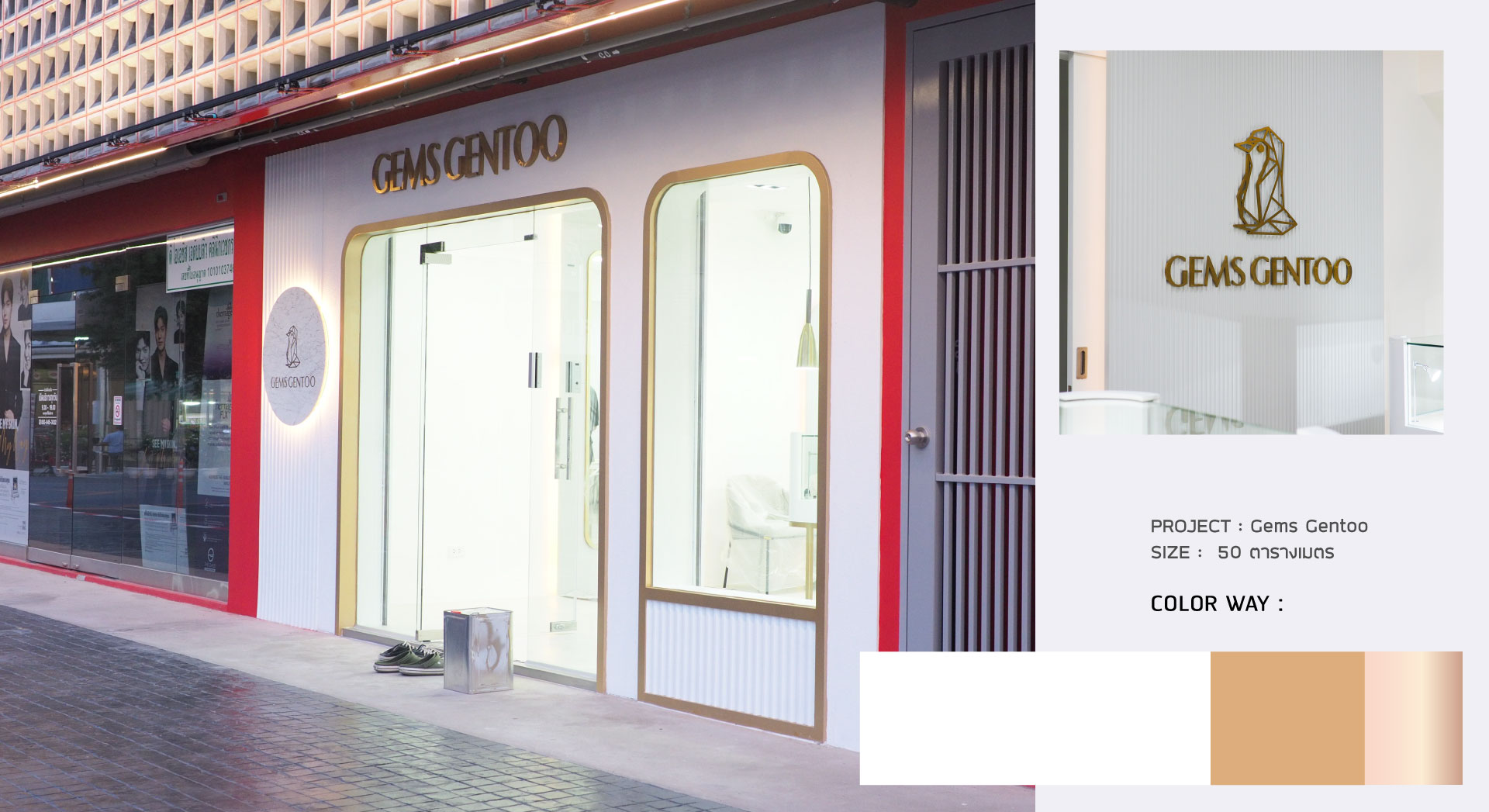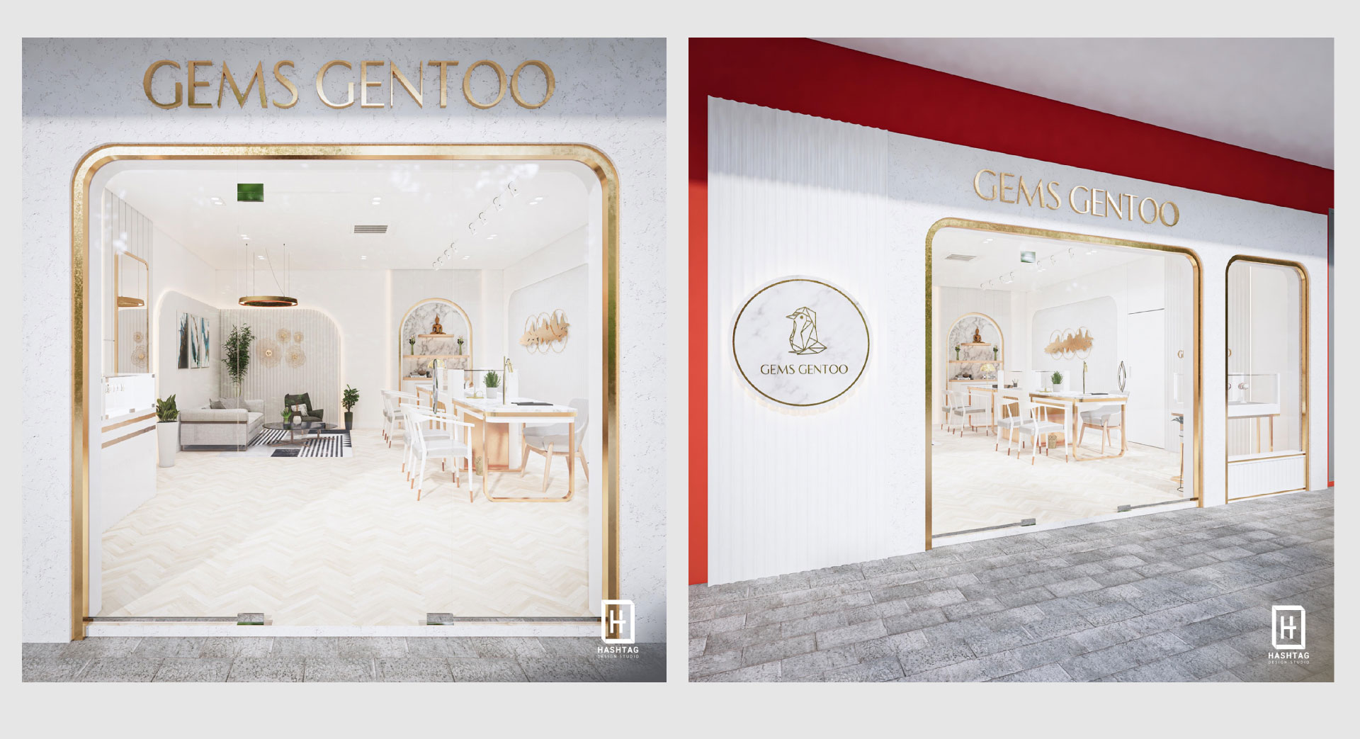 ส่งมอบงาน ร้าน "Gems Gentoo" เป็นที่เรียบร้อยแล้ว โดยออกแบบเป็นโทนขาวตัดกับทอง ด้านหน้าร้านเป็นประตูกระจกใส โดดเด่นด้วยโลโก้ร้านสีทอง มองเห็นในร้านได้อย่างชัดเจน เน้นโทนสว่าง สบายตา ลูกค้าที่เข้ามาใช้บริการ ไม่รู้สึกอึดอัด โดยมีโซนโต๊ะสำหรับนั่งคุย ตู้โชว์สินค้าตัวอย่าง มุมโซฟา โซนกั้นผนังเพื่อแบ่งหลังร้านเป็นพื้นที่ใช้สอยอื่นๆ