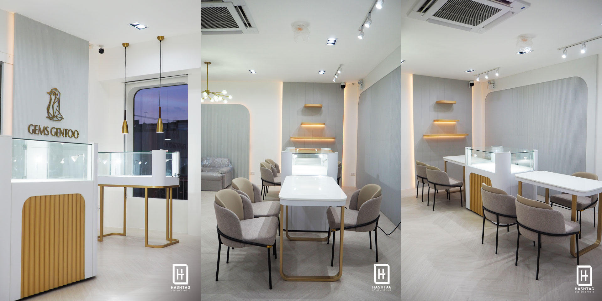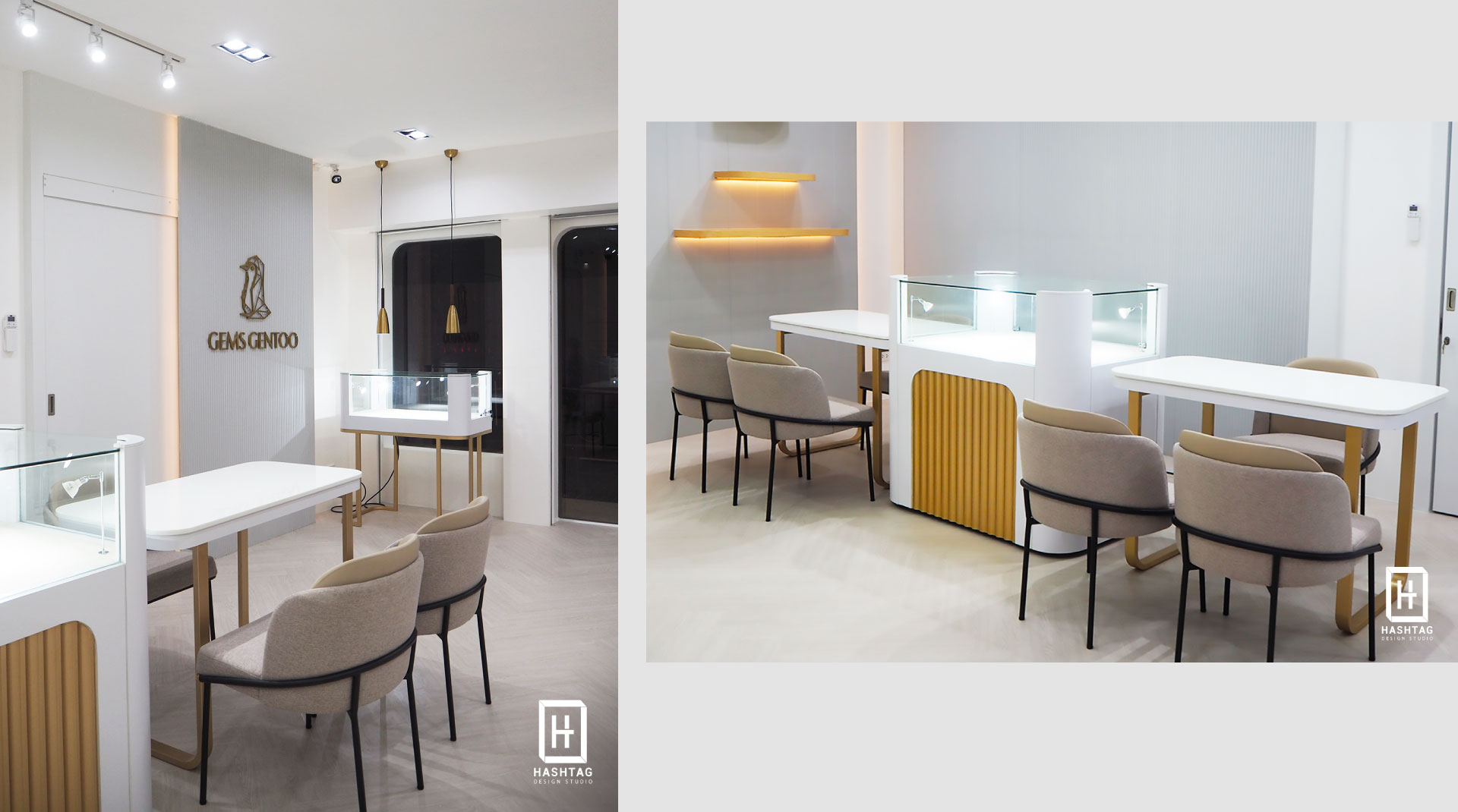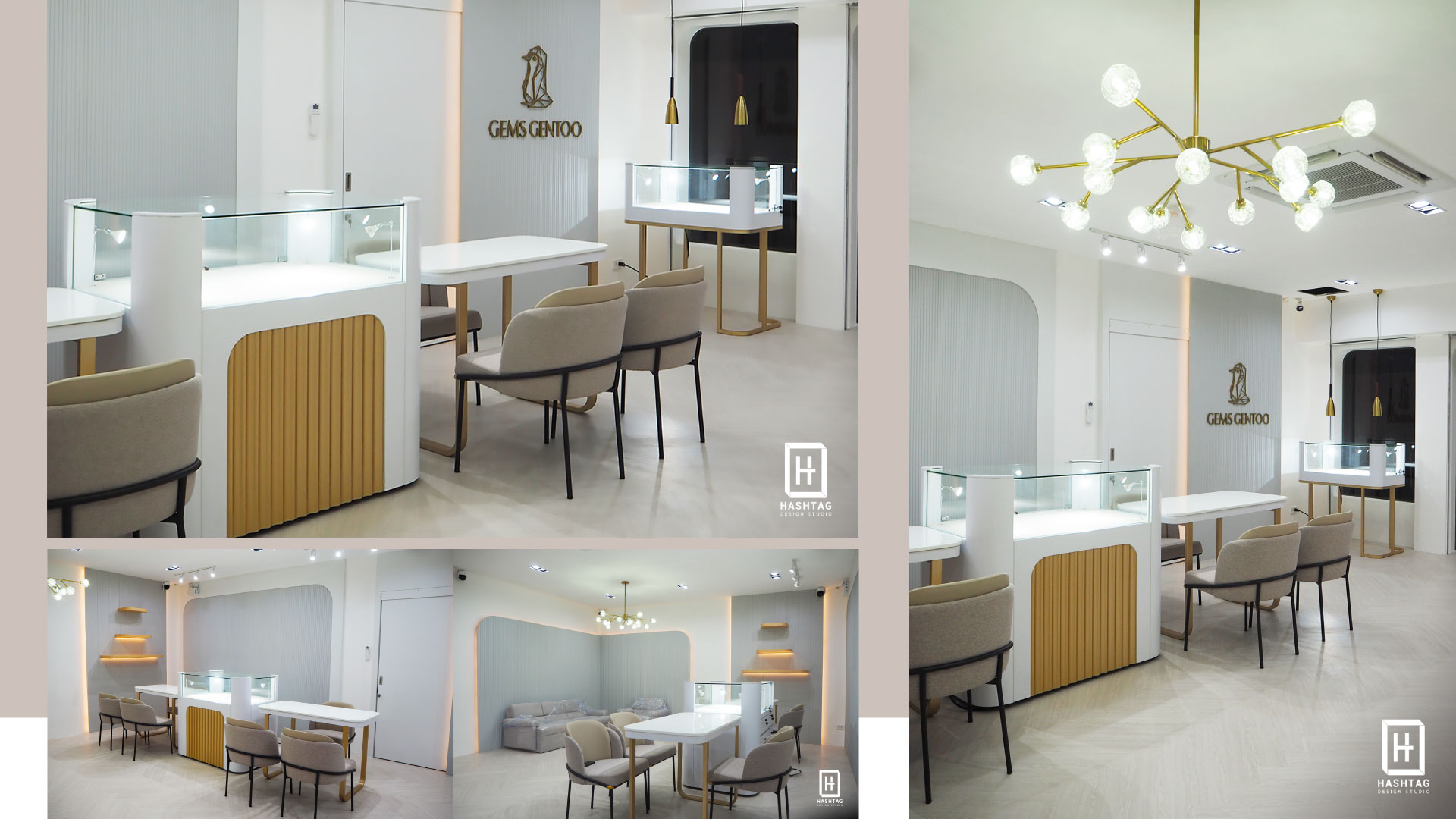 งานออกแบบร้านอัญมณี "Gemsgentoo” ออกแบบเป็นโทนขาวตัดกับทอง ด้านหน้าร้านเป็นประตูกระจกใส โดดเด่นด้วยโลโก้ร้านสีทอง มองเห็นในร้านได้อย่างชัดเจน เน้นโทนสว่าง สบายตา ลูกค้าที่เข้ามาใช้บริการ ไม่รู้สึกอึดอัด โดยมีโซนโต๊ะสำหรับนั่งคุย ตู้โชว์สินค้าตามมุมต่างๆ โซนต้อนรับลูกค้ามุมโซฟา โซนกั้นผนังเพื่อแบ่งหลังร้านเป็นพื้นที่ทานข้าว