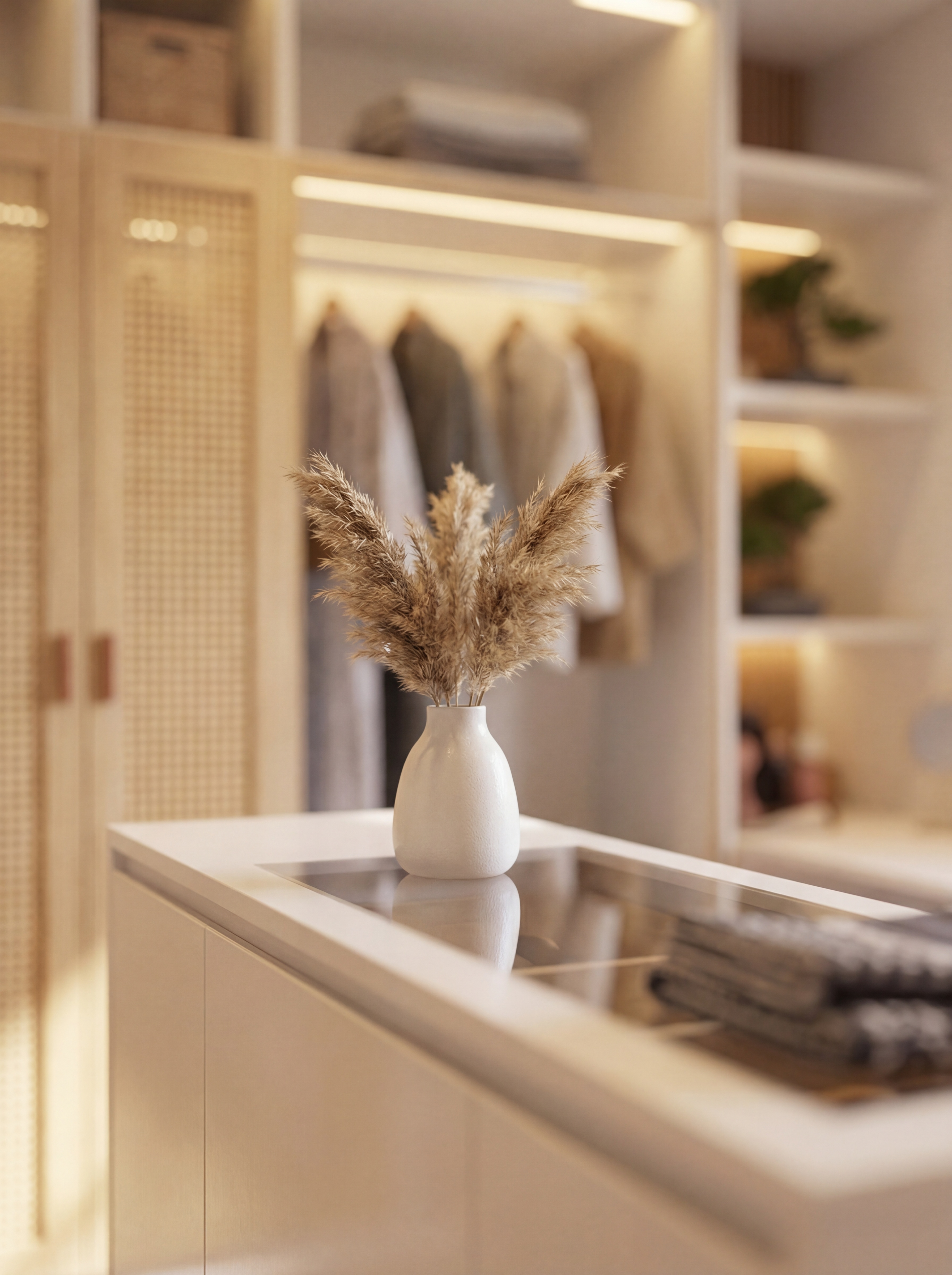 งานออกแบบรีโนเวทห้องนอน โดยใช้ 2 ห้อง ทุบผนังเพื่อแบ่งโซนระหว่างห้องนอนและห้องแต่งตัว มีพื้นที่สำหรับนั่งทำงาน และพื้นที่เก็บของอย่างเป็นสัดส่วน