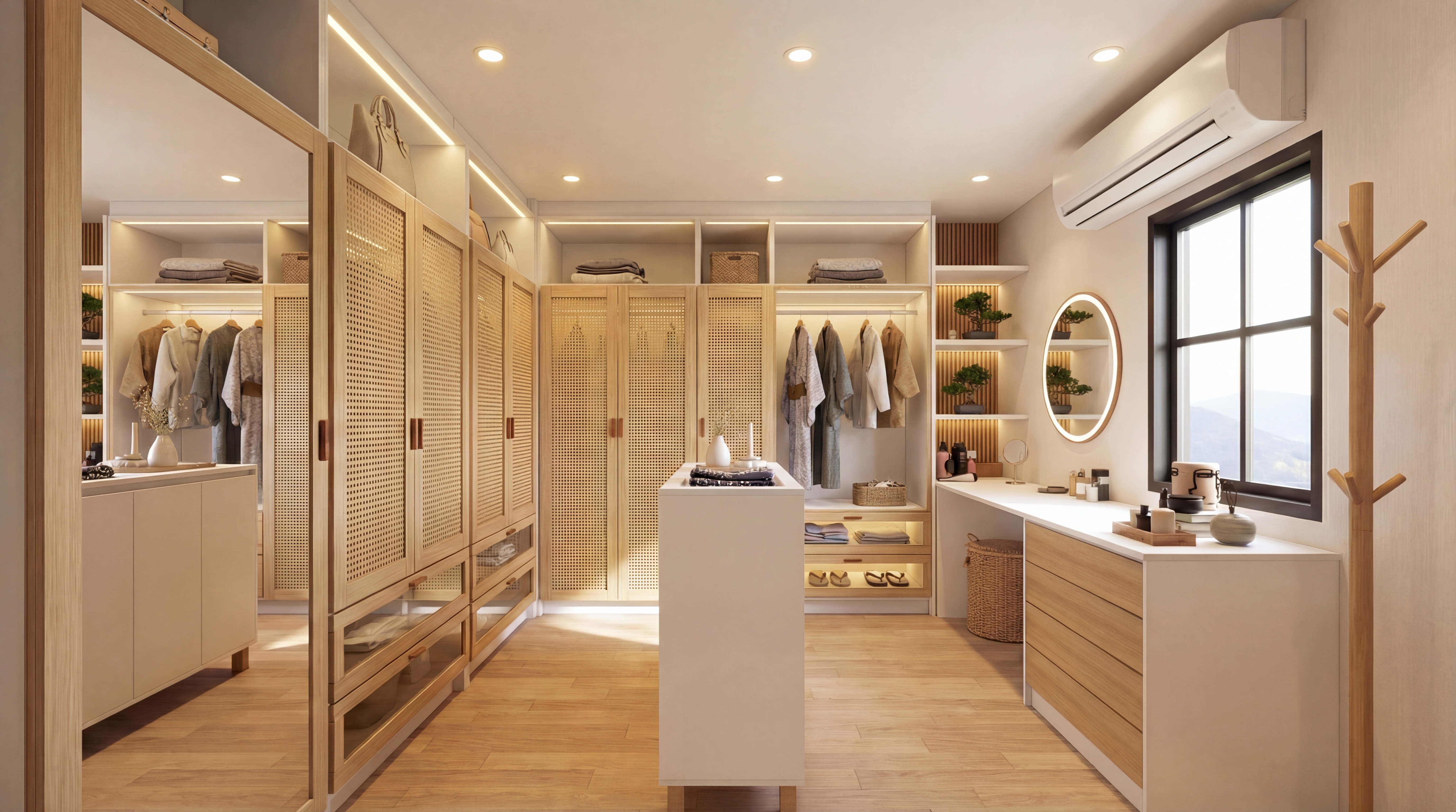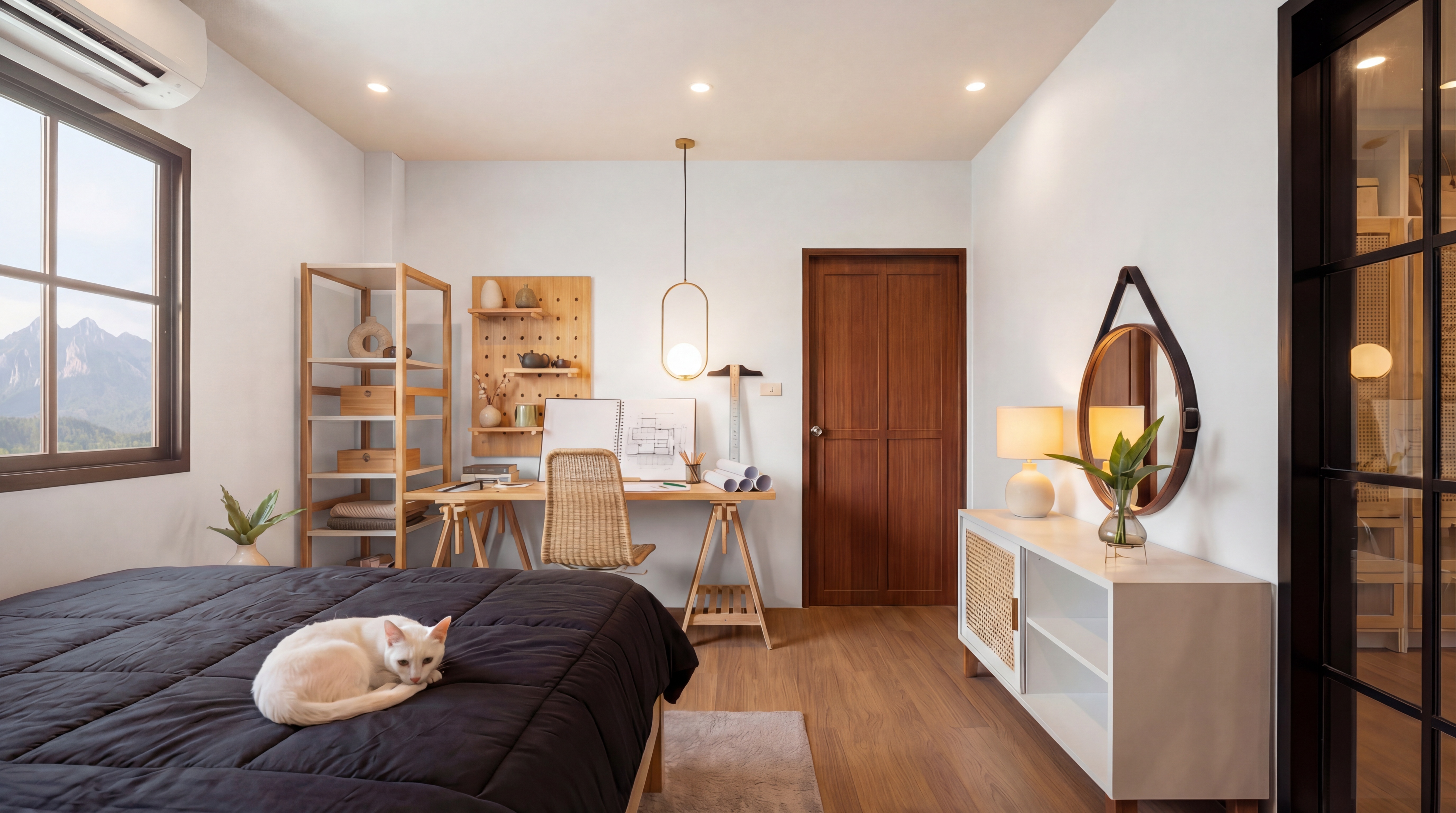 งานออกแบบรีโนเวทห้องนอน โดยใช้ 2 ห้อง ทุบผนังเพื่อแบ่งโซนระหว่างห้องนอนและห้องแต่งตัว มีพื้นที่สำหรับนั่งทำงาน และพื้นที่เก็บของอย่างเป็นสัดส่วน
