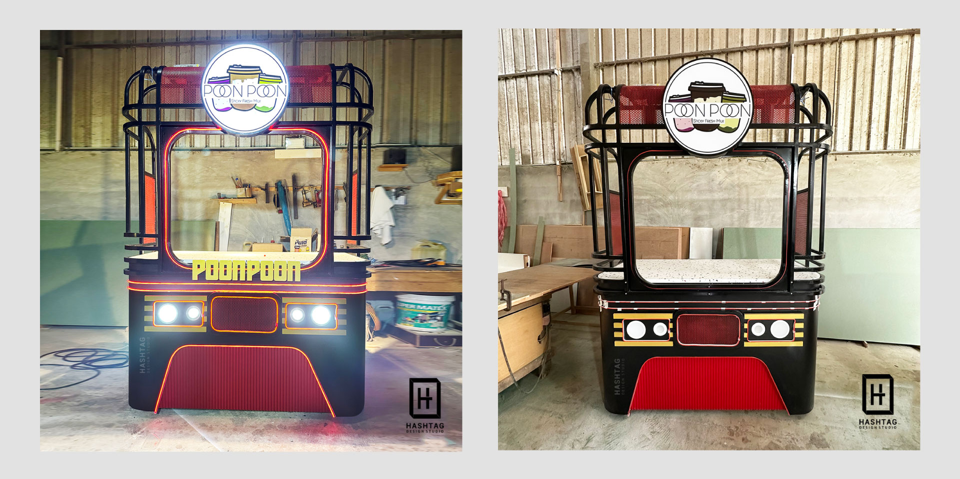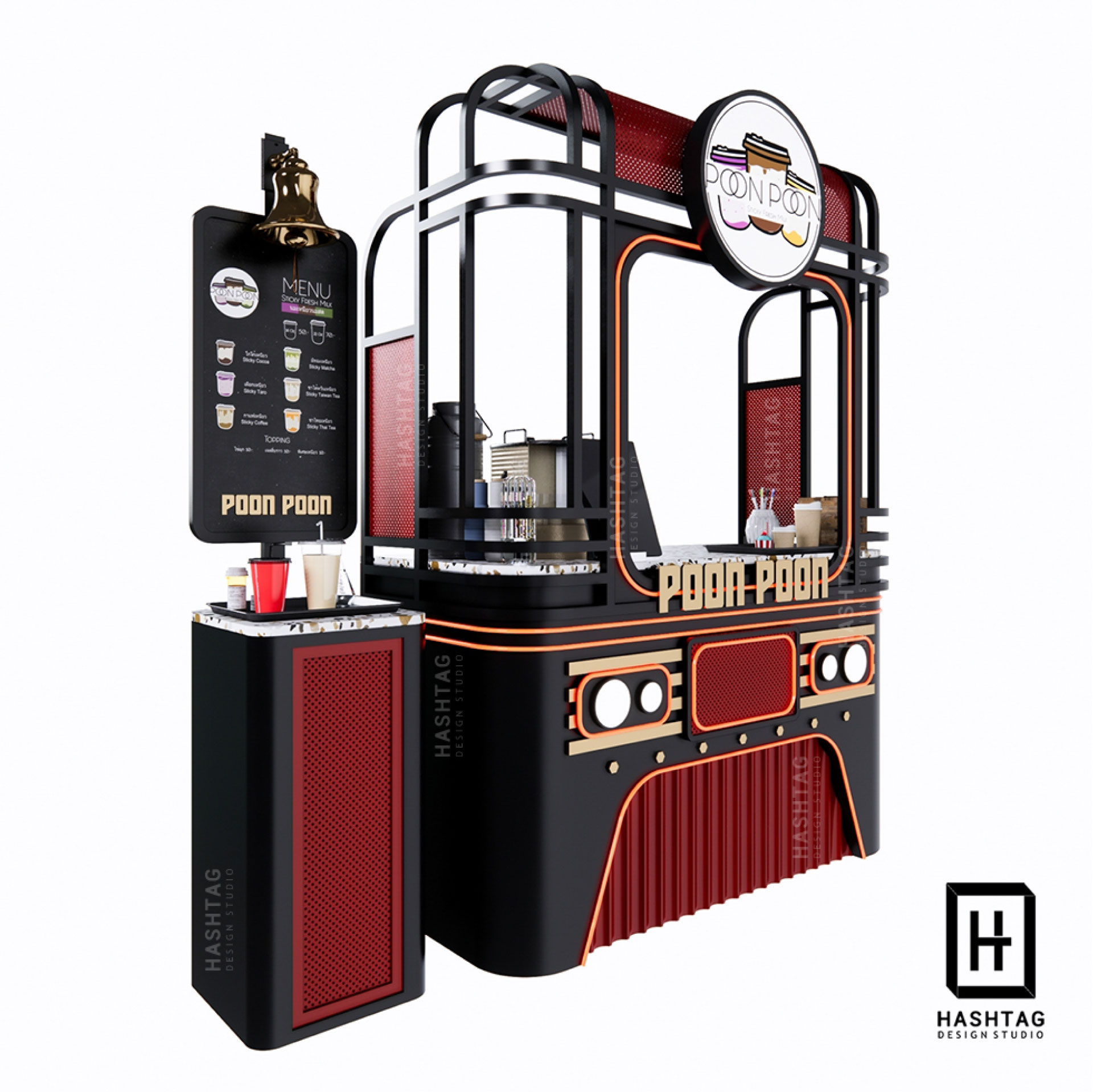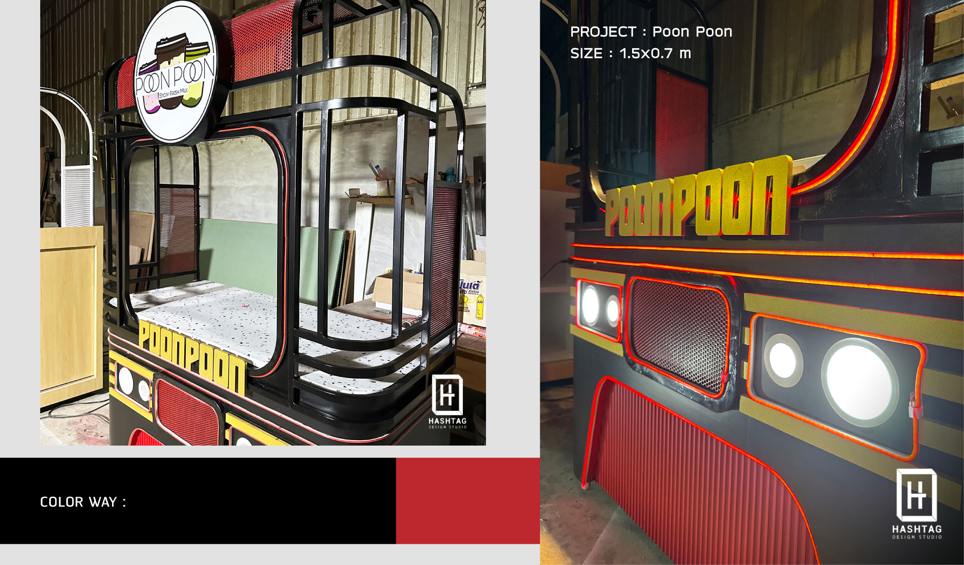 งานออกแบบพร้อมผลิต เคาน์เตอร์ขายเครื่องดื่ม ร้าน Poon Poon ชื่อร้านที่บ่งบอกถึง reference ในการออกแบบได้เป็นอย่างดี การออกแบบได้รับแรงบันดาลใจมาจากรถไฟ โทนสีดำ แดง เพิ่มลูกเล่นโดยใช้แสงไฟเข้ามาช่วยเพิ่มจุดเด่น