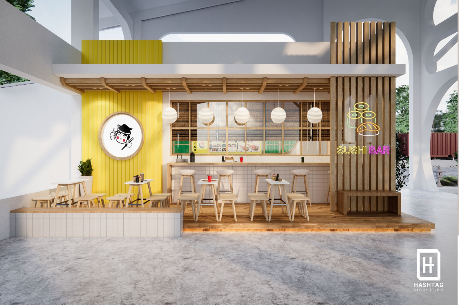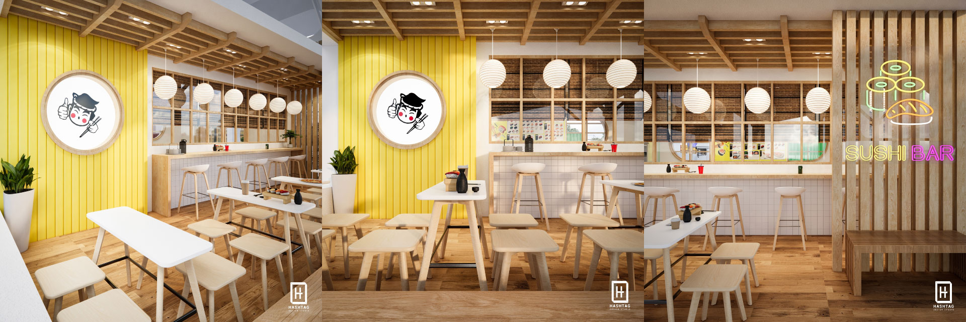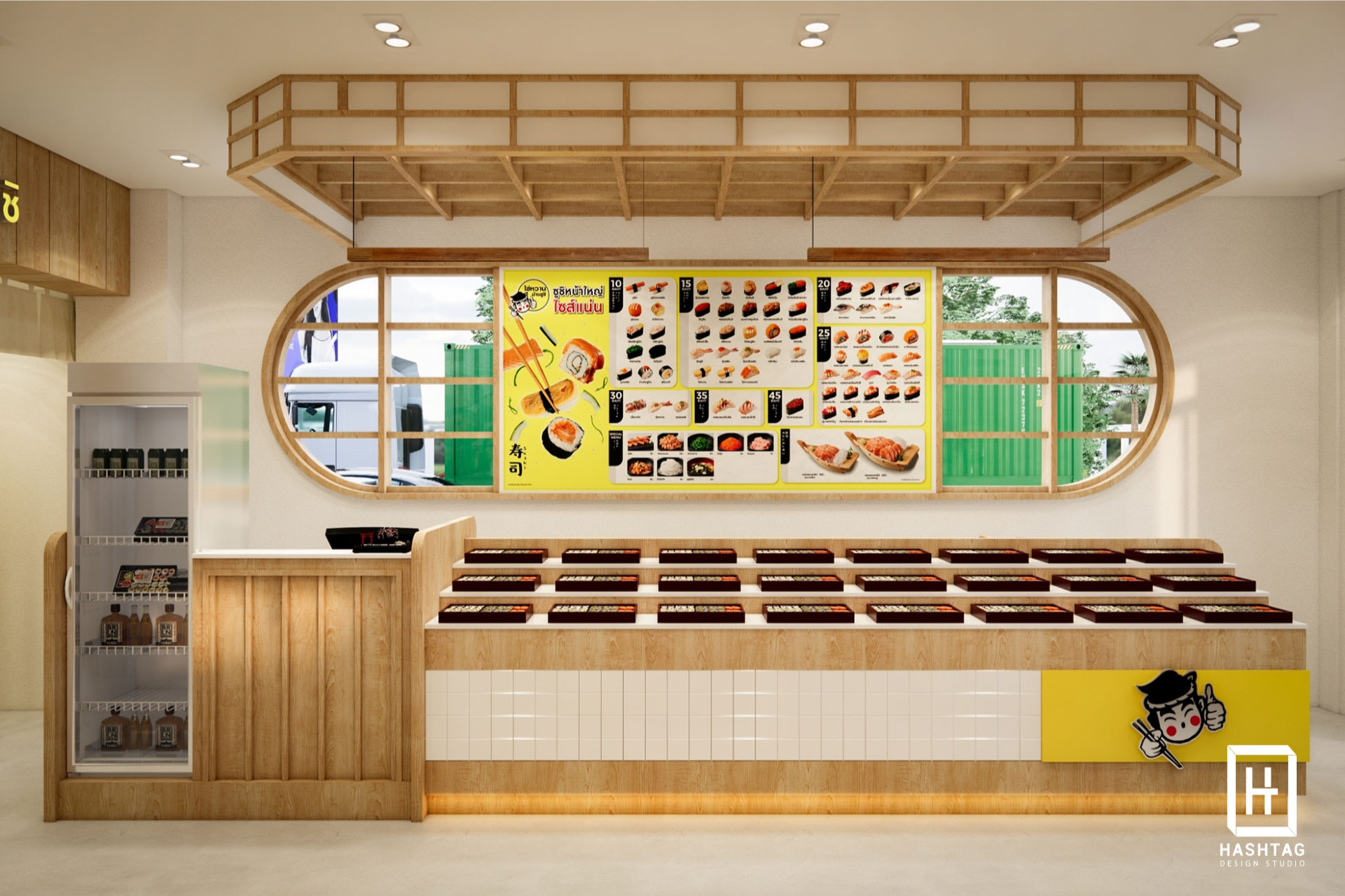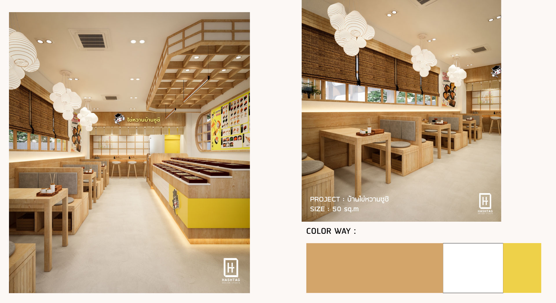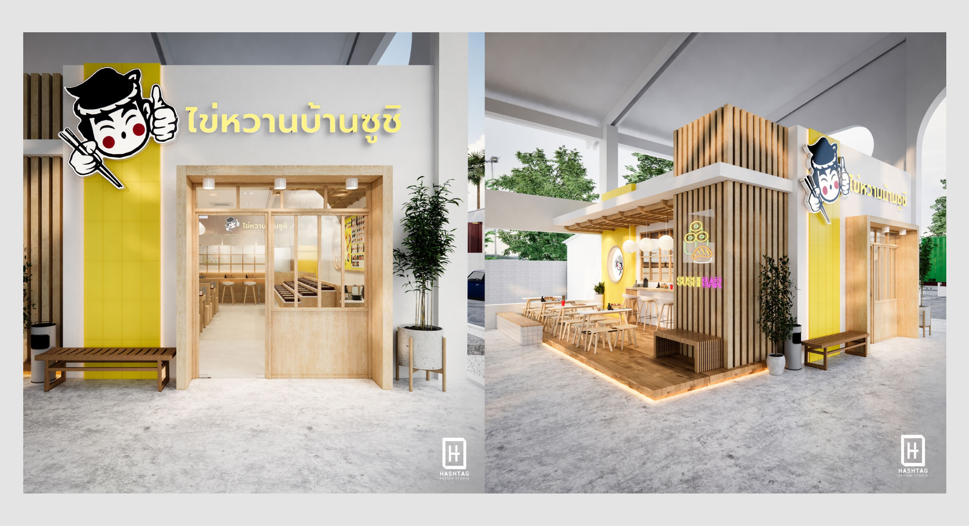 งานออกแบบร้าน ไข่หวานบ้านซูชิ พื้นที่เป็นกึ่งเอาท์ดอร์ โดยออกแบบร้านให้เป็นสไตล์ญี่ปุ่น ใช้โทนสีเหลืองซึ่งเป็นโทนสีหลักของแบรนด์ มาจับคู่กับโทนขาวและไม้เพื่อให้มีกลิ่นอายญี่ปุ่น ภายในร้านออกแบบให้มีโซนคิดเงิน โซนบาร์ซูชิ โซนนั่งทานสำหรับมาคนเดียวจนถึงมาทั้งครอบครัว ลูกค้าสามารถเลือกนั่งทานได้ทั้งในร้านและนอกร้าน