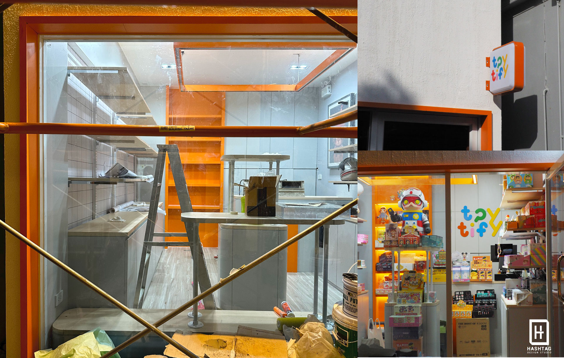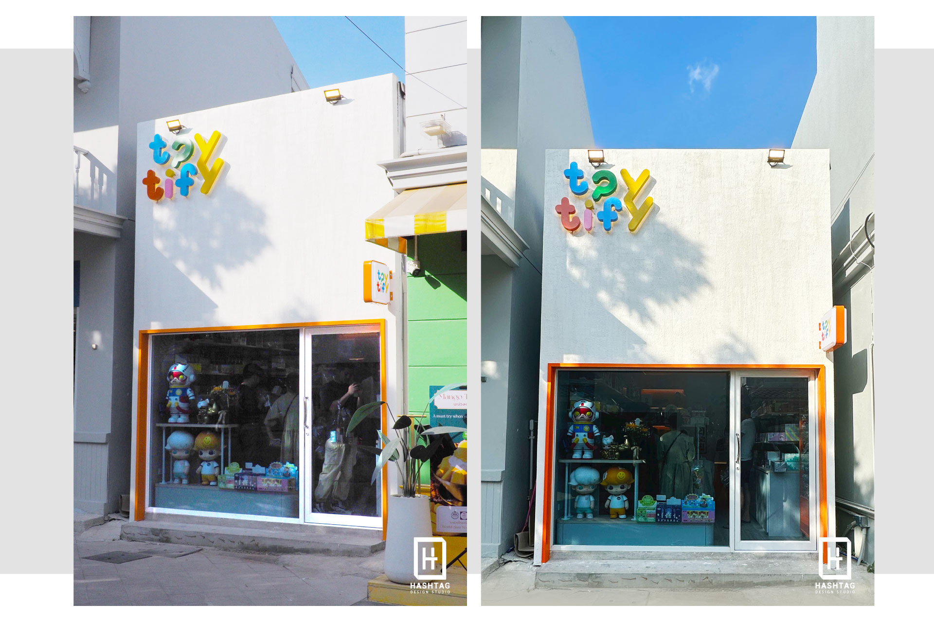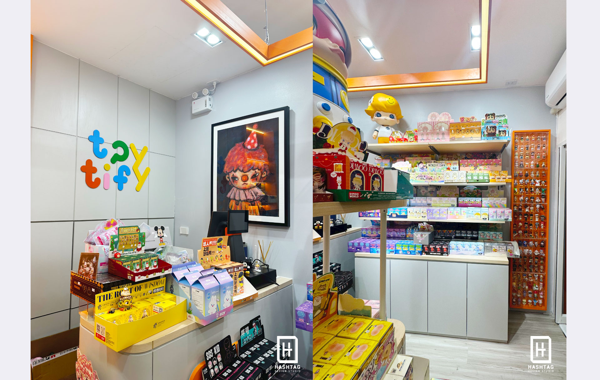 งานออกแบบและผลิตร้าน "Toytify" ร้านกล่องสุ่ม & Art toy ในย่านราชพฤกษ์ เนื่องจากพื้นที่ที่จำกัด ทางเราออกแบบให้ทุกพื้นที่สามารถใช้ประโยชน์ได้มากที่สุด ให้มีพื้นที่ตั้งโชว์สินค้าหน้าร้าน มีชั้นวางสินค้าแบบเต็มพื้นที่ มีเคาน์เตอร์คิดเงิน ด้านหลังมีผนังตกแต่งด้วยโลโก้ร้าน ซ่อนตู้เก็บของด้านใน ภายนอกออกแบบเป็นกรอบสีขาวสูงแบบมินิมอลเพื่อให้ตัดกันกับสีโลโก้ร้าน