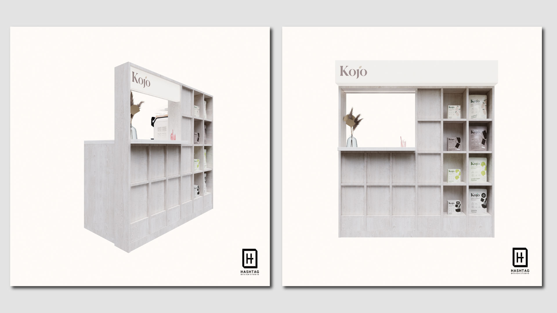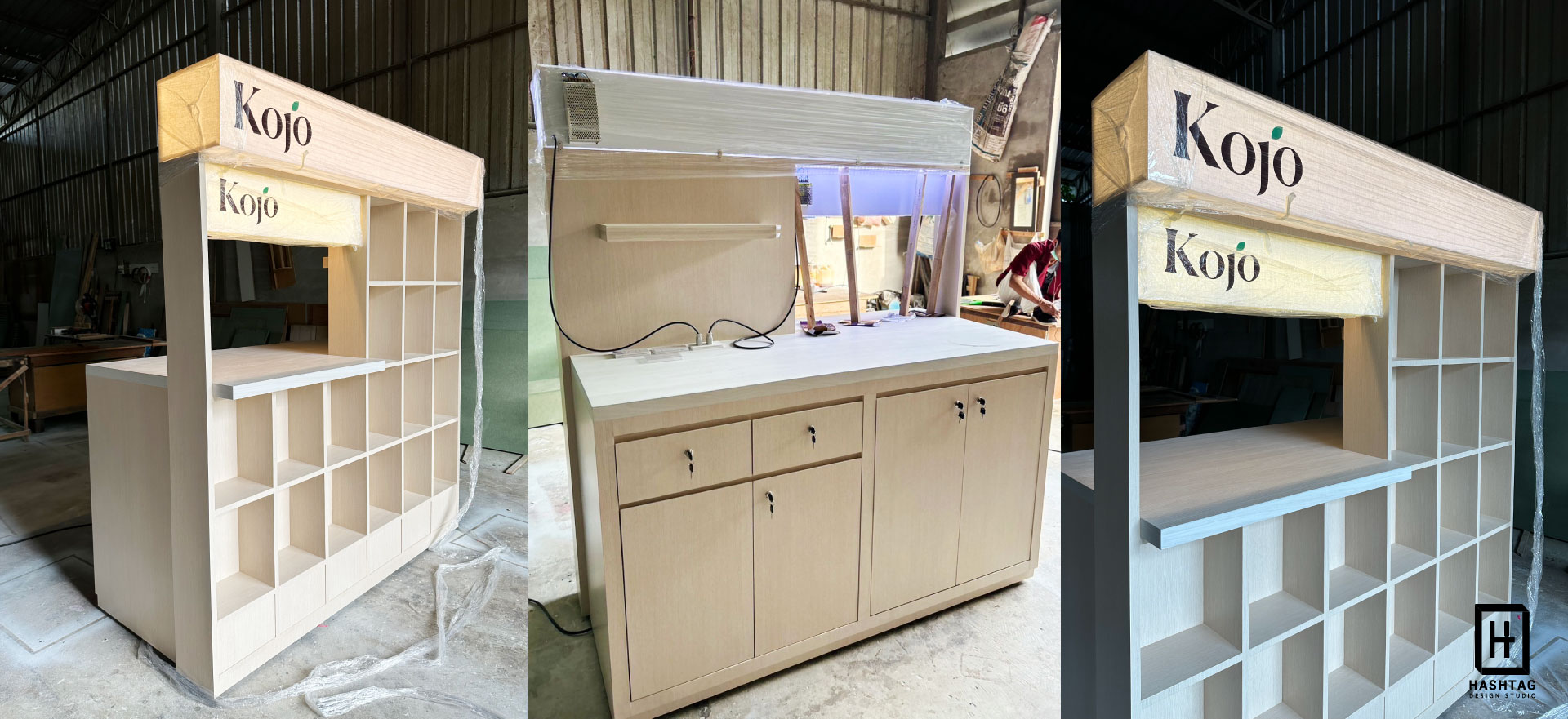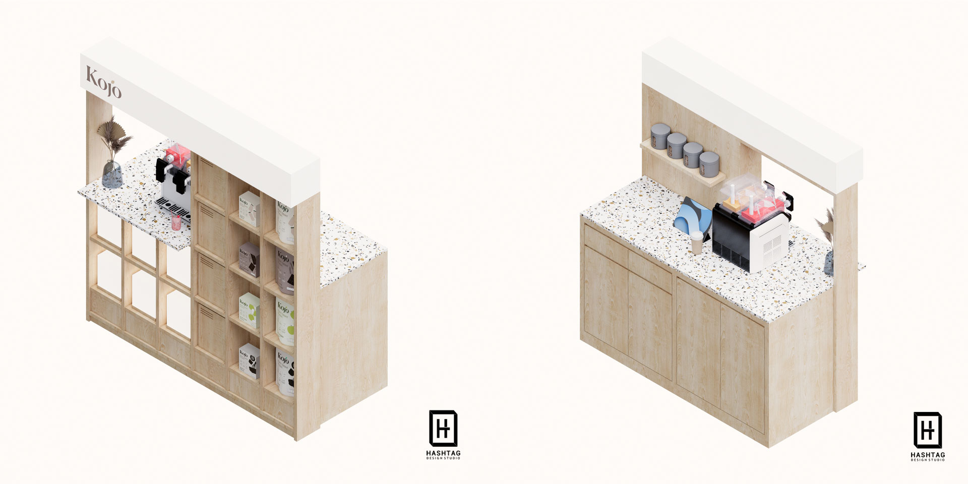 งานออกแบบเคาน์เตอร์ "Kojo" โดยออกแบบเป็น 2 โทน เป็นเคาน์เตอร์สำหรับวางสินค้าชงชิม ตัวเคาน์เตอร์ดีไซน์วางป้าย 2 แบบ ถอดประกอบได้