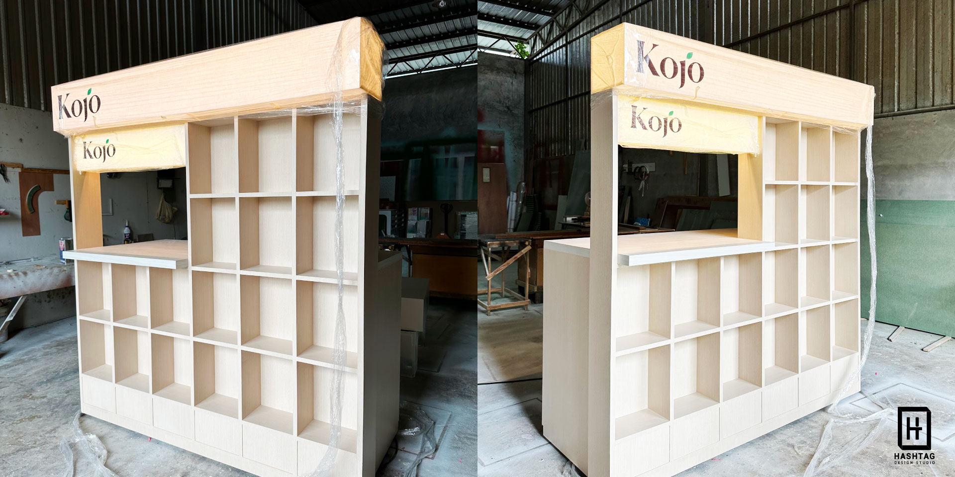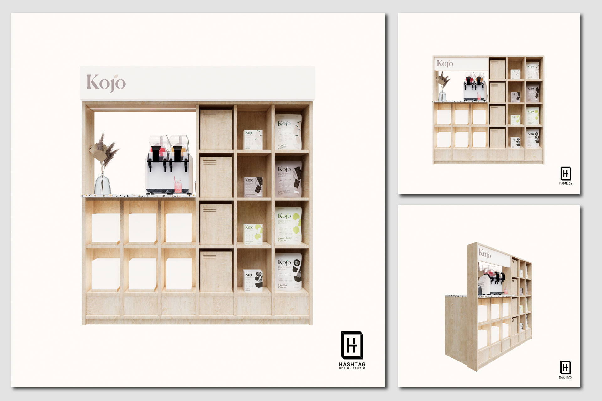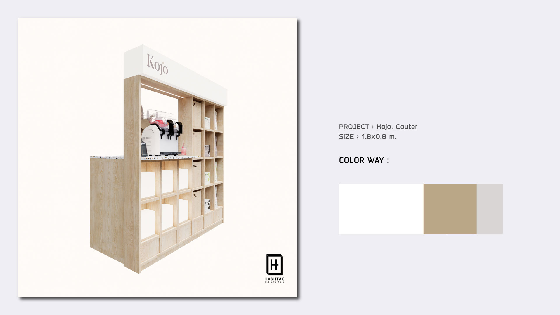 งานออกแบบเคาน์เตอร์ "Kojo" โดยออกแบบเป็น 2 โทน เป็นเคาน์เตอร์สำหรับวางสินค้าชงชิม ตัวเคาน์เตอร์ดีไซน์วางป้าย 2 แบบ ถอดประกอบได้